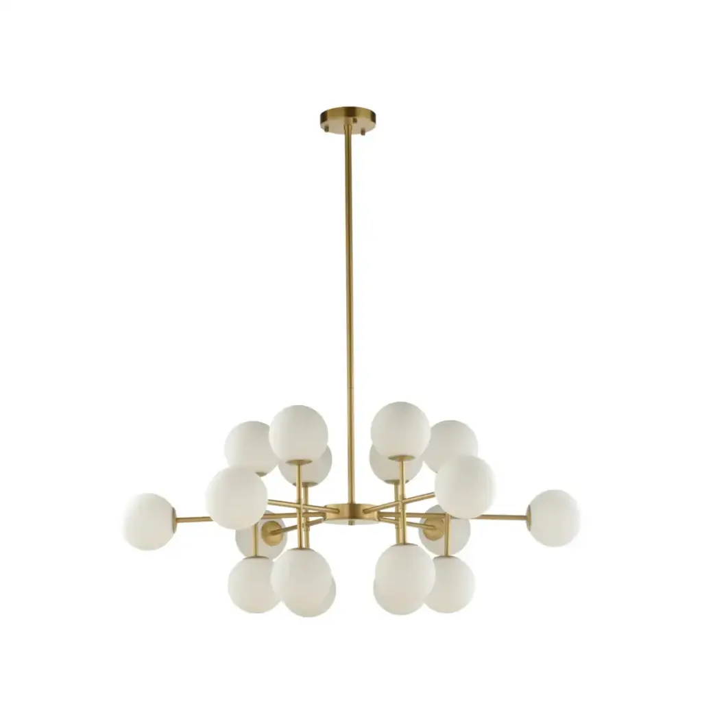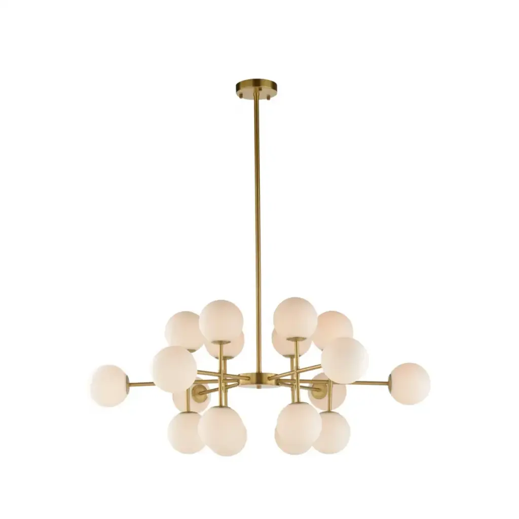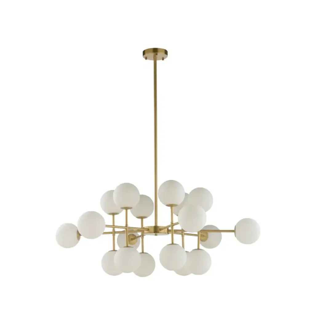The Rue Saint-Anne Chandelier is a stunning centerpiece that combines mid-century modern design with a touch of vintage sophistication. Featuring an array of milk glass globes branching out from an antique brass frame, this chandelier radiates a soft, warm light that adds a luxurious glow to any room. Its geometric arrangement of globes creates a striking visual impact, making it the perfect statement piece for living spaces, dining rooms, or grand entryways. Comes with 1', 2' and 3' rods.
