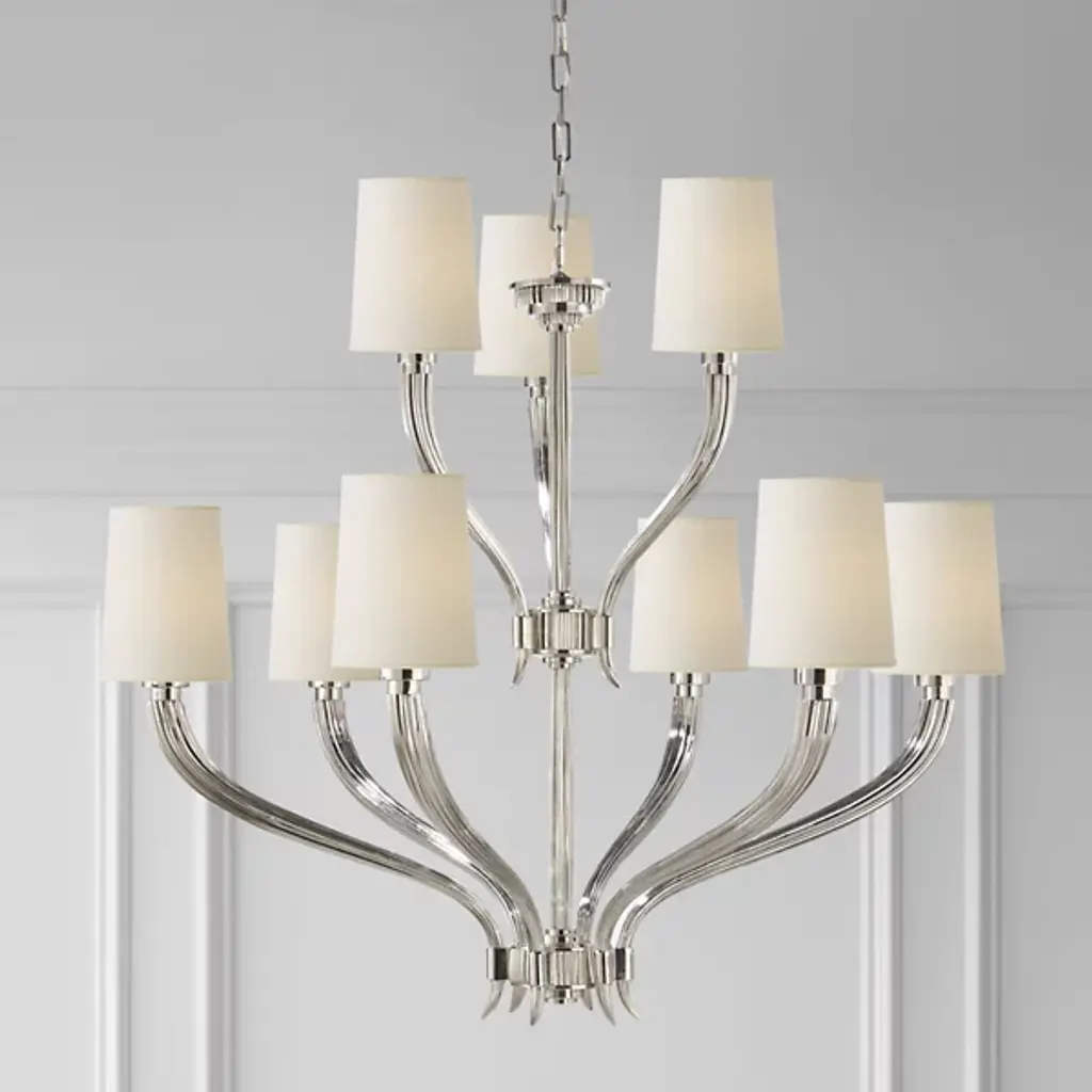 The Ruhlmann 2 Tier Chandelier by Visual Comfort Signature, formerly known as Visual Comfort, has 9 elegant arms that are detailed with gentle ridges to create an attractive sparkle. Topped with Natural Paper shades to evenly diffuse the light, this chandelier is resplendently radiant. With its subtle curves and light-catching metallic finish, the Ruhlmann 2 Tier Chandelier is beauty and grace.