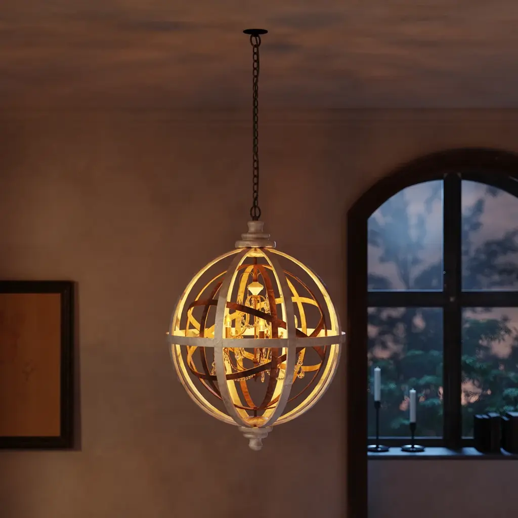 Bold and unique, this 3-light chandelier combines weathered wood, metal in rust, and crystals for a perfect mix of rustic and industrial styles. A pristine wooden globe encasing a metal orb in rust houses a scroll metal frame accented with crystals in a central display. The distressed and rust finish enhances the old aging appearance. When lit, it creates a warm, soothing space and clear crystals add a hint of glam. Used singly or in multiple, it looks fabulous over your kitchen island and dining table or in the living room and bedrooms.