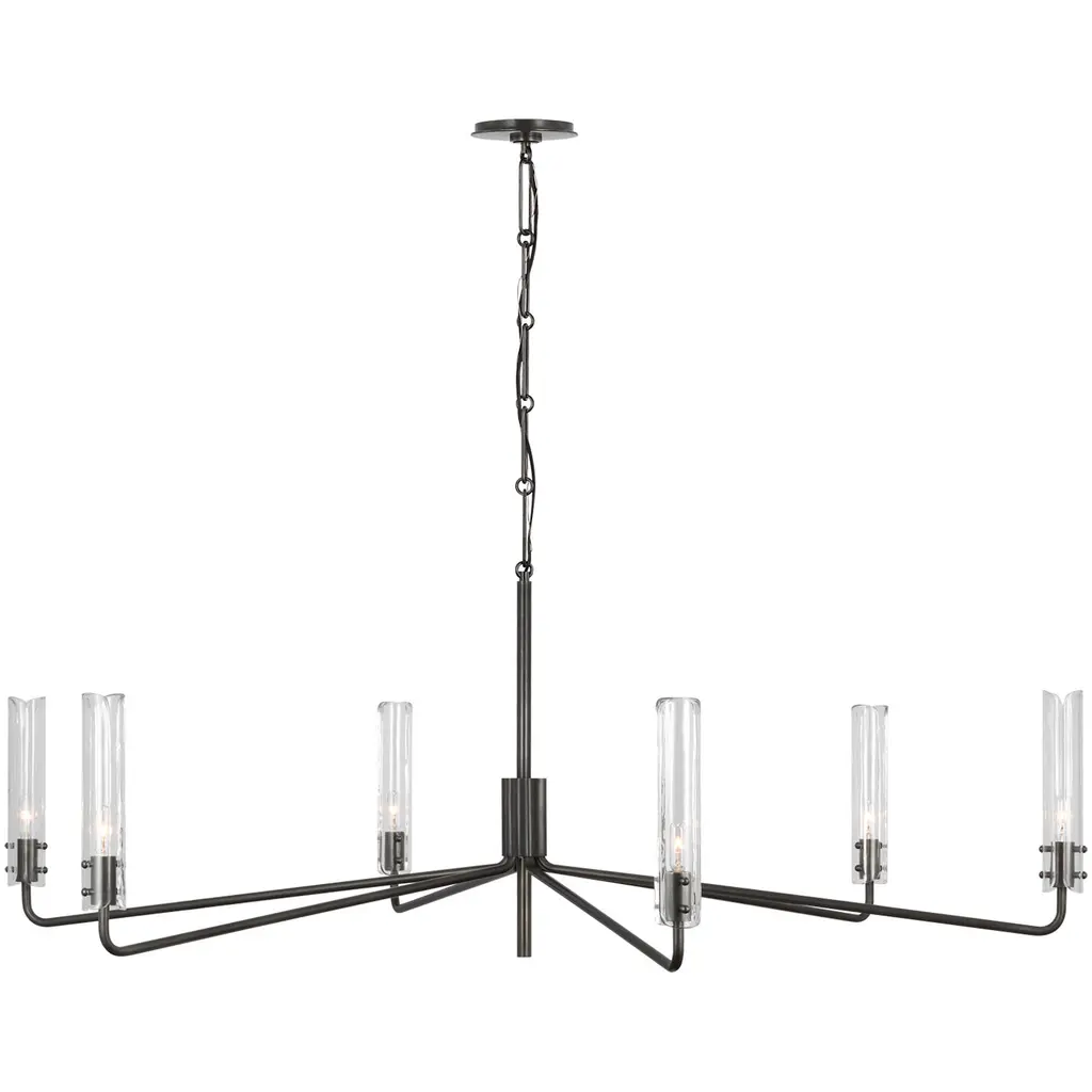 A versatile stunner, Ryden‘s elongated, clear glass shades envelop its bulbs, held by heavy cast prongs and ribbed details. Black, fabric-wrapped cords perfectly complement Heritage Brass, Black, and Brushed Nickel finishes.