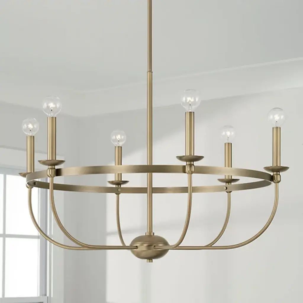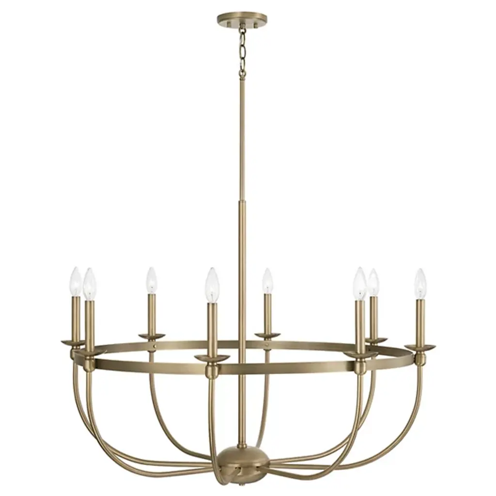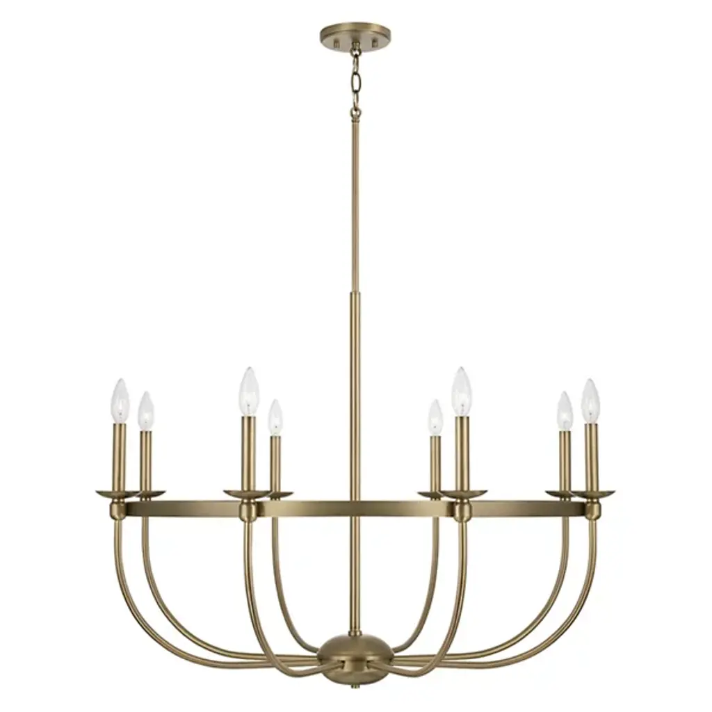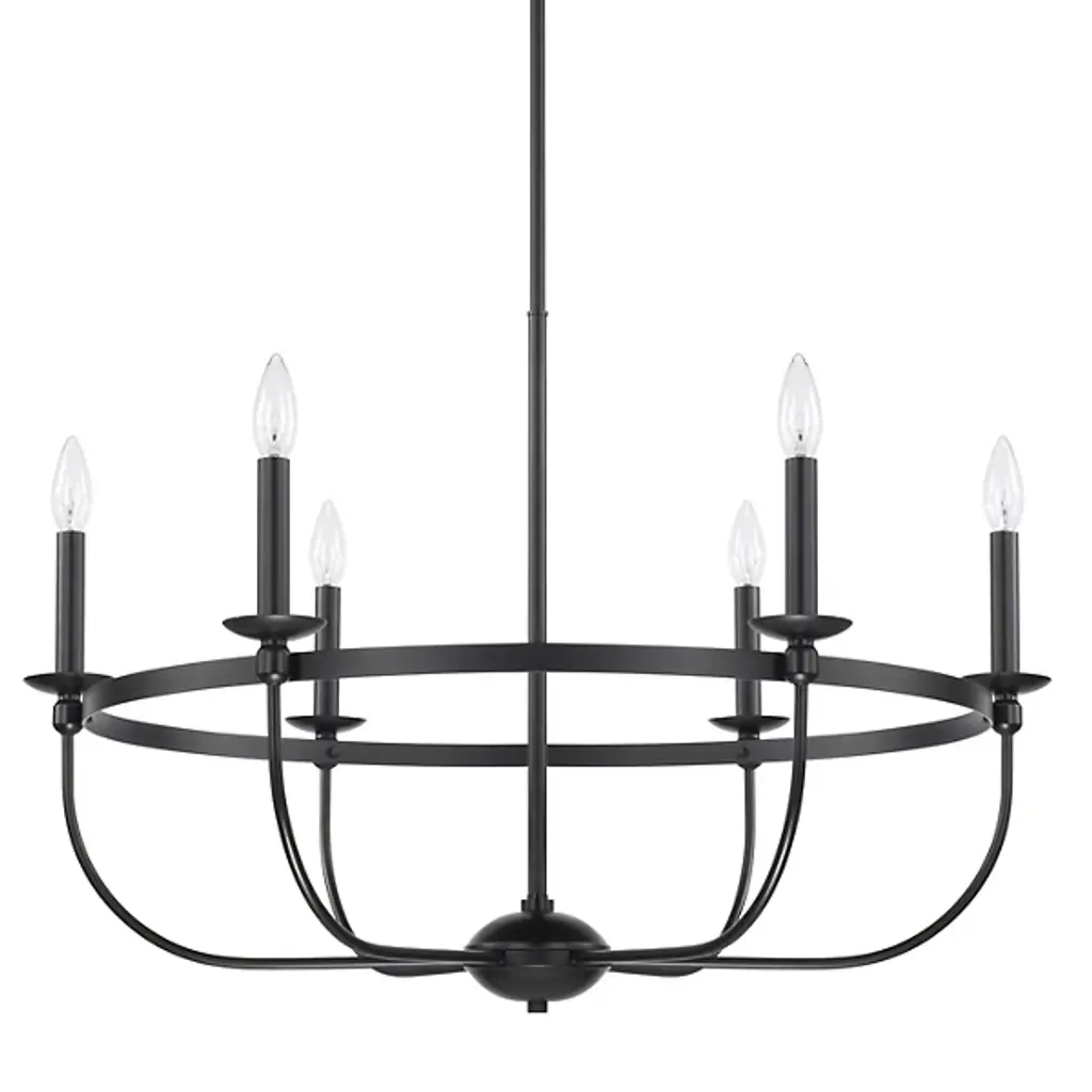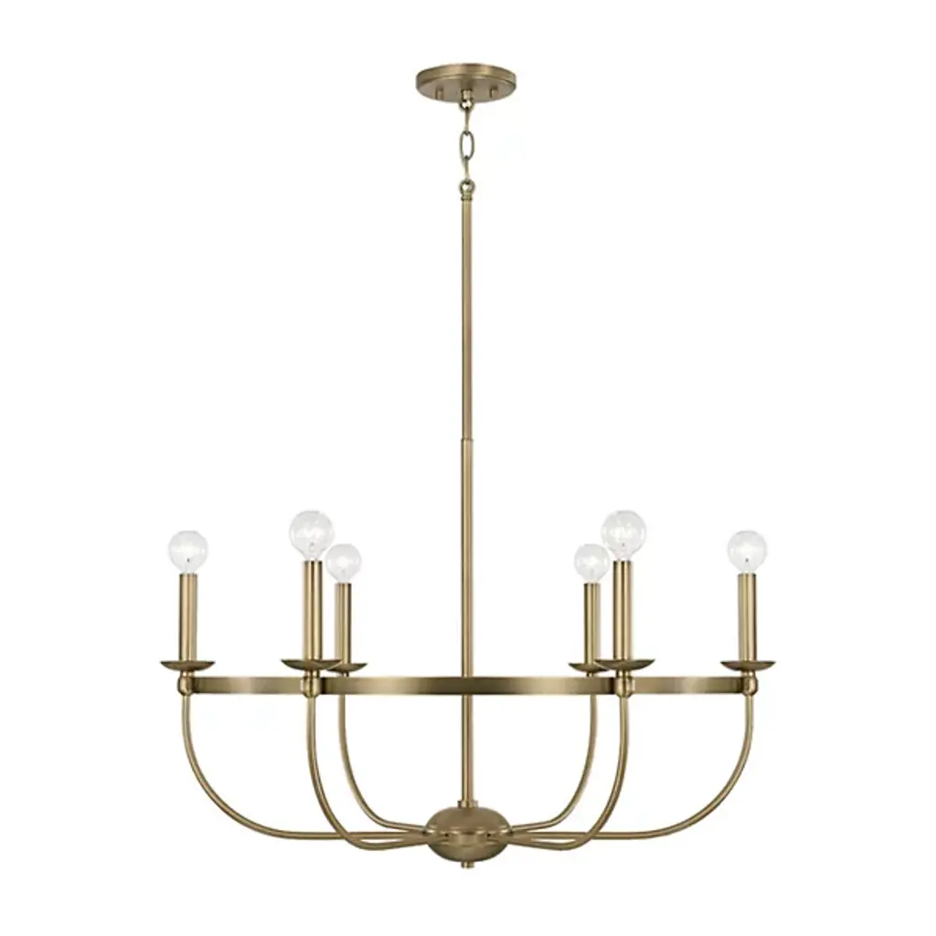 Bask in the light of the retro-minimalist Rylann Chandelier by Capital Lighting. A telescoping cylindrical stem drops from the ceiling, ending in a hub extending curving branches that swoop up to connecting points on the outside edge of a slim hoop. Candelabra-style socketing brings a more rustic feel to the hollow bowl design, and small dishes below the faux candles help mitigate downward glare from the open lighting while shining bright light perfect for larger living spaces.