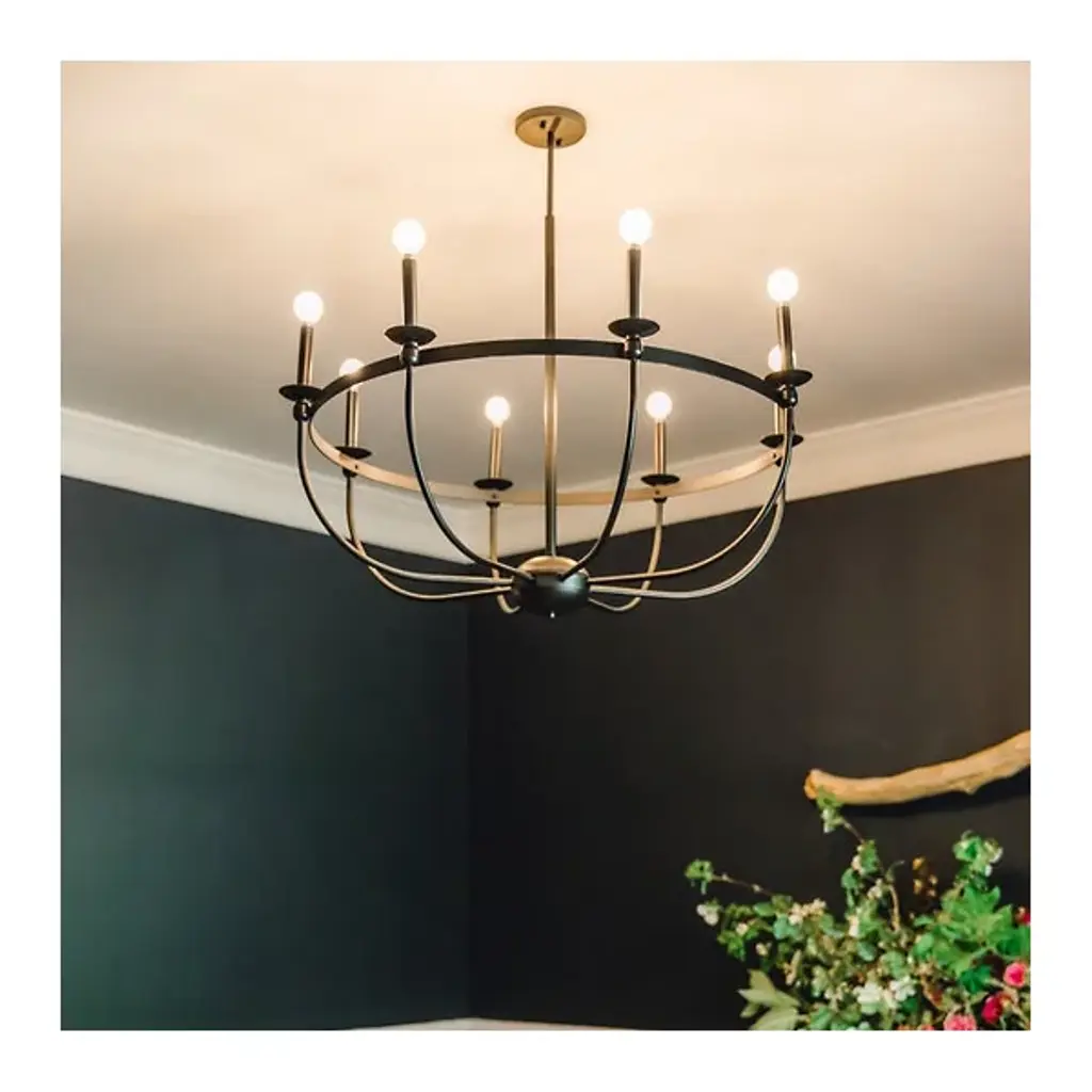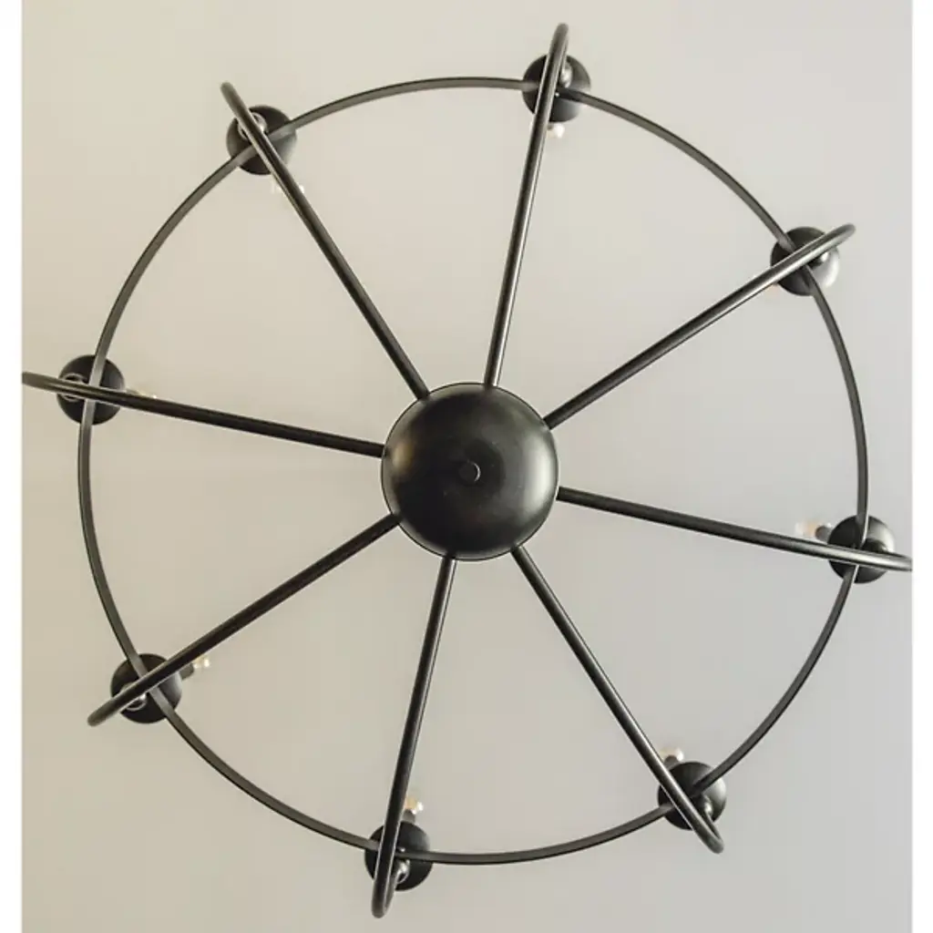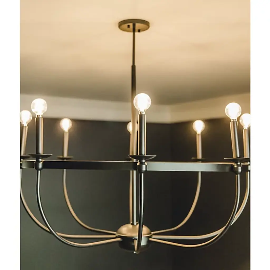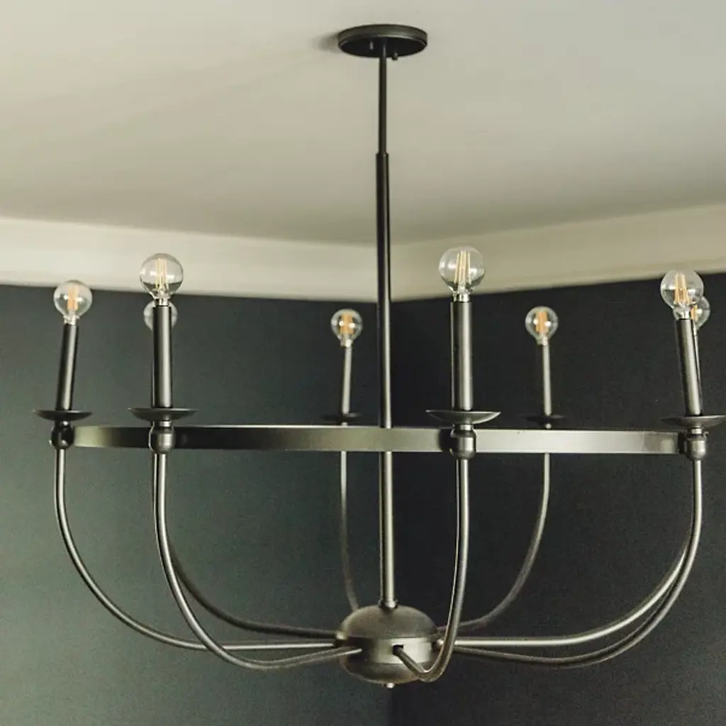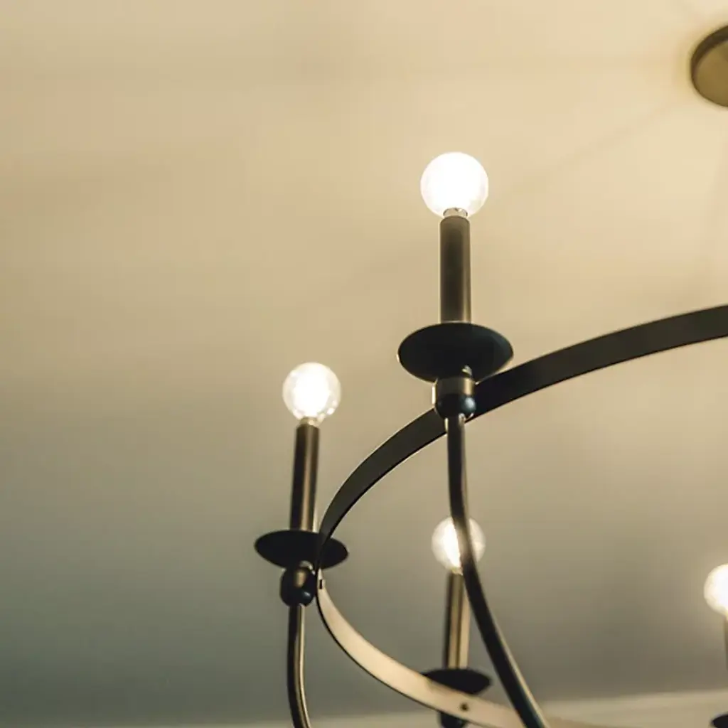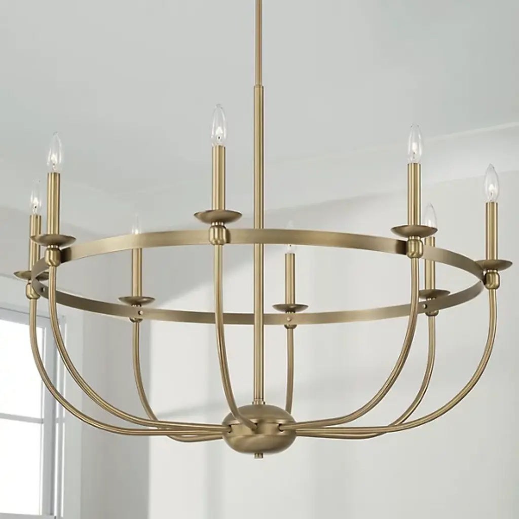 Bask in the light of the retro-minimalist Rylann Chandelier by Capital Lighting. A telescoping cylindrical stem drops from the ceiling, ending in a hub extending curving branches that swoop up to connecting points on the outside edge of a slim hoop. Candelabra-style socketing brings a more rustic feel to the hollow bowl design, and small dishes below the faux candles help mitigate downward glare from the open lighting while shining bright light perfect for larger living spaces.
