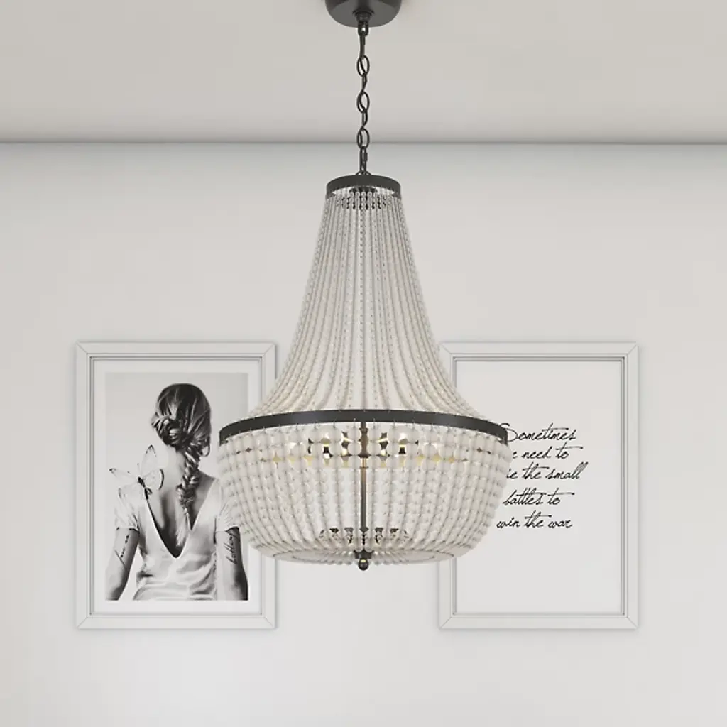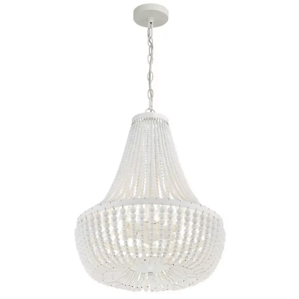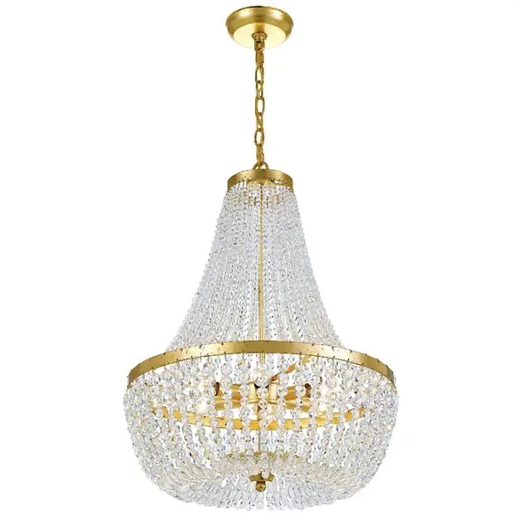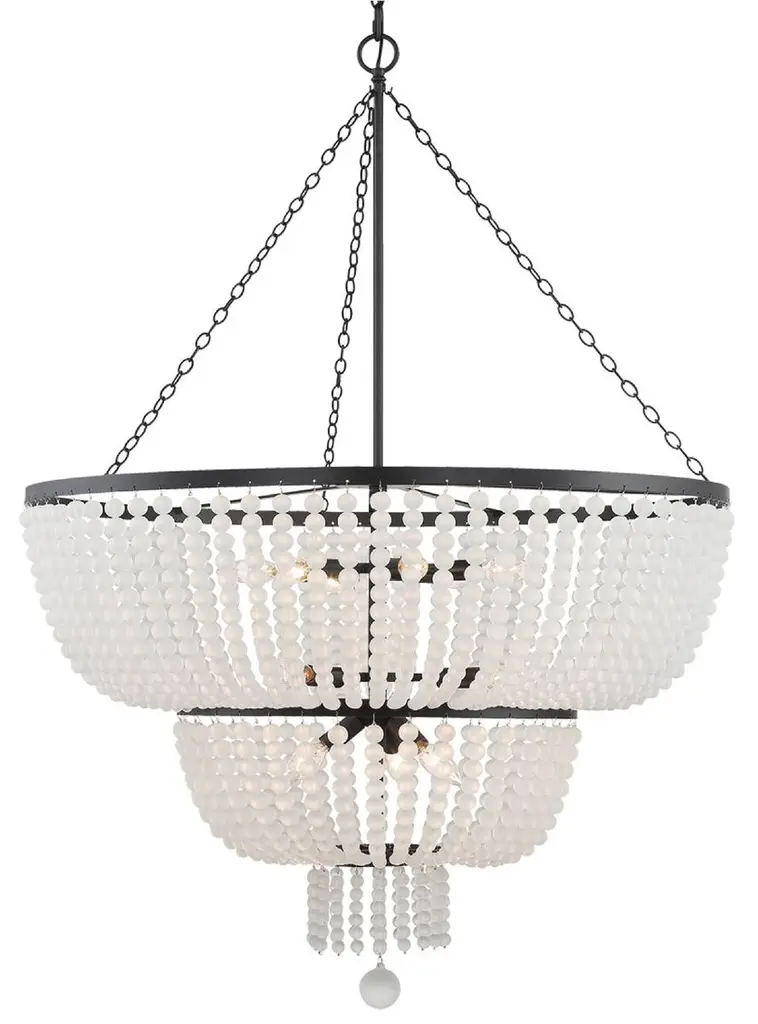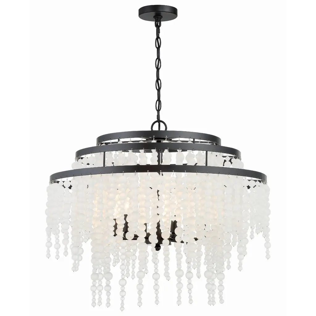 The Rylee Chandelier by Crystorama is characterized by its modern take on the traditional empire silhouette. This sophisticated contemporary fixture features a round hand-painted steel frame and cascade of streaming cut crystal beads suspended elegantly from top to bottom. Incandescent bulbs emit a warm ambient light that delicately glimmers throughout each bead for a romantic glow. Suspended by an adjustable chain, this fixture is ideal for adding a touch of fresh glamour to your space.