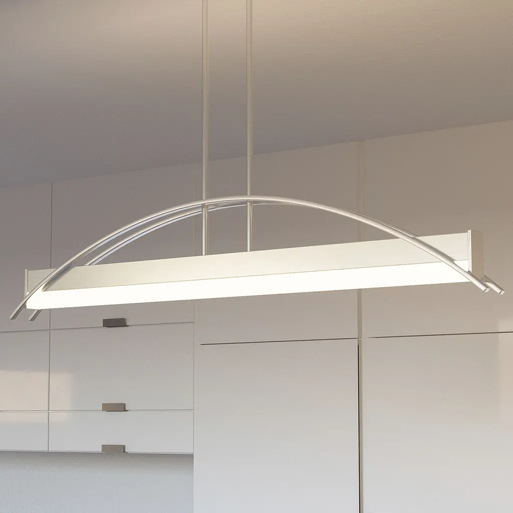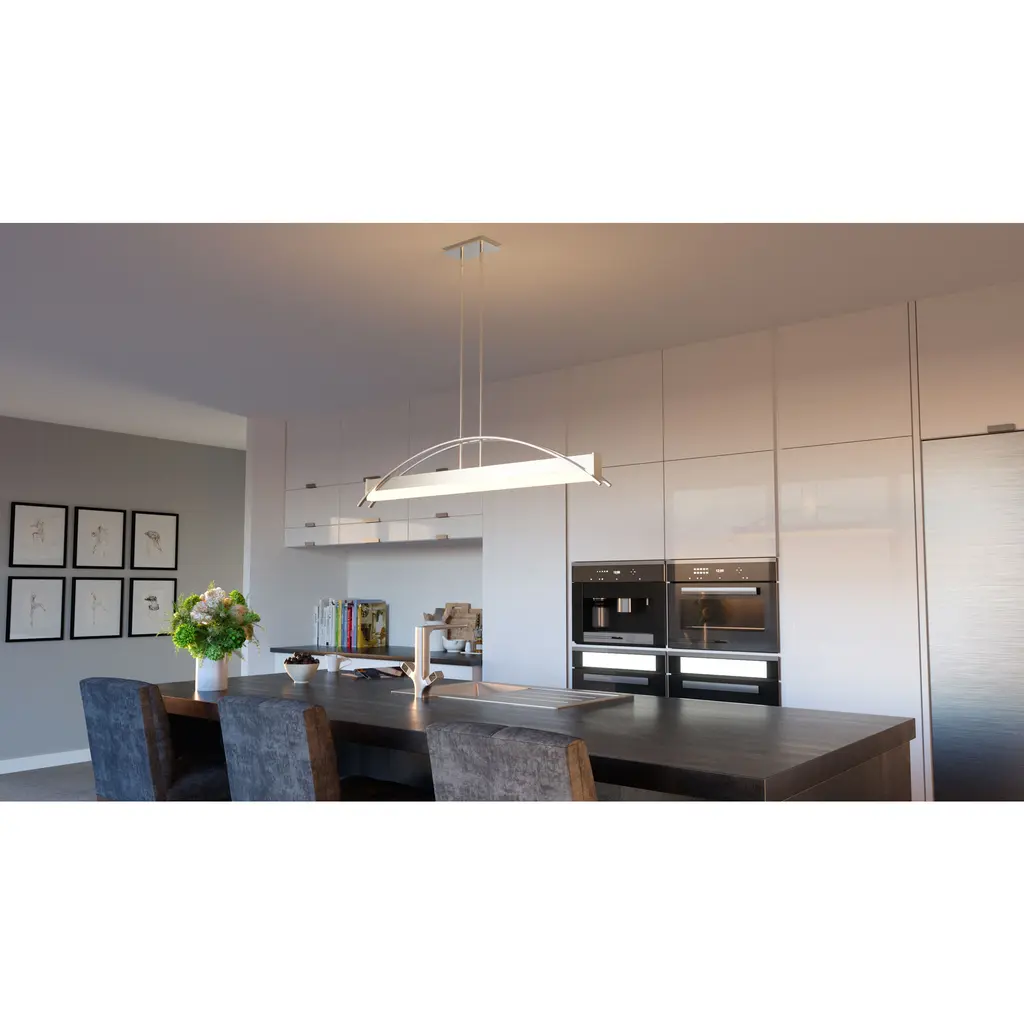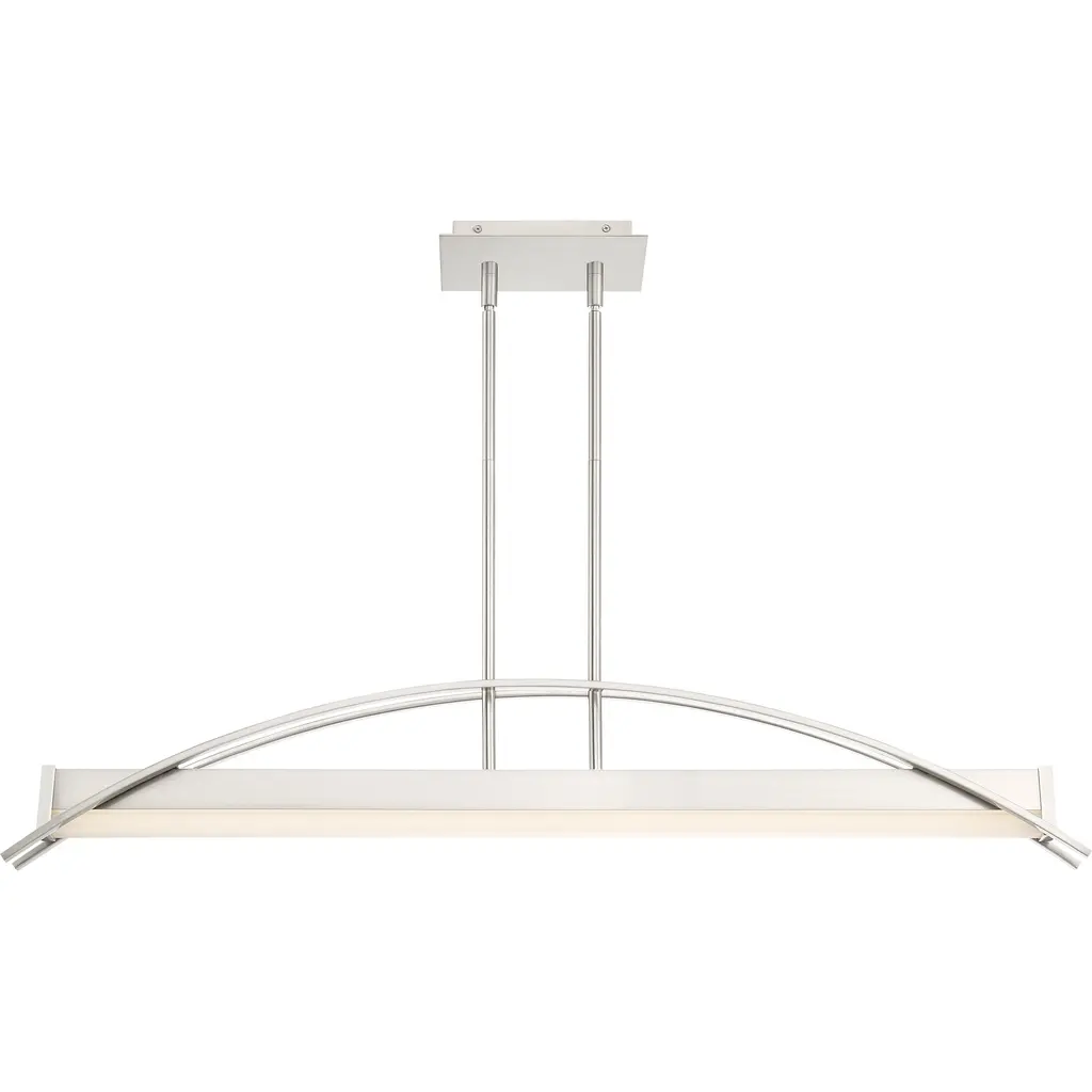 Making a dramatic statement with its modern bridge-like design, the Sabre Island Light for Platinum by Quoizel is expertly stylish. Two flat arcing beams span the length of the fixture and add depth to the rectangular shape of the body. The integrated LED light source is housed underneath a white acrylic shade. The brushed nickel finish is continued on the rods and canopy culminating in a completed work of art.