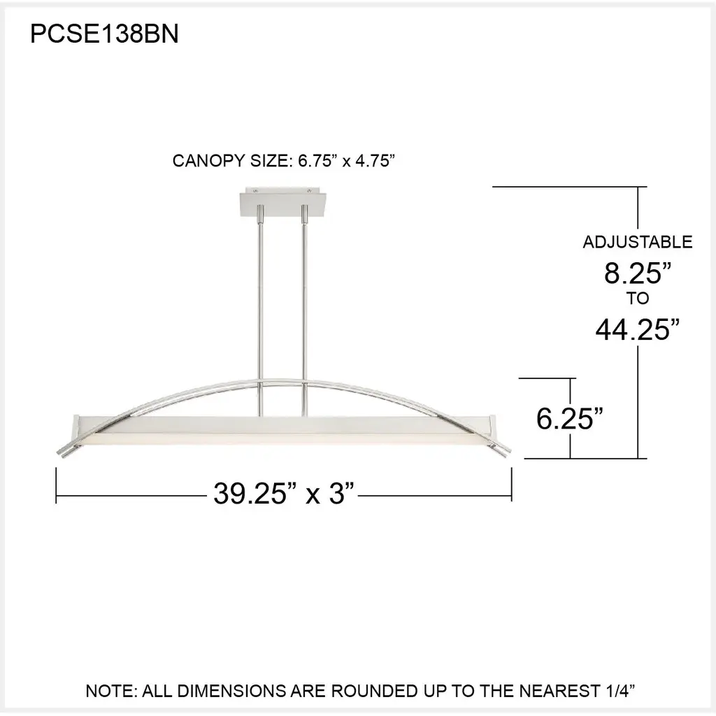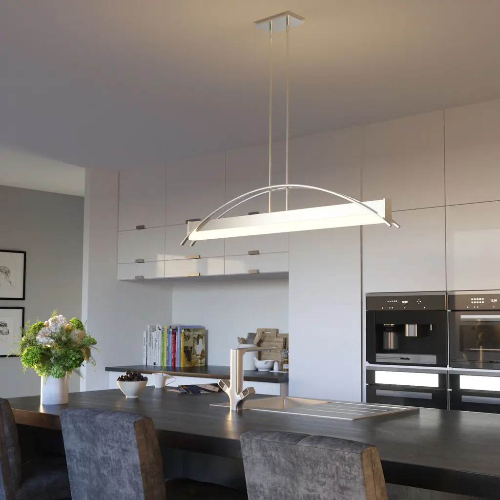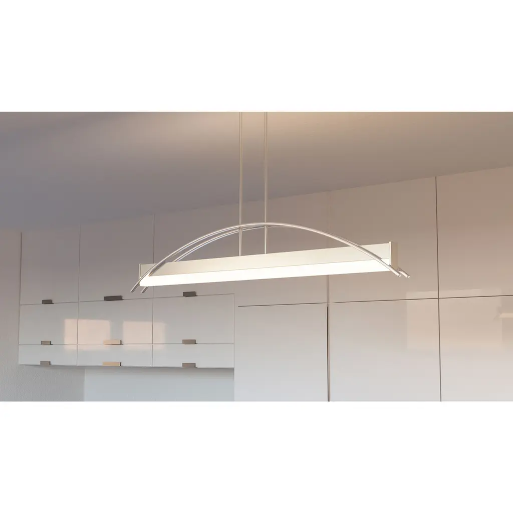 Making a dramatic statement with its modern bridge-like design, the Sabre Island Light for Platinum by Quoizel is expertly stylish. Two flat arcing beams span the length of the fixture and add depth to the rectangular shape of the body. The integrated LED light source is housed underneath a white acrylic shade. The brushed nickel finish is continued on the rods and canopy culminating in a completed work of art.