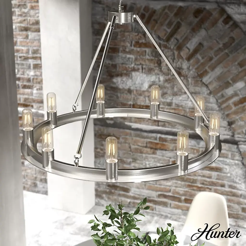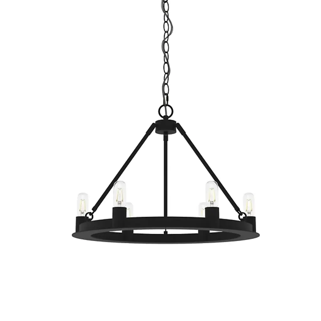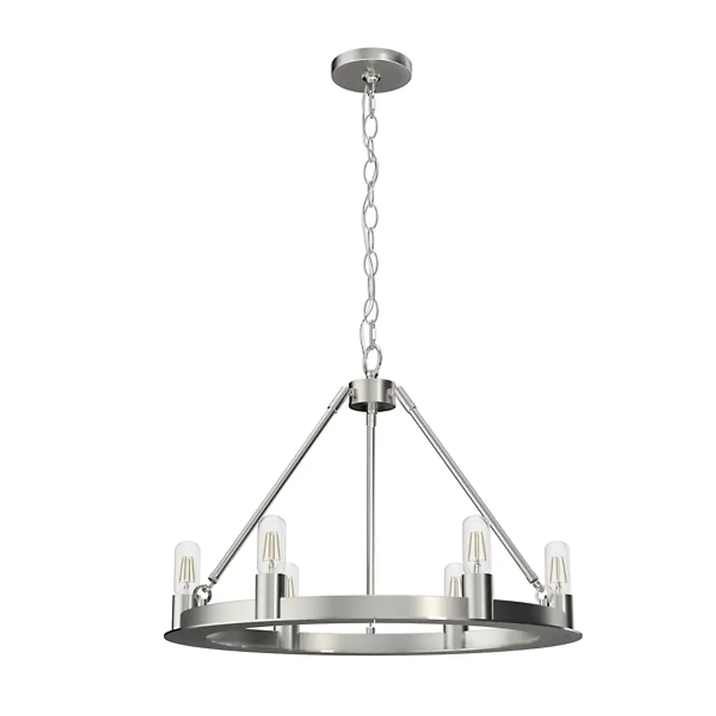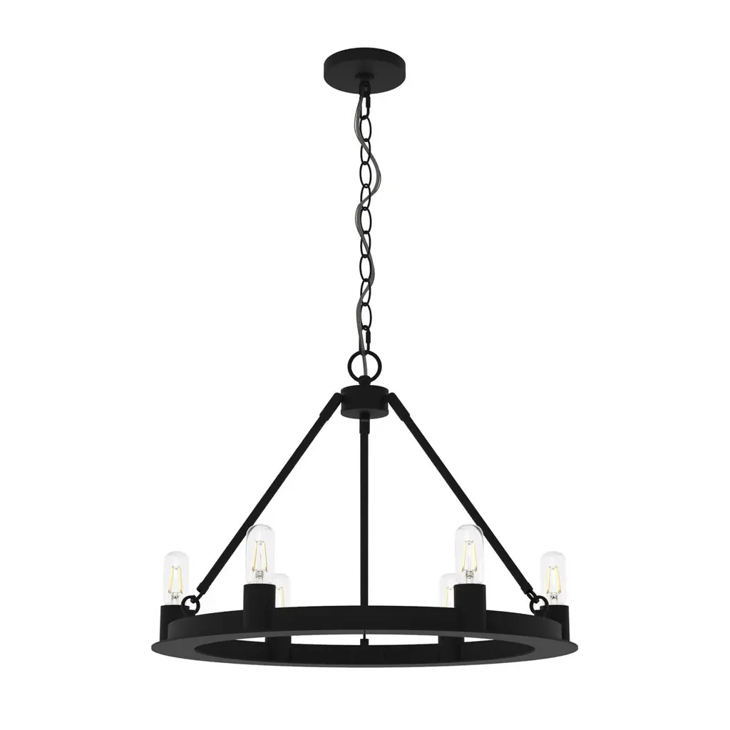 Add tasteful transitional style to your inside living spaces with the open and elegant Saddlewood Chandelier from Hunter Fans. A sleek disc canopy anchors the fixture from above, sending a medium-weight chain down to a lower stepped ring held aloft by a rounded hub and three angled stems. Six open lamps thrust upward from the ring’s exterior, the bright light dancing across the matte-textured metal structure for a mix of warm ambiance that dances out amid a bright layer of direct light from above.