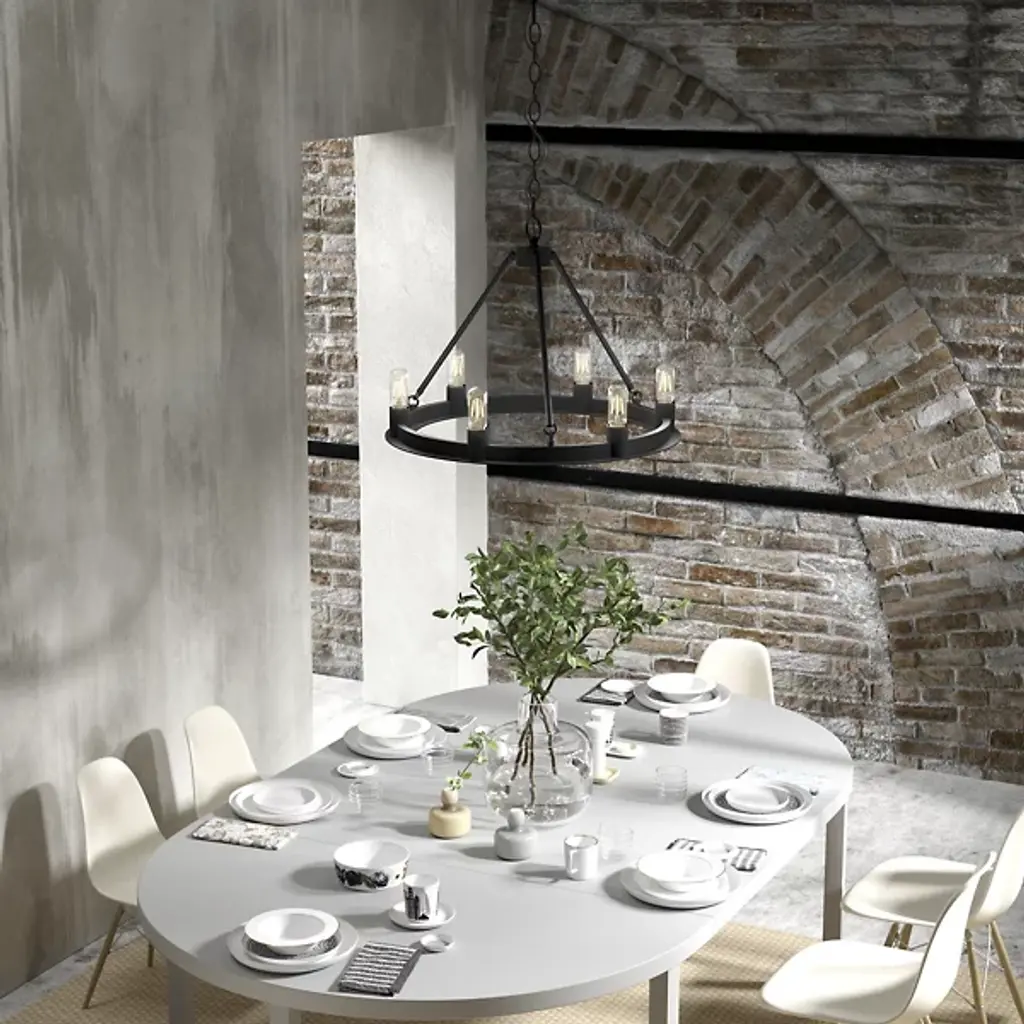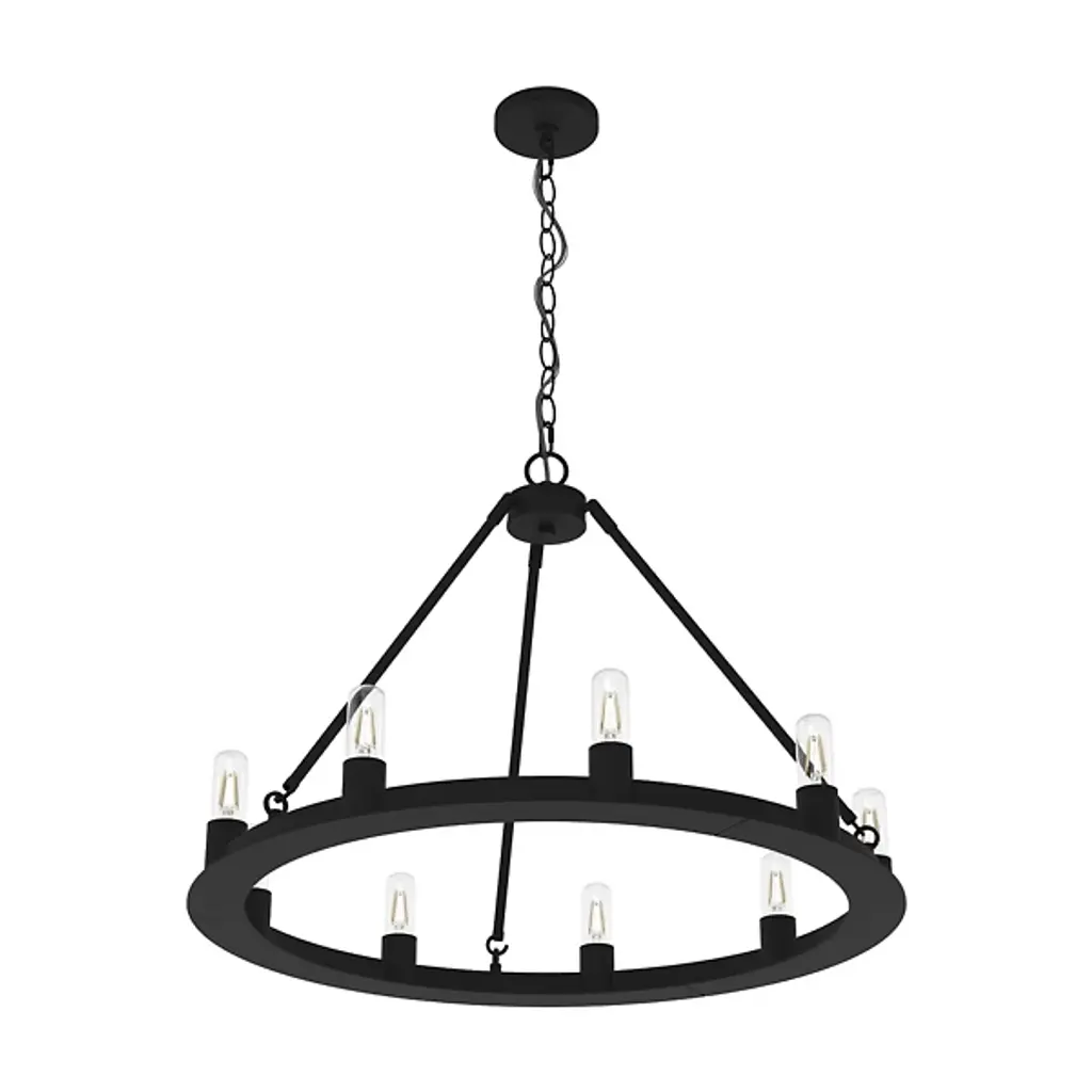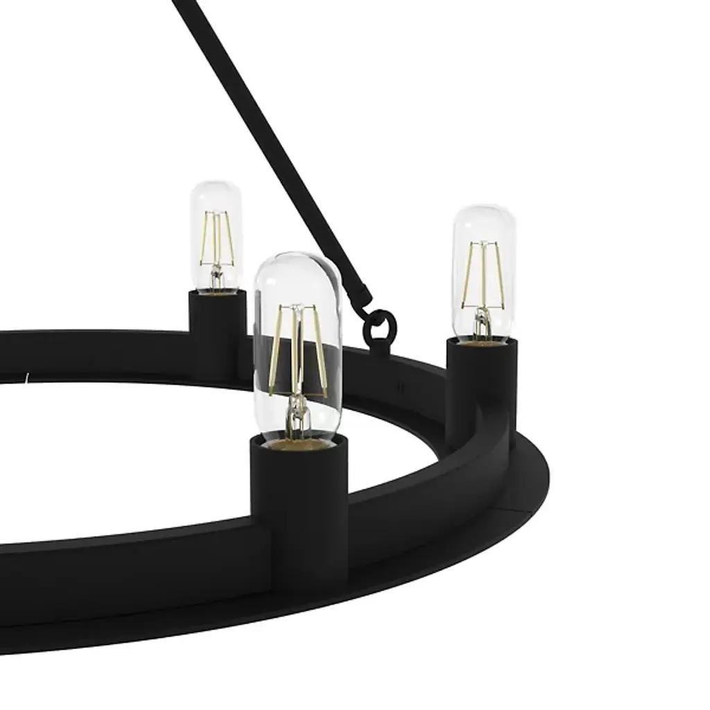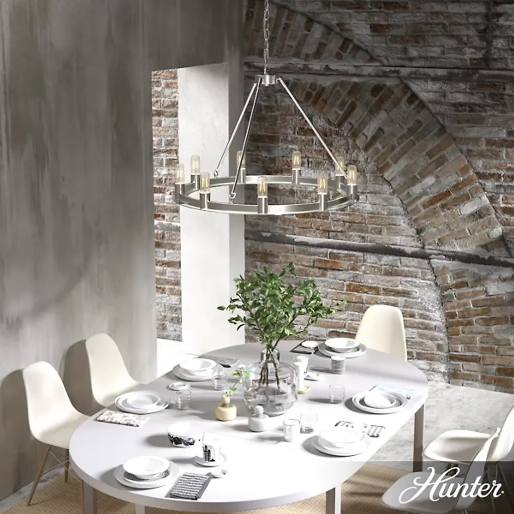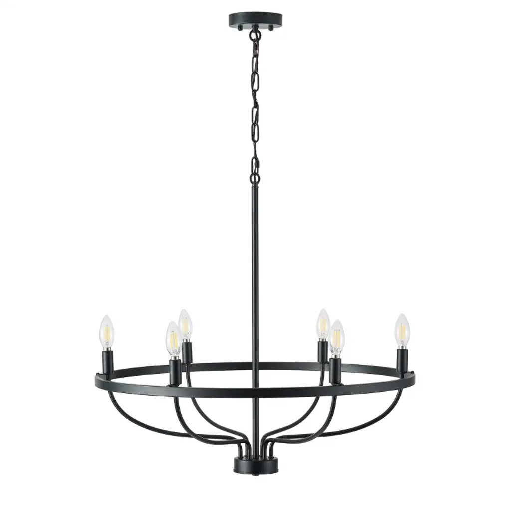 Add tasteful transitional style to your inside living spaces with the open and elegant Saddlewood Chandelier from Hunter Fans. A sleek disc canopy anchors the fixture from above, sending a medium-weight chain down to a lower stepped ring held aloft by a rounded hub and three angled stems. Six open lamps thrust upward from the ring’s exterior, the bright light dancing across the matte-textured metal structure for a mix of warm ambiance that dances out amid a bright layer of direct light from above.