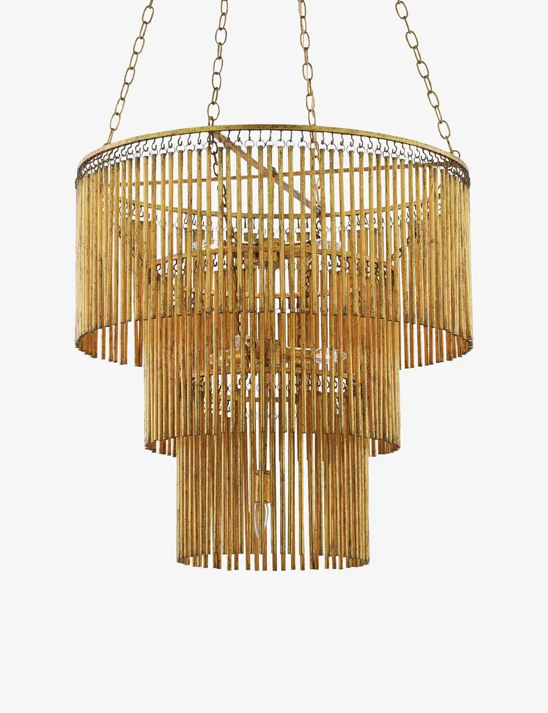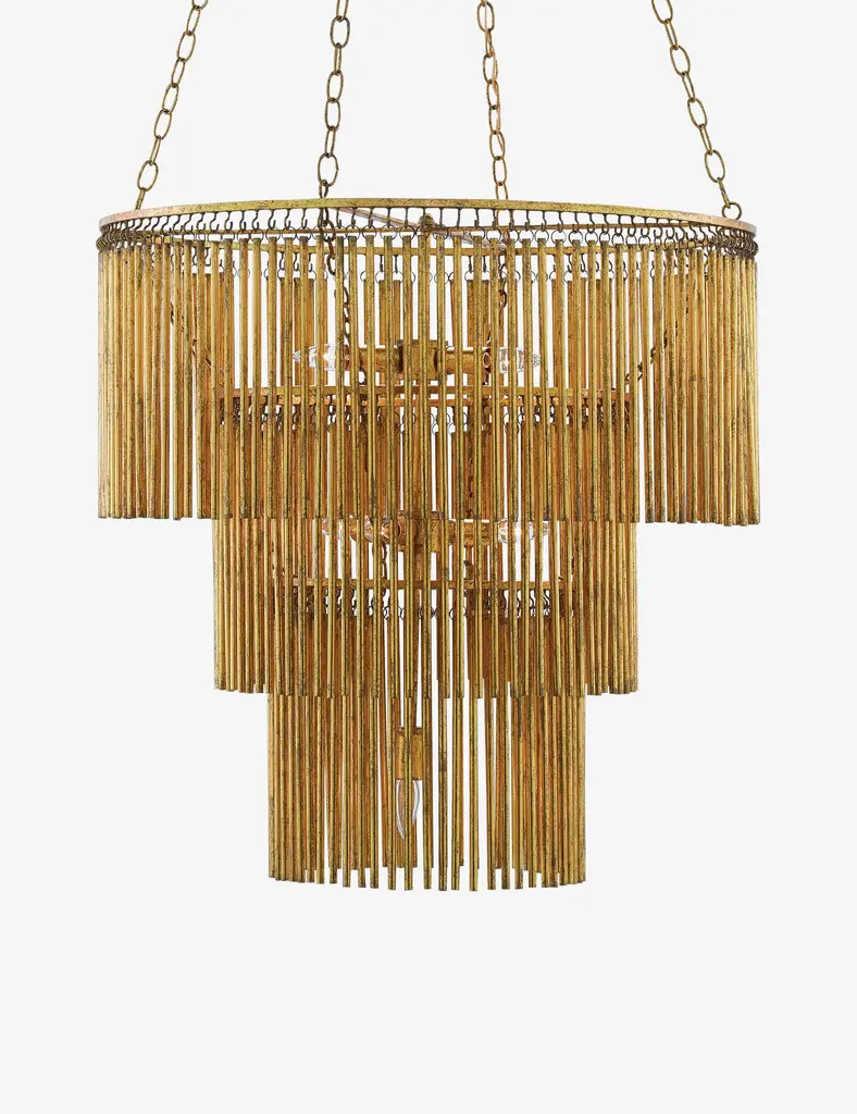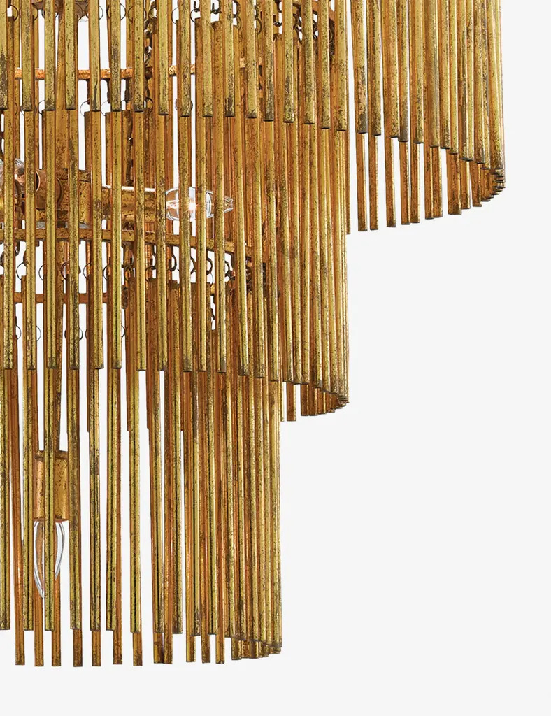 The Saint-Yves chandelier is mid-century modern luxe in lighting. This large chandelier makes a striking statement with tiered layers adorned in gold leaf. A distressed finish offers warmth and patina, inspiring timeless splendor overhead.