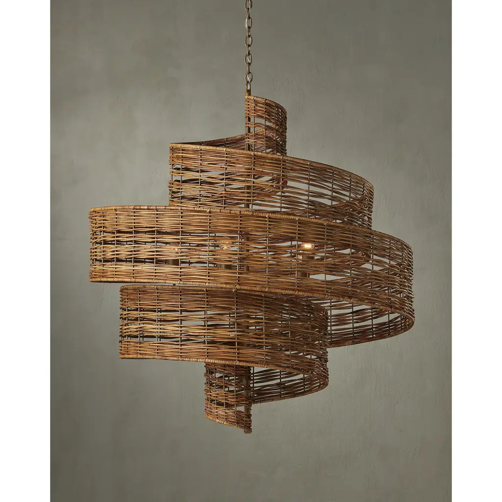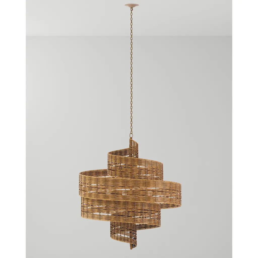 Hiroshi Koshitaka envisioned the Saisei Grande Chandelier as one of a number of fixtures he sees as fulfilling the concept that encompasses the acts involved in regeneration and reproduction as we restore, revive, and experience regrowth and rebirth. Rattan flows artfully around a spiral wrought iron frame in a khaki finish, which is tonally in sync with the natural color of the material. The otherworldly shape of this rattan chandelier was inspired by outer space—galaxies in the universe come to light.