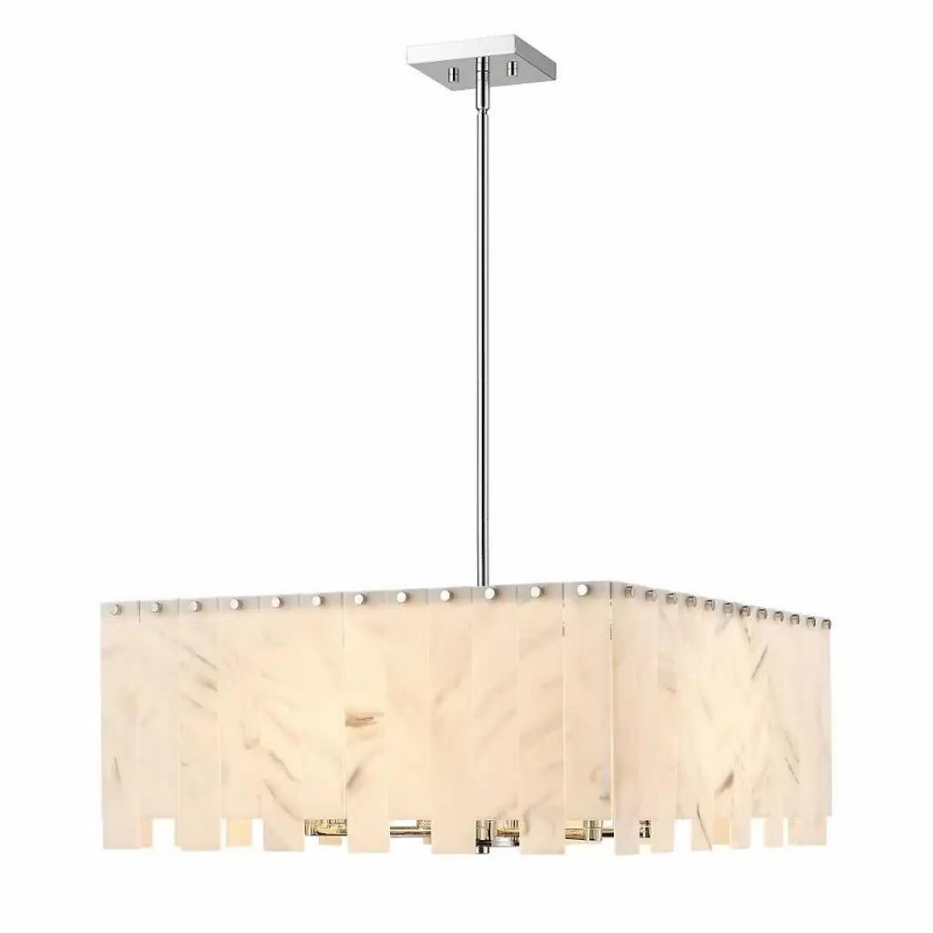 Our fixture by renowned designer Theo Eichholtz evokes the glamour of 1960s Italian lighting. Arranged within a sleek metal frame, dozens of translucent alabaster panes produce a dramatic play of light and a softly diffused glow.ALSO AVAILABLE IN GLASS SHOP THE ENTIRE COLLECTION