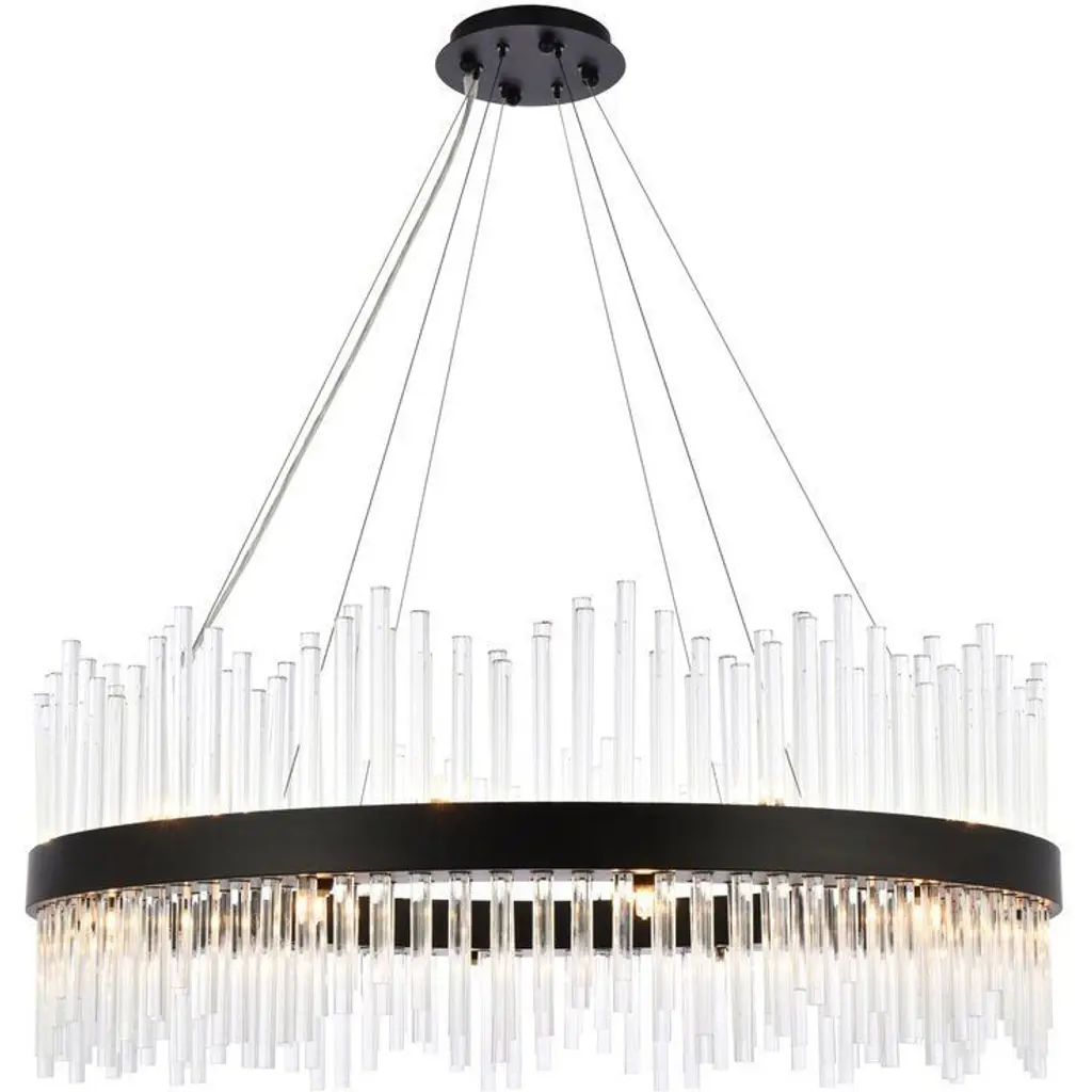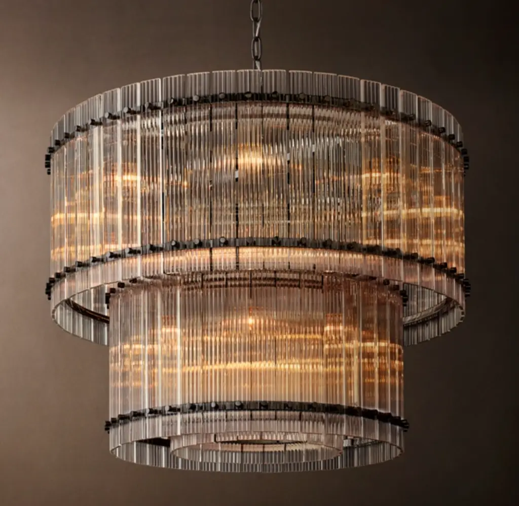 Our fixture by renowned designer Theo Eichholtz evokes the glamour of 1960s Italian glass lighting. Arranged within a sleek metal frame, dozens of glass panes are raked by hand to create a fluted texture, producing a dramatic play of light and a softly diffused glow.ALSO AVAILABLE IN ALABASTER SHOP THE ENTIRE COLLECTION
