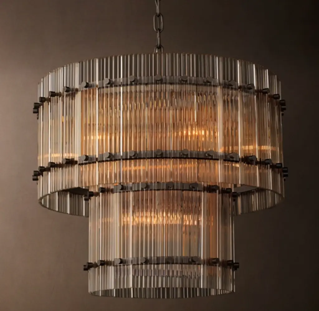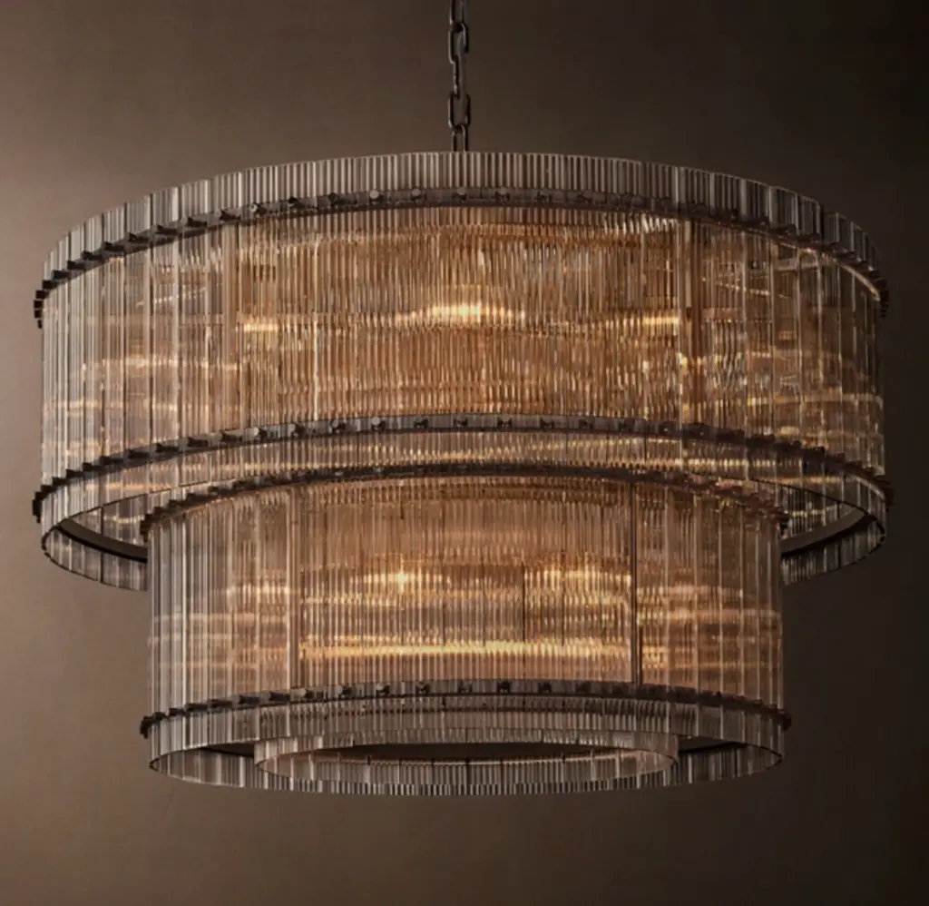Our fixture by renowned designer Theo Eichholtz evokes the glamour of 1960s Italian glass lighting. Arranged within a sleek metal frame, dozens of glass panes are raked by hand to create a fluted texture, producing a dramatic play of light and a softly diffused glow.ALSO AVAILABLE IN ALABASTER SHOP THE ENTIRE COLLECTION
