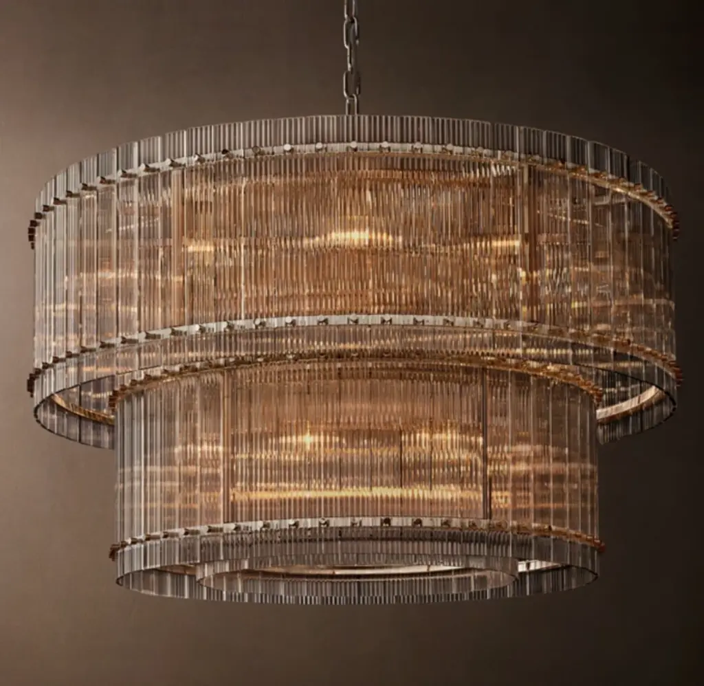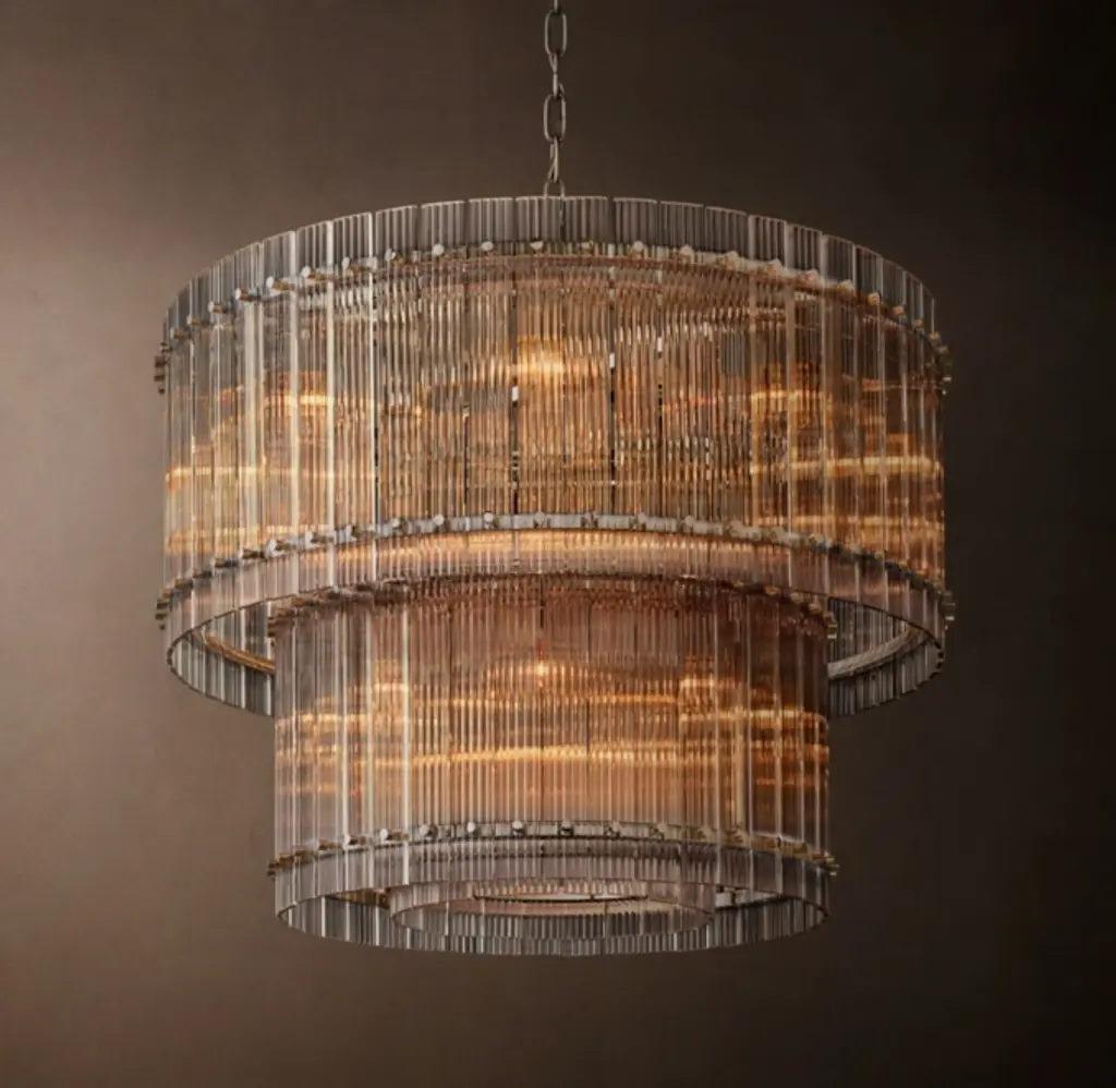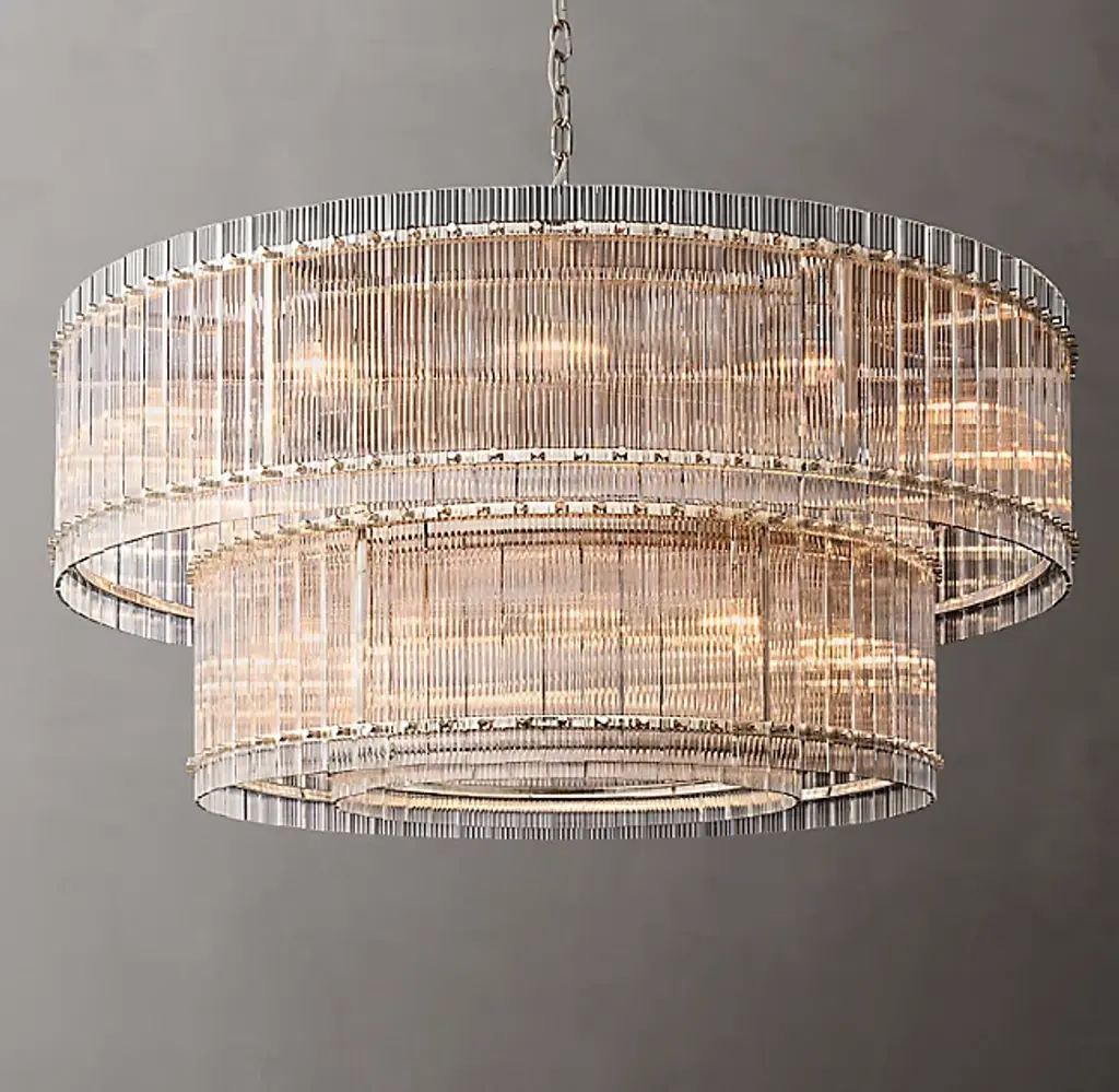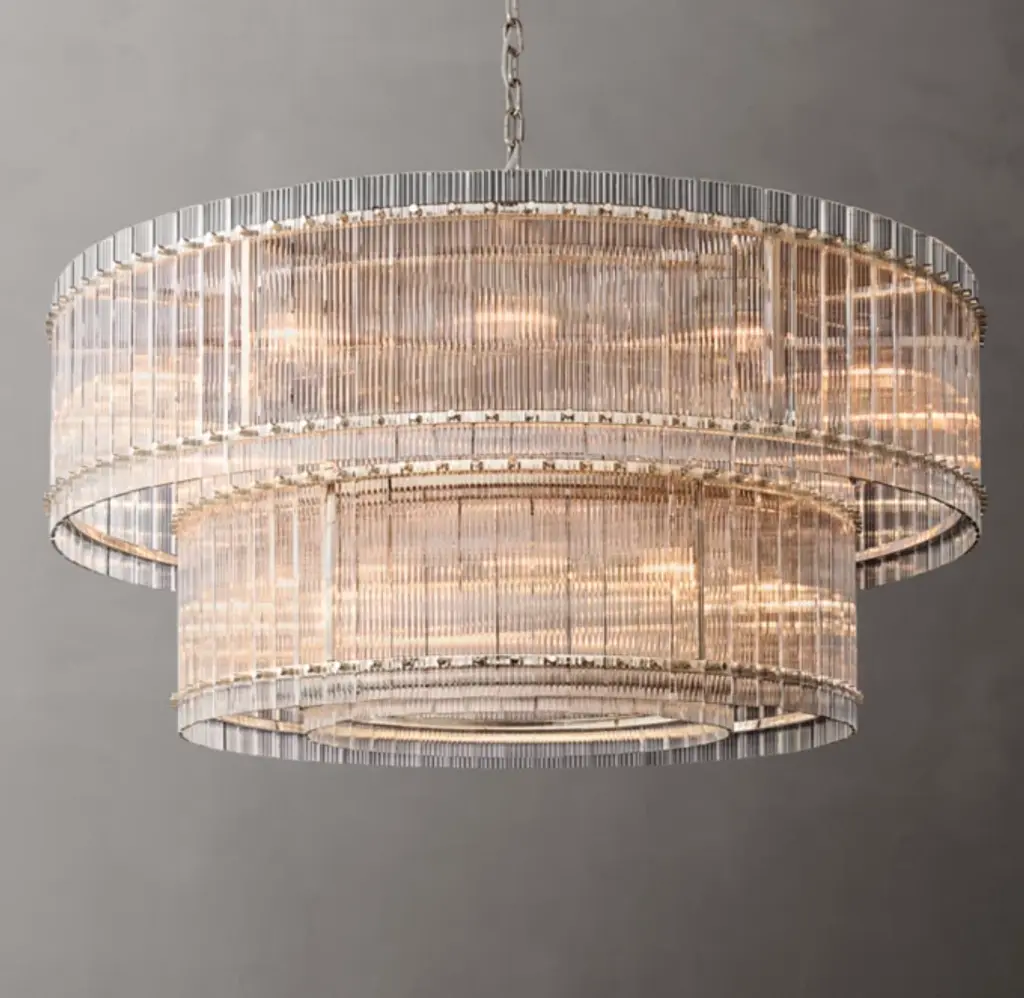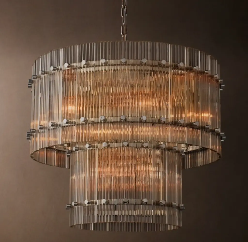 Our fixture by renowned designer Theo Eichholtz evokes the glamour of 1960s Italian glass lighting. Arranged within a sleek metal frame, dozens of glass panes are raked by hand to create a fluted texture, producing a dramatic play of light and a softly diffused glow.ALSO AVAILABLE IN ALABASTER SHOP THE ENTIRE COLLECTION