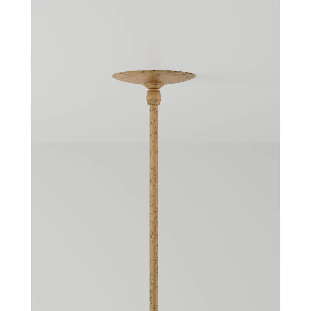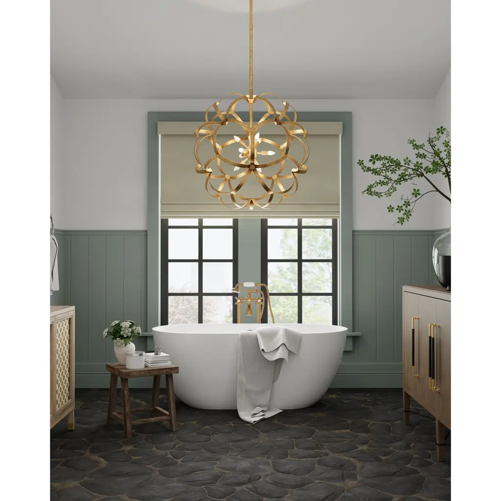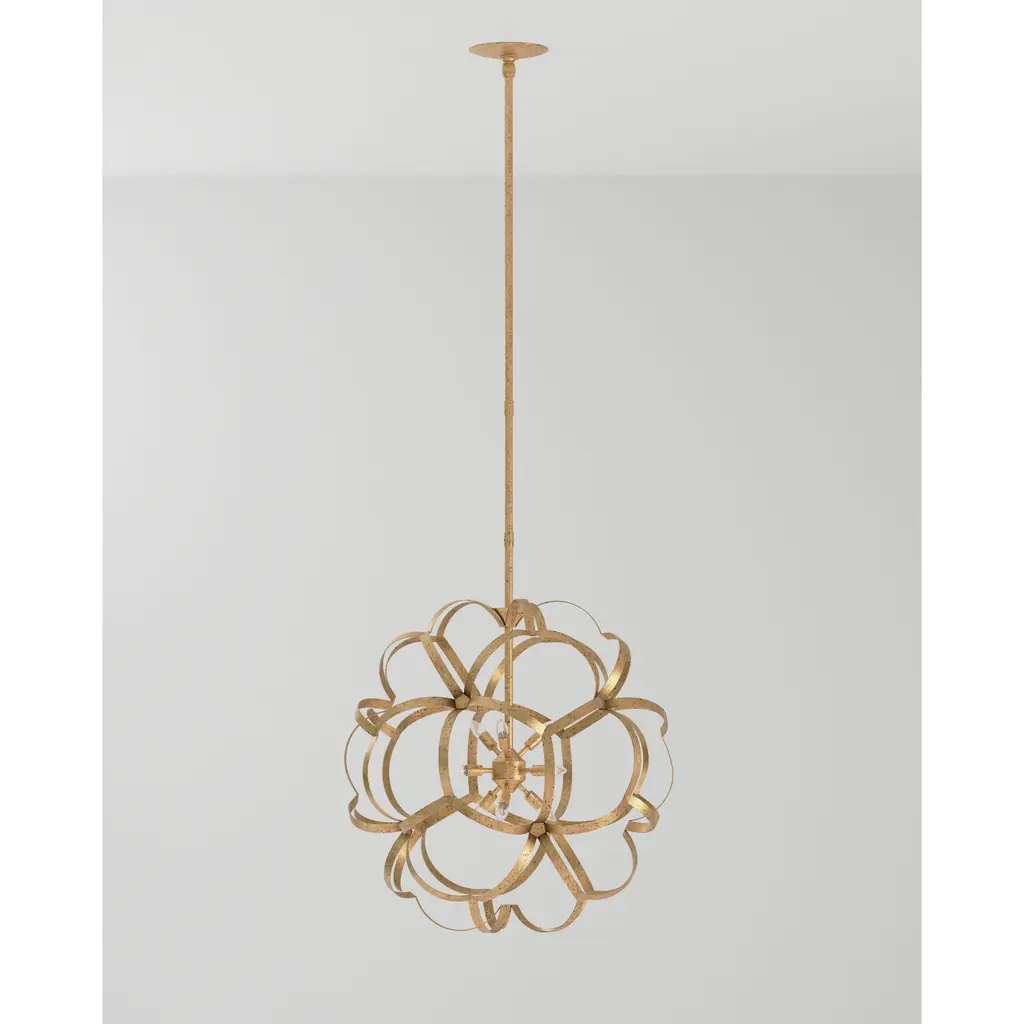 As lyrical in style as the poetry written by the namesake of our Sappho Orb Chandelier, this fixture is a veritable festival of winsomeness. The ribbons of wrought iron seem to be fluttering around the nine lights, which proves the talent of our craftspeople who can take such a rigid material and make it feel graceful. The finish artisans then covered the composition in a new gold leaf, which gives the fixture a gleaming hint of patina.