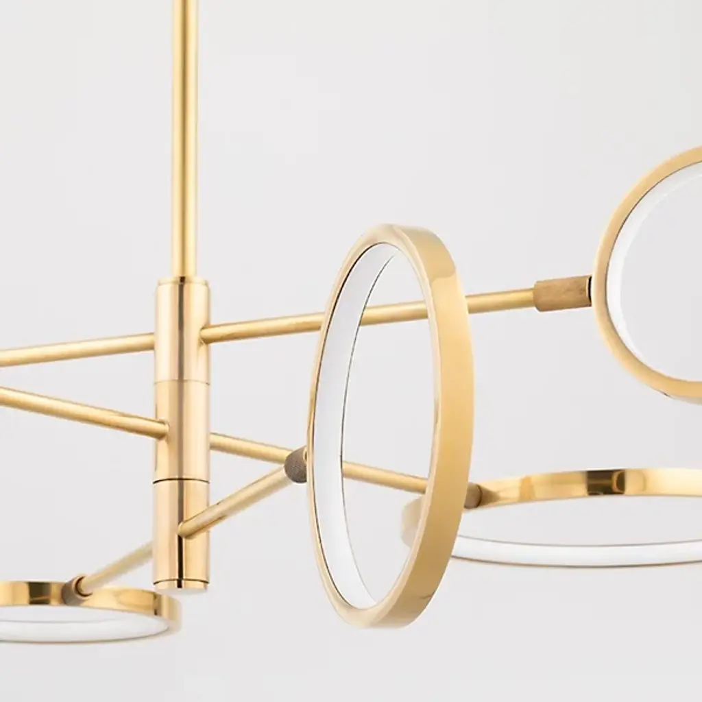 Expand your interior spaces with the stellar spectacle of the Saturn LED Chandelier from Hudson Valley Lighting. A stylish and enticing contemporary fixture, it descends from a round canopy via a single stem, extending slender horizontal arms from a series of rotating hubs below. Each arm terminates in a differently-sized metal ring structure that acts as an encompassing housing for integrated LED lamping, creating a larger structure that suggests a stellar map that glitters with a wide-reaching ambiance.