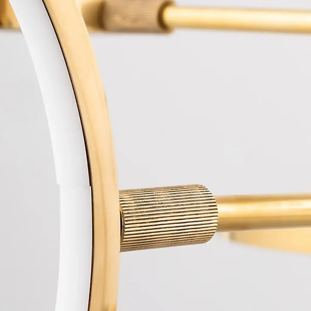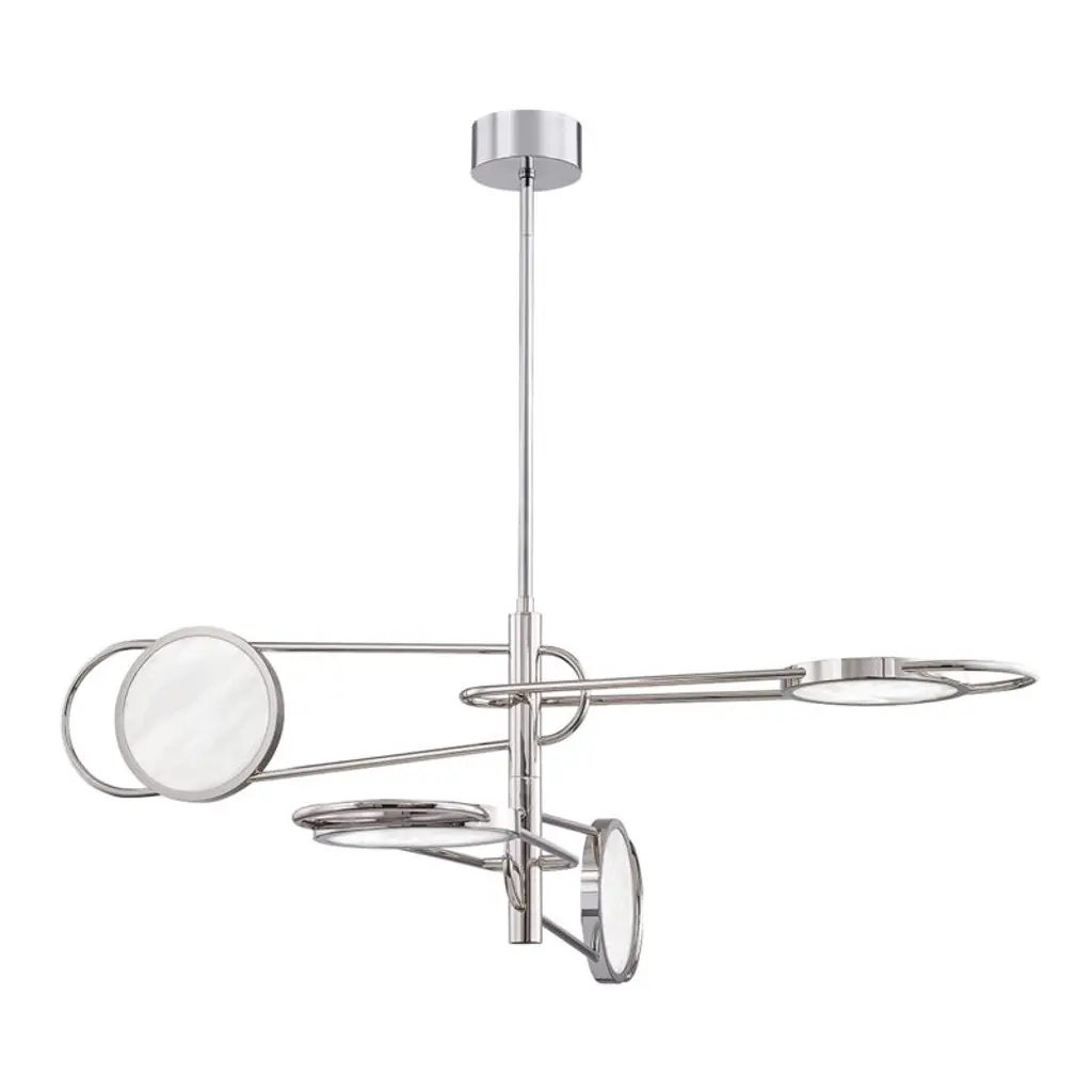 Expand your interior spaces with the stellar spectacle of the Saturn LED Chandelier from Hudson Valley Lighting. A stylish and enticing contemporary fixture, it descends from a round canopy via a single stem, extending slender horizontal arms from a series of rotating hubs below. Each arm terminates in a differently-sized metal ring structure that acts as an encompassing housing for integrated LED lamping, creating a larger structure that suggests a stellar map that glitters with a wide-reaching ambiance.