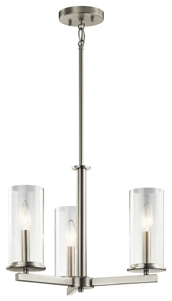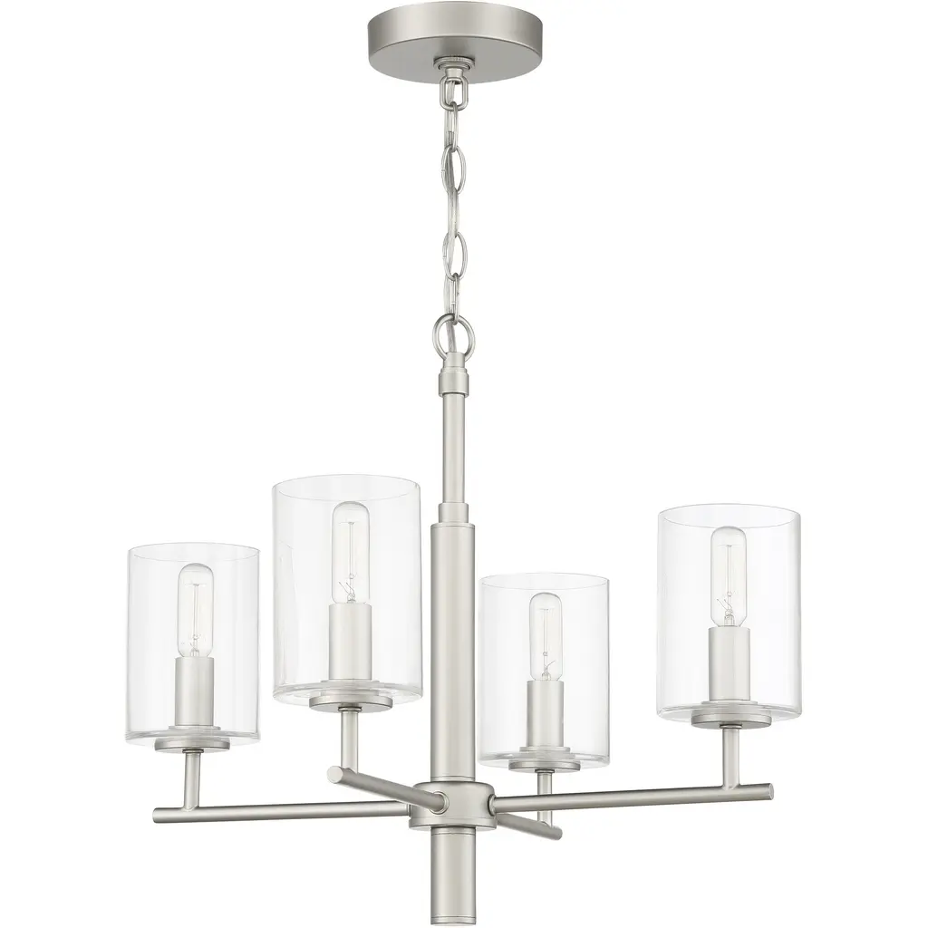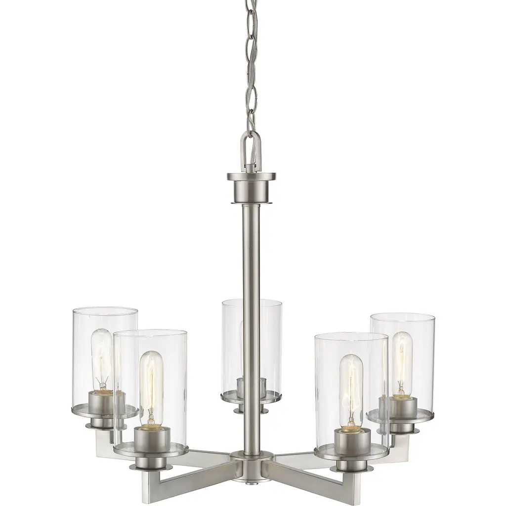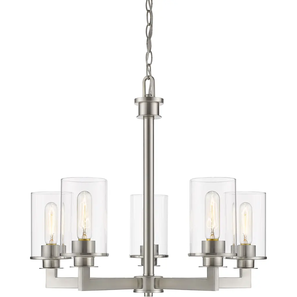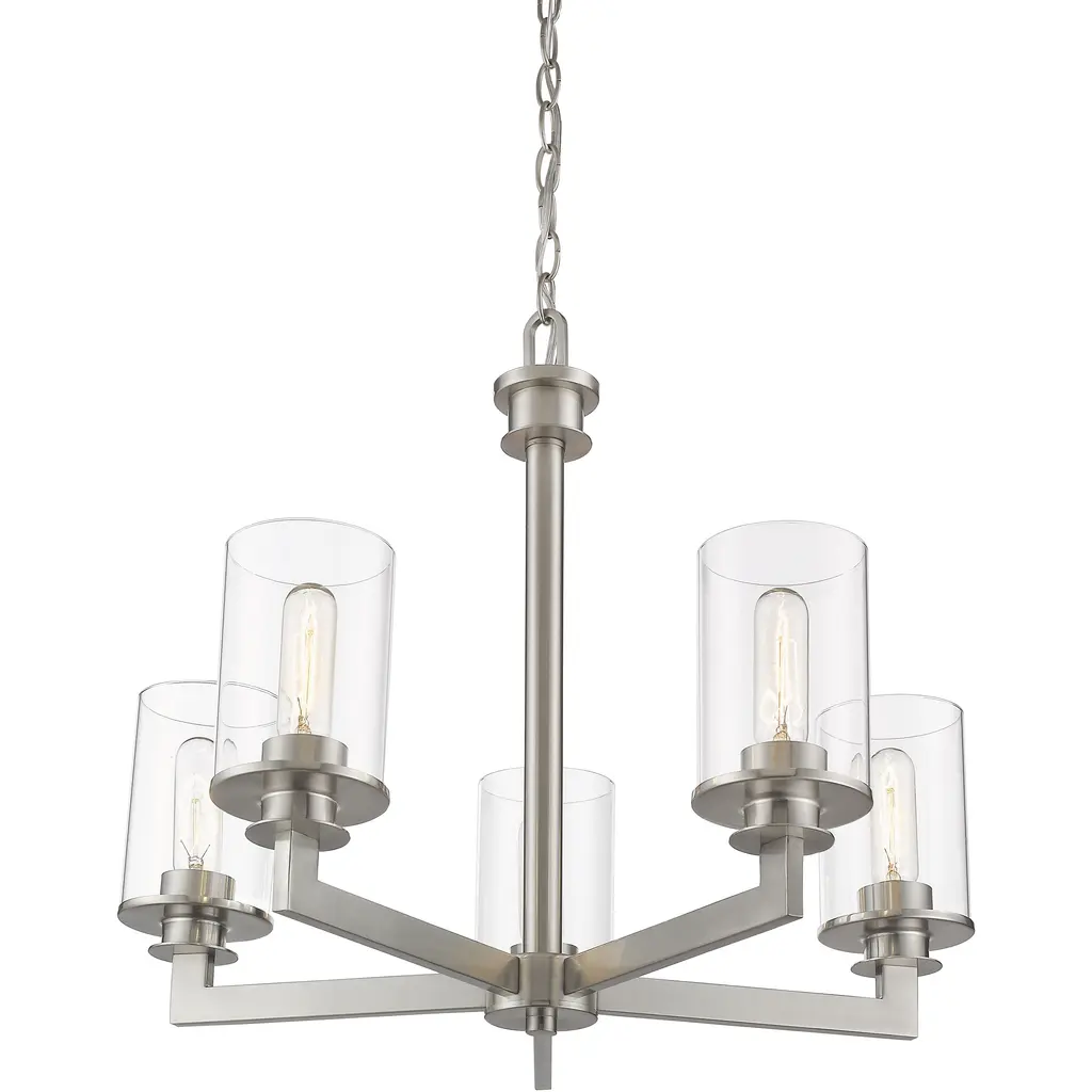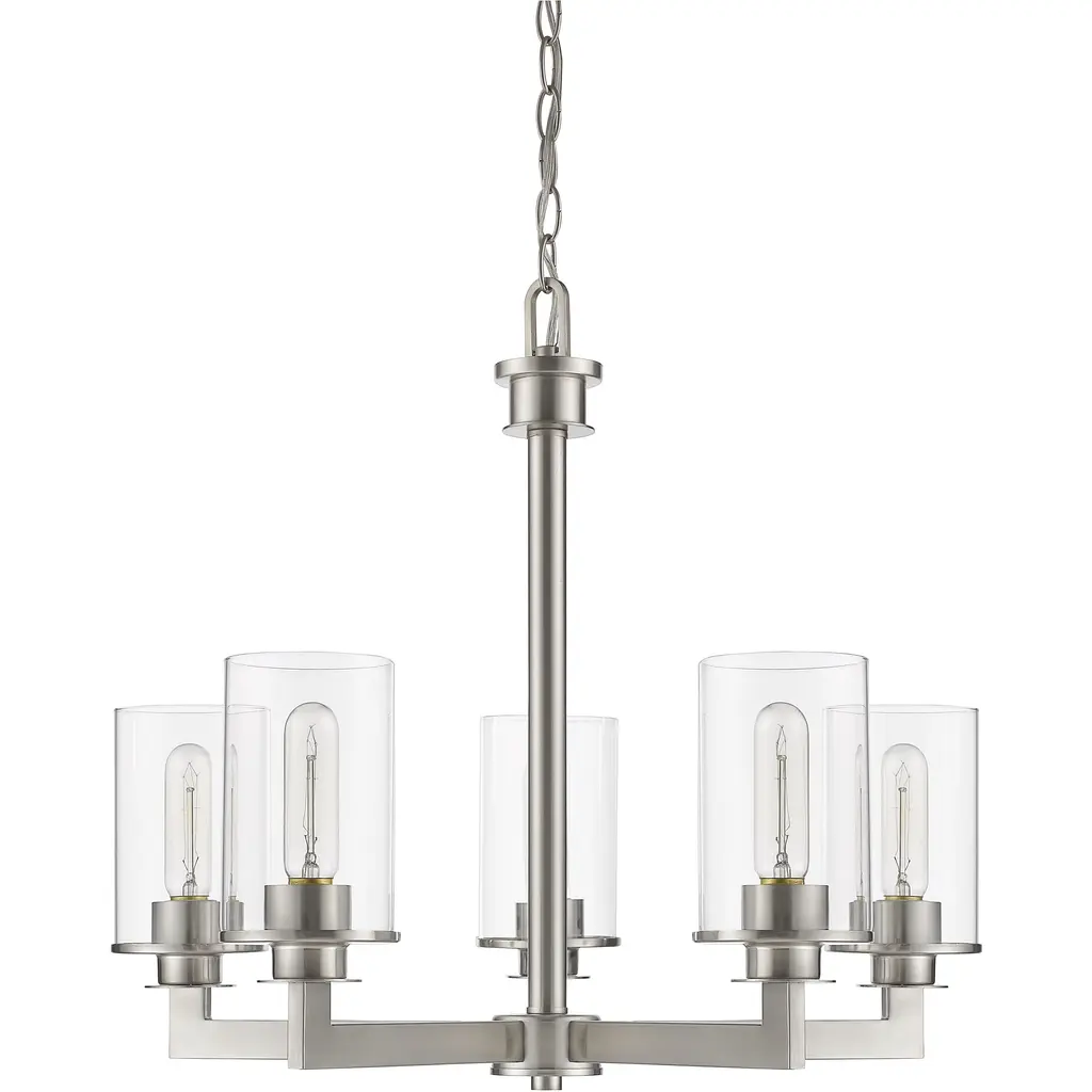 Visions of modern art give this mid-century modern five-light chandelier elegant sophistication. A brushed nickel finish highlights the gleaming brilliance of the clear glass cylinder-shaped shades.