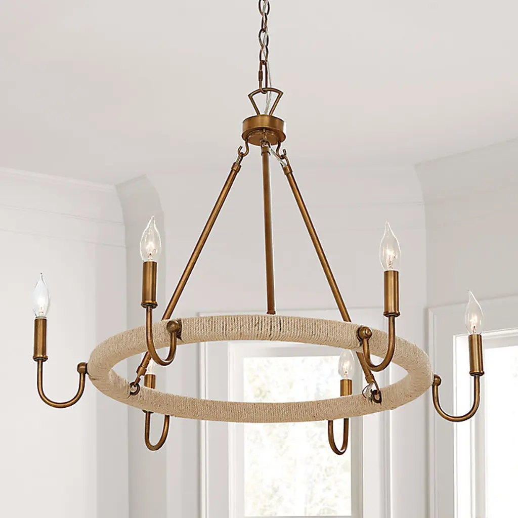 Warm light and natural texture for the entryway, dining room or living room. Our Savannah 6-Light Chandelier is handmade of iron in a classic round silhouette with an antique brass finish, and wrapped in natural jute twine for a stylish blending of mixed materials. Add softness and color with your favorite chandelier shades from our huge online selection. Savannah Jute Wrapped 6-Light Chandelier features: