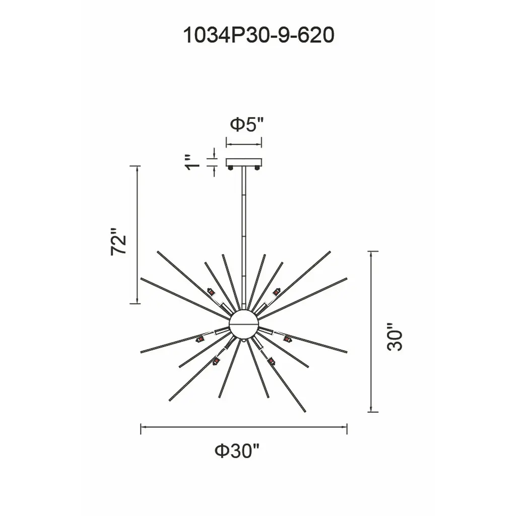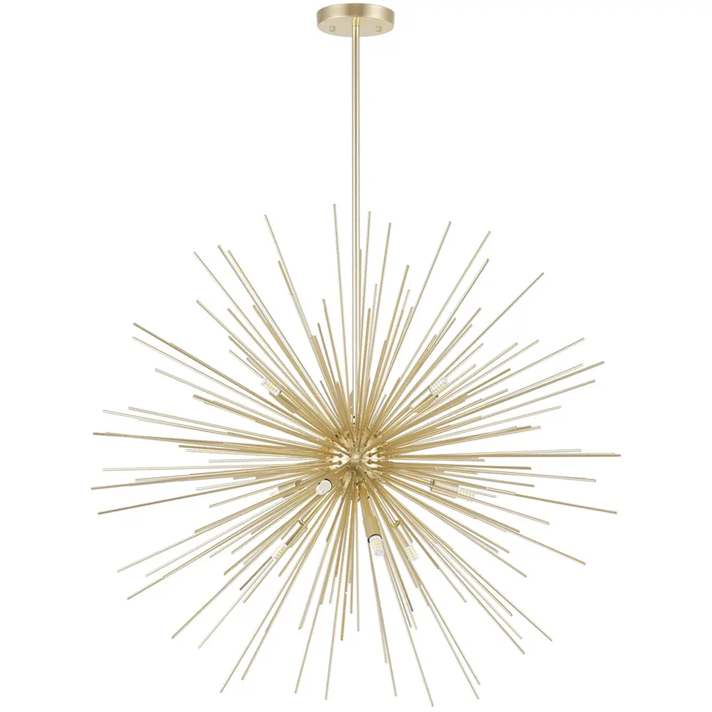 Add bold character to your space with the Savannah 9 Light Chandelier in a gold leaf finish. Featuring a striking 30-inch diameter starburst design, this chandelier makes a dramatic statement in any room. Perfect for creating a warm, captivating glow, its ideal for brightening up modern, minimalist spacesespecially when paired for double the impact.