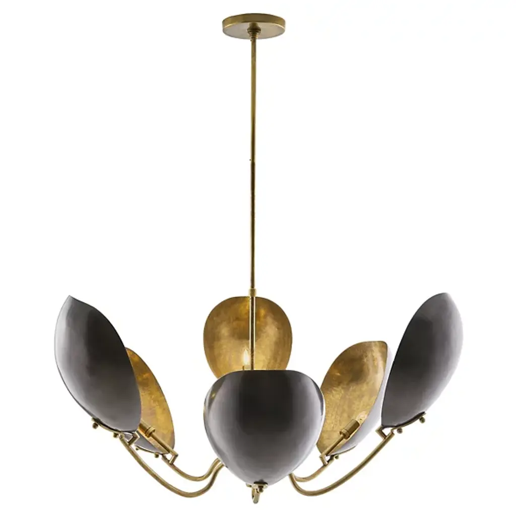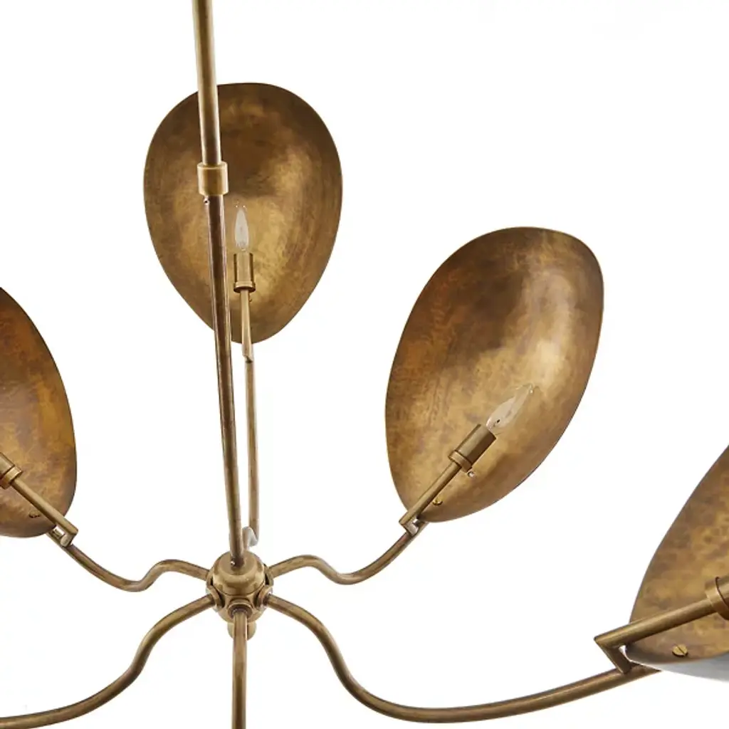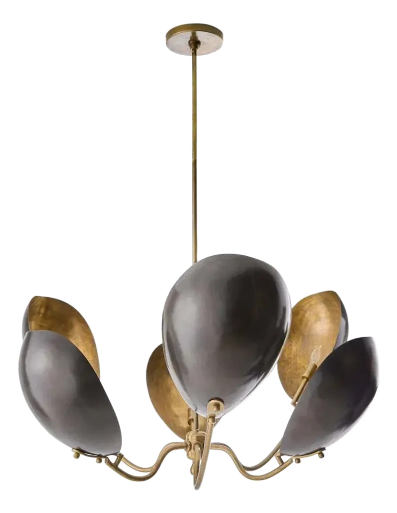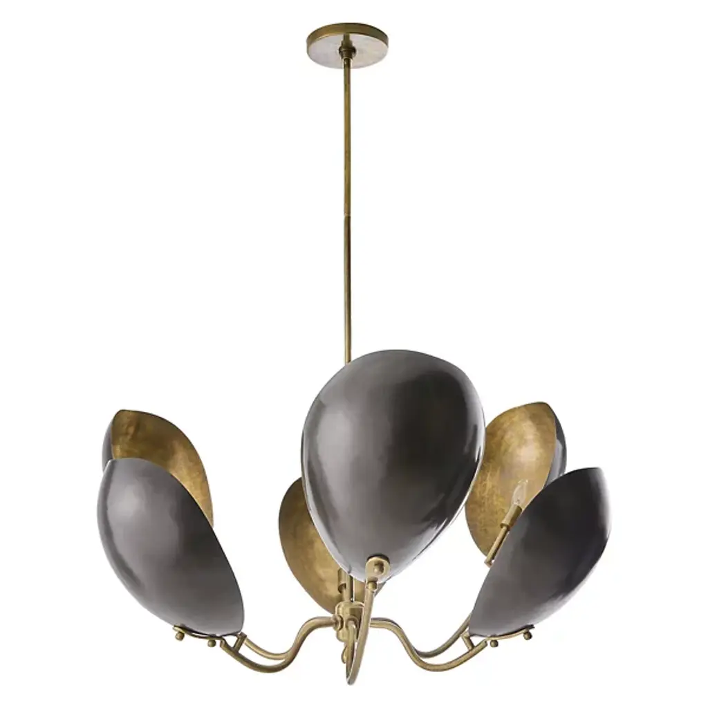 The Savo Chandelier from Arteriors uplifts as a dancing group of light-filled shells. This chandelier references the unforgettable shapes and bold finishes of mid-century design. Entering the room with a fine cord, the piece is set in motion with a series of wavy metal arms. Metal shells on the top face towards the sky with generous curves that conceal the lamping with a bit of mystery. A candle-style lamping setup inside paints the interior of the textured shells a golden hue. This golden color reflects into the room, creating an airy, inviting aura.