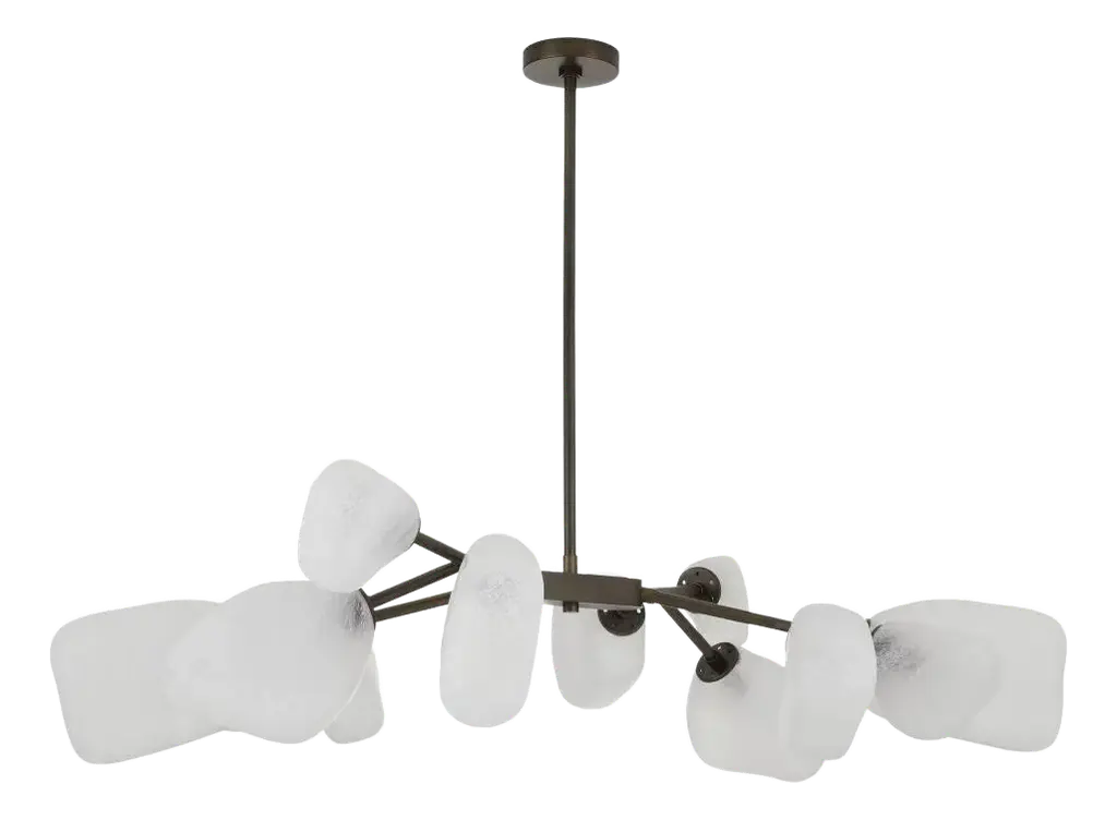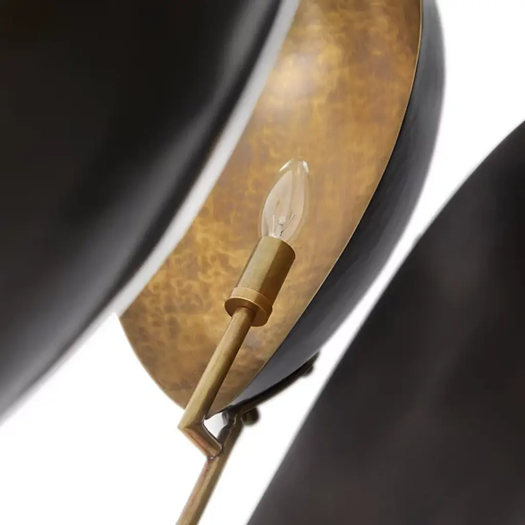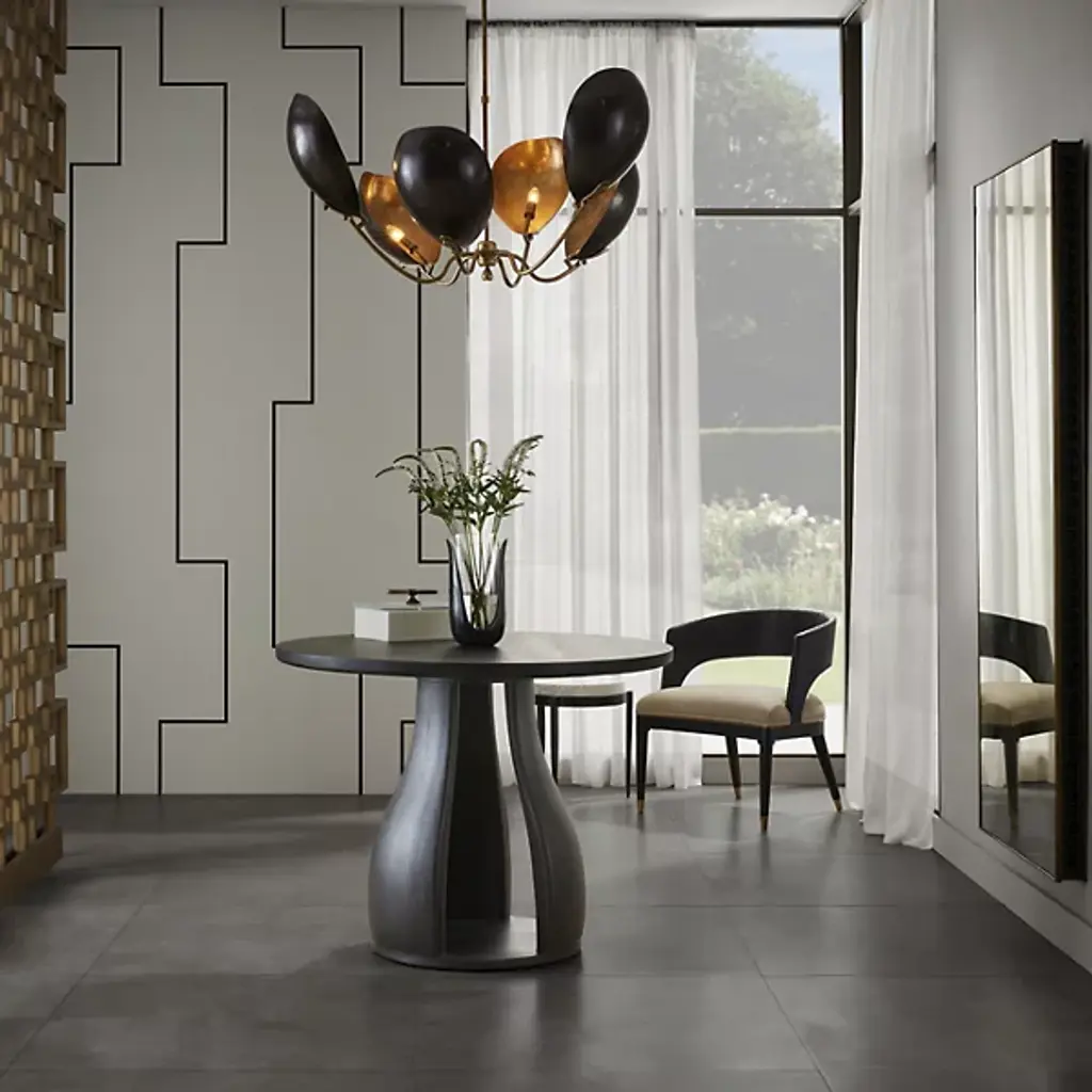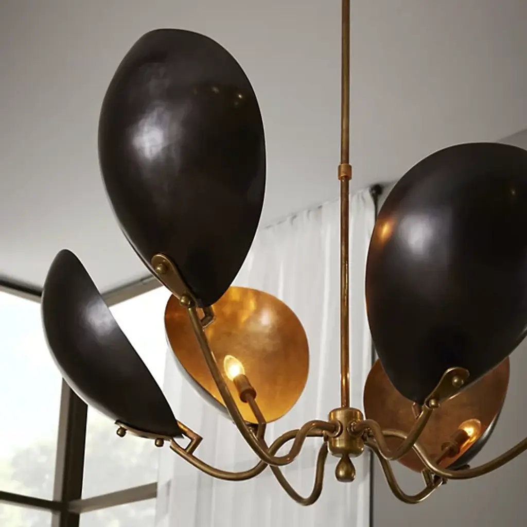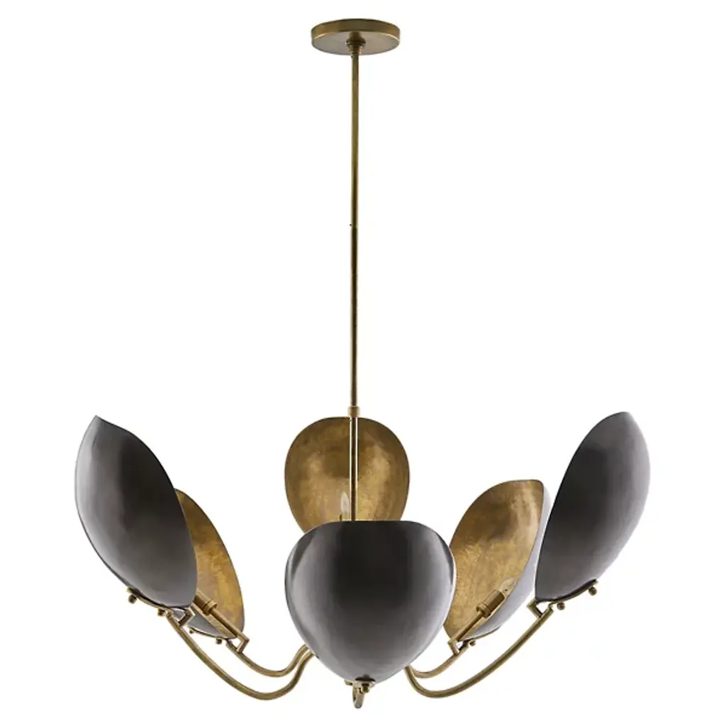 The Savo Chandelier from Arteriors uplifts as a dancing group of light-filled shells. This chandelier references the unforgettable shapes and bold finishes of mid-century design. Entering the room with a fine cord, the piece is set in motion with a series of wavy metal arms. Metal shells on the top face towards the sky with generous curves that conceal the lamping with a bit of mystery. A candle-style lamping setup inside paints the interior of the textured shells a golden hue. This golden color reflects into the room, creating an airy, inviting aura.