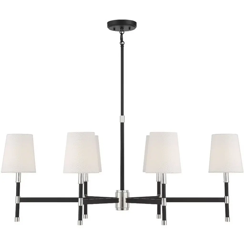 The Savoy House Brody 6-light linear chandelier is a great way to infuse your home with sophisticated lighting style. Its streamlined classic look is decorated with white fabric shades and finished in matte black with shining polished nickel accents. It's perfect for brightening up any room! Brody is 41" in length and 18" in width. It has an adjustable height ranging from 18" to 72". It uses six candelabra size bulbs with a max of 60 watts per bulb. Comes with four 12" downrods and one 6" downrod, plus 80" of cord.