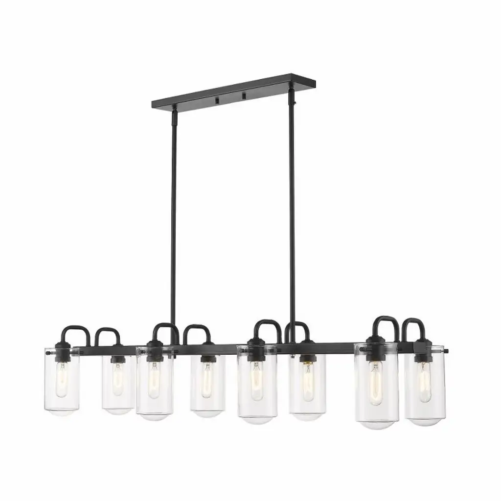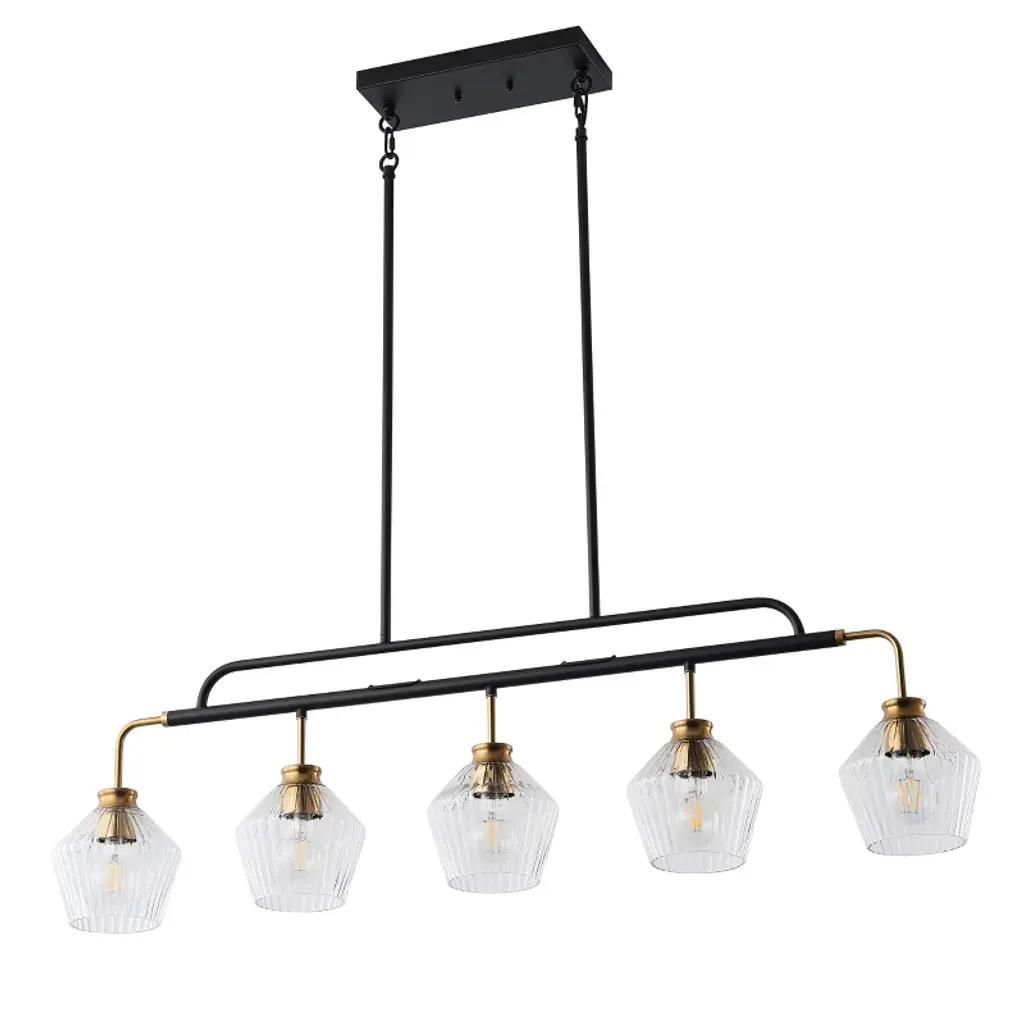 The linear lines of the Calhoun draw the eye to its symmetrical beauty with a matte black finish and clear glass shades. With an adjustable height from 10" to 62" and measuring 40" long x 5" wide, this five-light linear chandelier provides ample illumination from five 60-watt Edison-base bulbs. Material: Metal, Finish Color: Matte Black, Width: 5", Height: 10", Length: 40", Hanging Method: Stem, Lamping Type: Incandescent, Number Of Bulbs: 5, Wattage: 300 Watts, Dimmable: Yes, Moisture Rating: Dry Rated