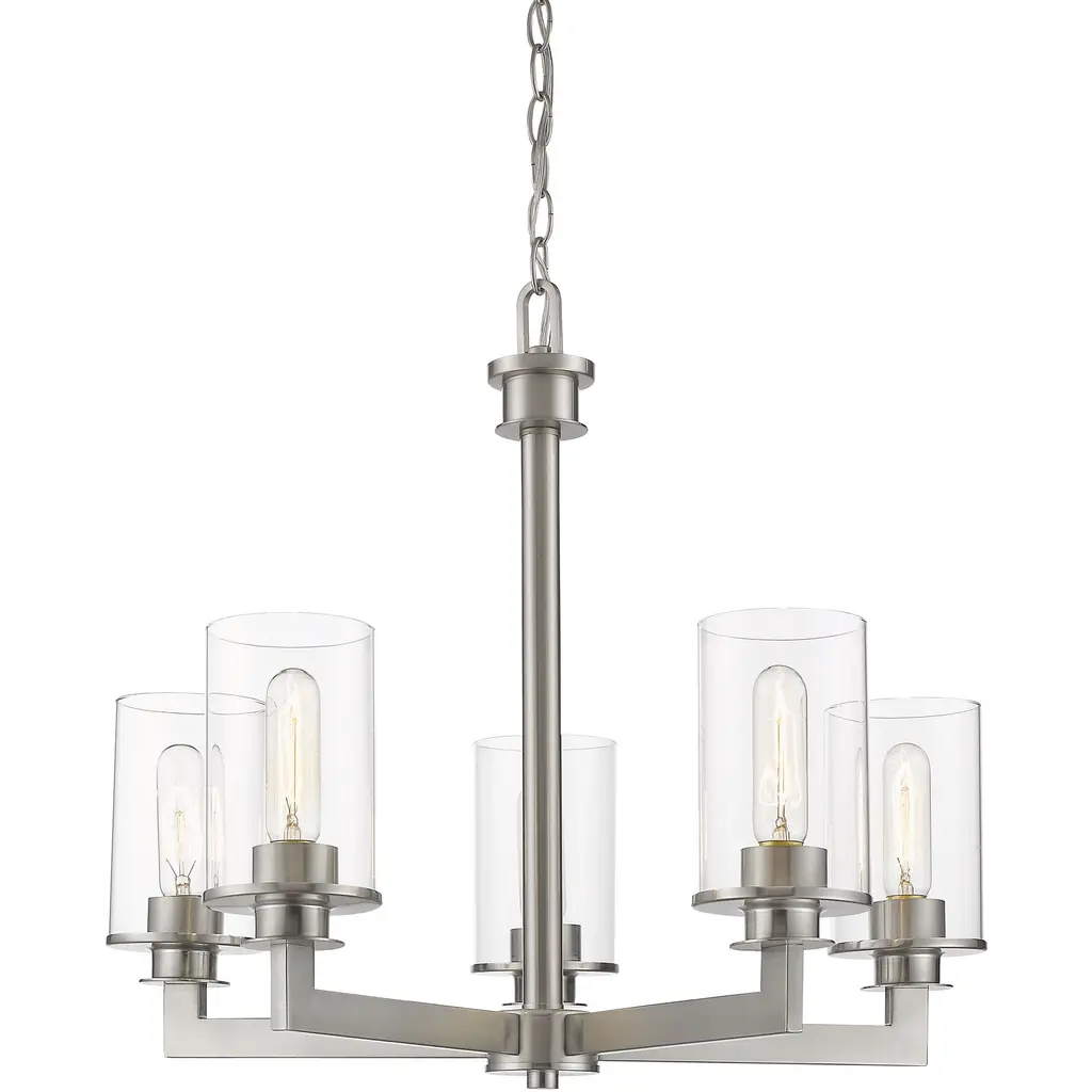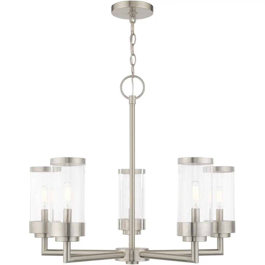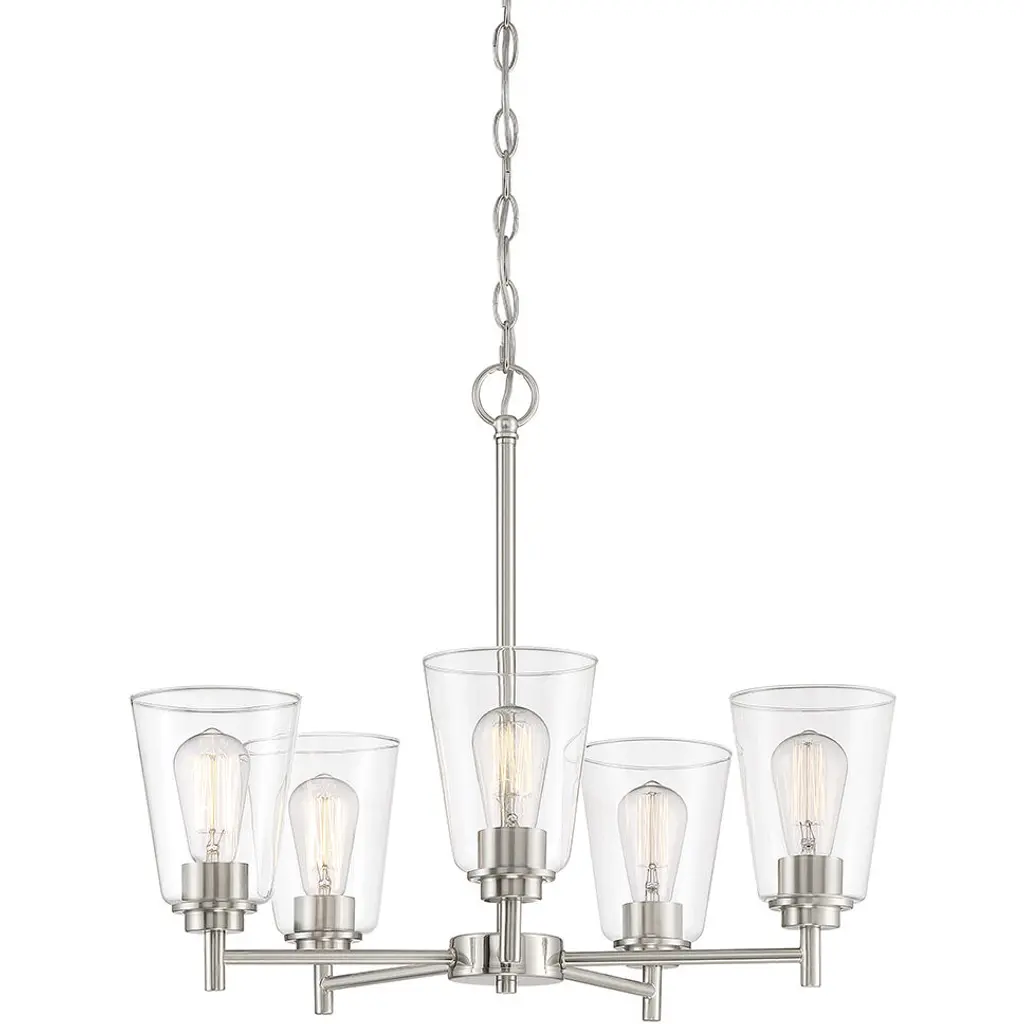 The Calhoun Collection is distinguished by simple lines that can easily enhance transitional and contemporary décor. Measuring 23" high x 25" wide, this five-light pendant offers a clean silhouette in a satin nickel finish and clear glass shades. It is illuminated by five 60-watt Edison-base bulbs. Material: Glass, Finish Color: Satin Nickel, Width: 25", Height: 23", Hanging Method: Chain, Chain Length: 120", Lamping Type: Incandescent, Number Of Bulbs: 5, Wattage: 300 Watts, Dimmable: Yes, Moisture Rating: Dry Rated