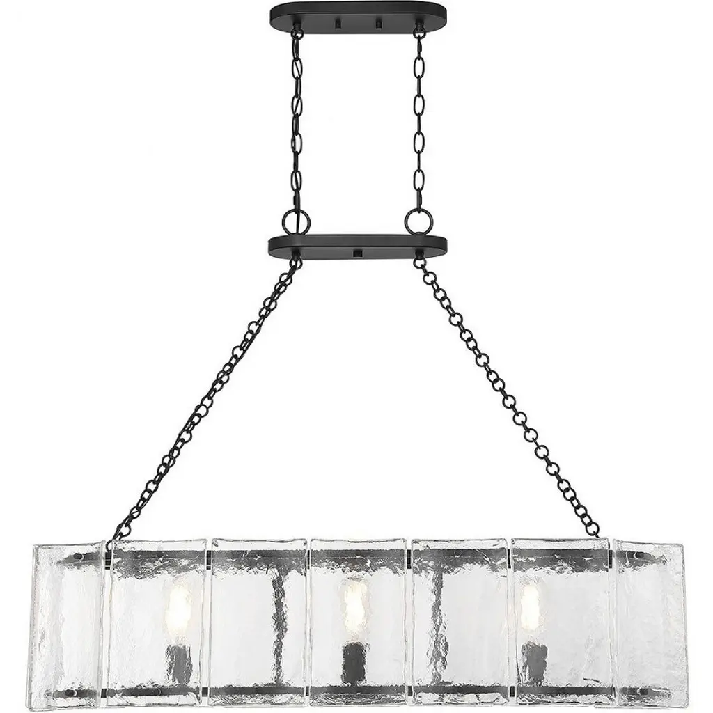 Bring a beautiful ocean-inspired lighting look to your home with the Savoy House Genry 3-light trestle. This linear design is decorated with rippling panes of handmade glass and finished in matte black. Genry is 33" in height, 41" in length and 13" in width. It uses 3 standard size bulbs of up to 60 watts per bulb (bulbs not included).