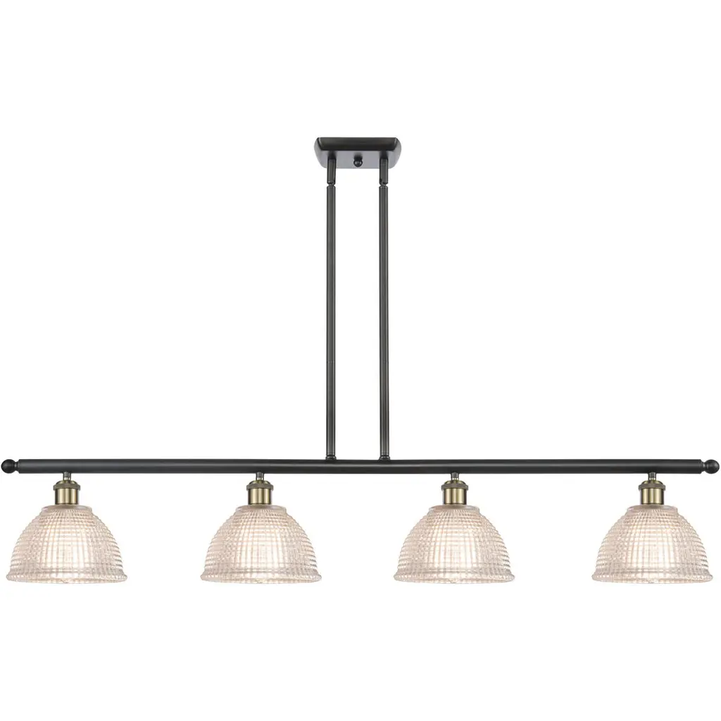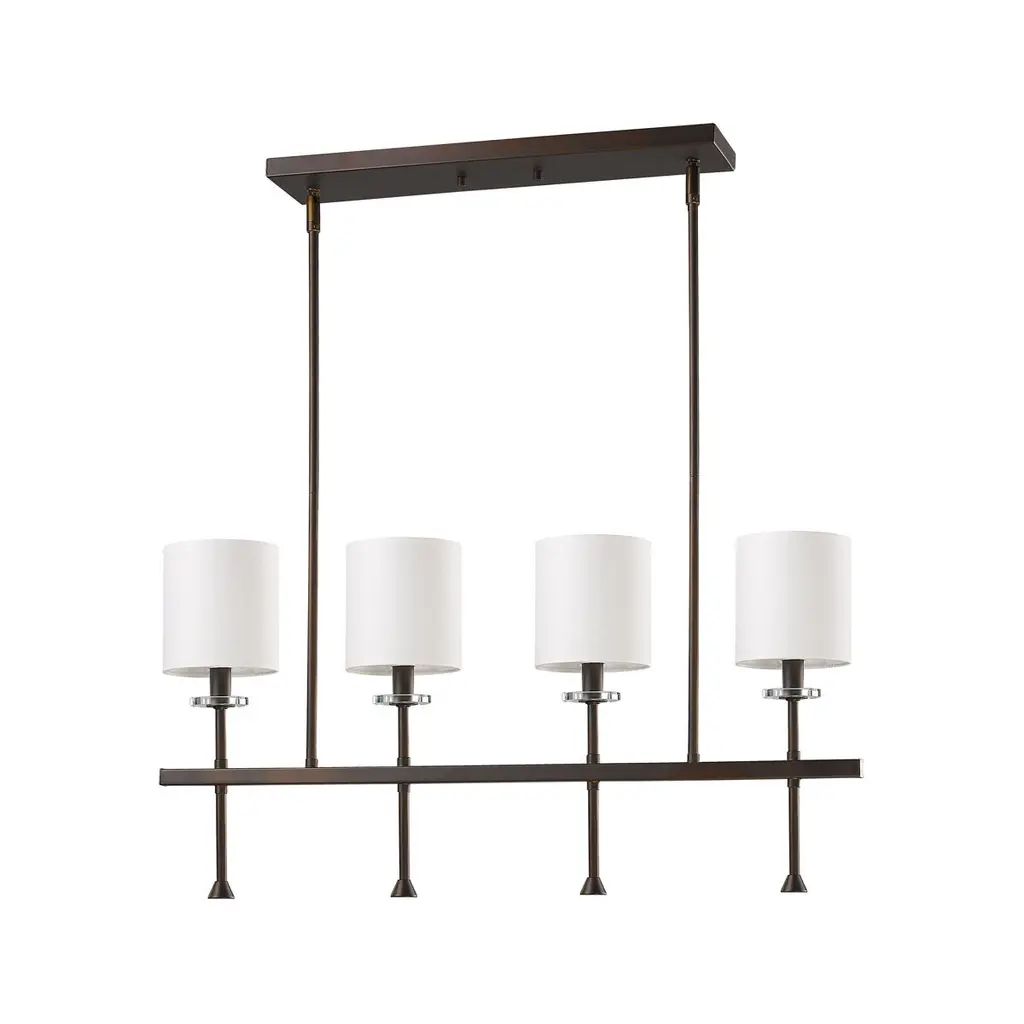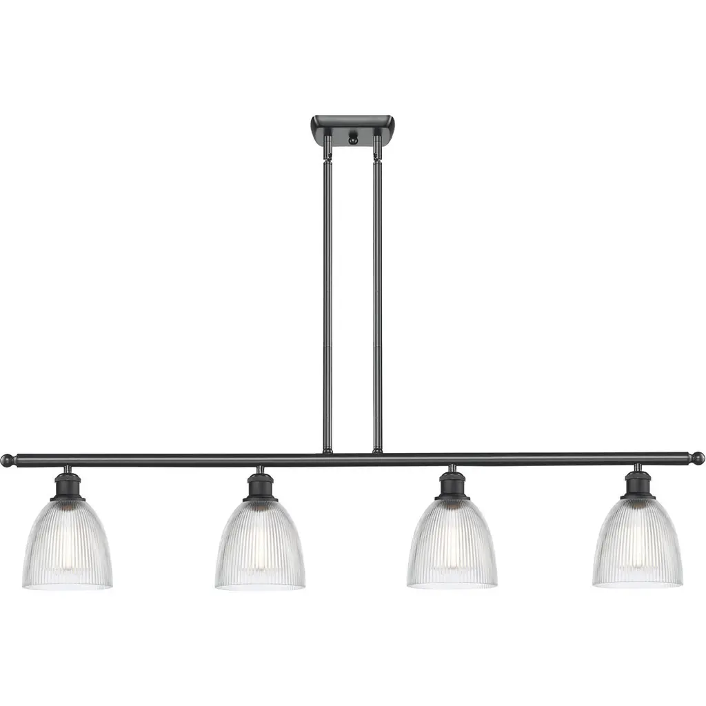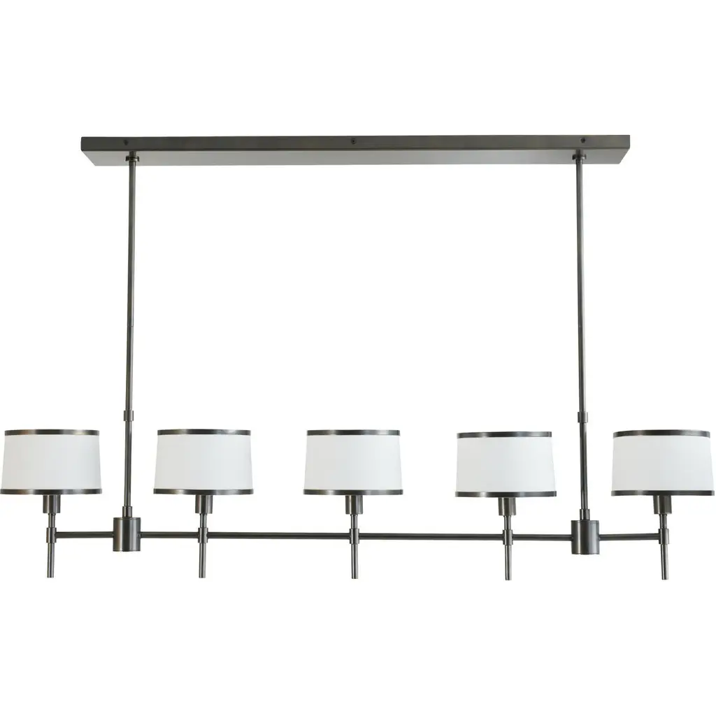 Whether you want to brighten up a dining room, illuminate a kitchen island or create a stylish game room, the classic Savoy House Haynes 5-light trestle is a great choice. Its tall, tapered white opal glass shades create a bright yet comfortable glow. The matte black finish goes with anything. It is 48" in length, 4" in width and has an adjustable height ranging from 16" to 70". Comes with eight 12" downrods and two 6" downrods. Uses 5 candelabra size bulbs of up to 60 watts per bulb (bulbs not included).