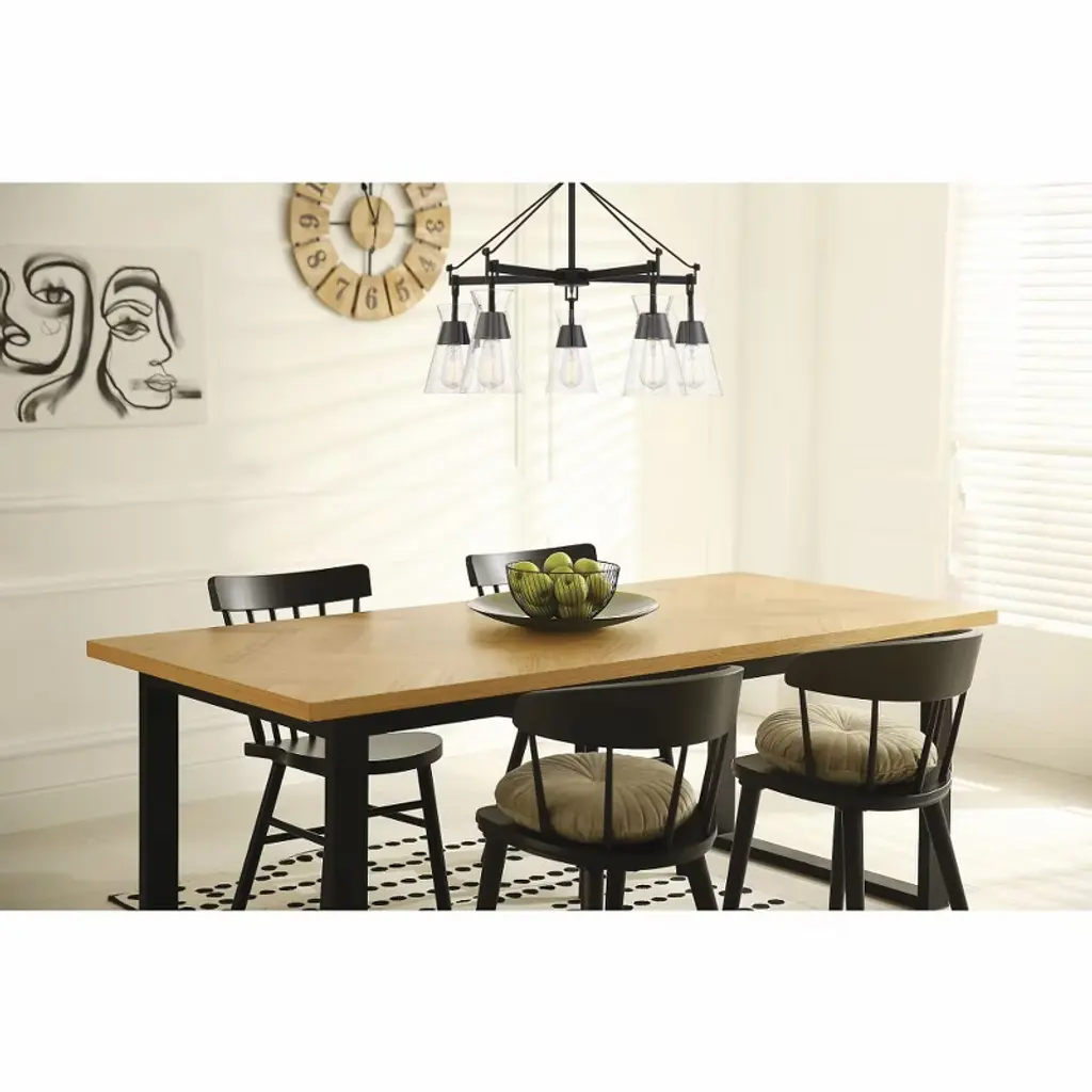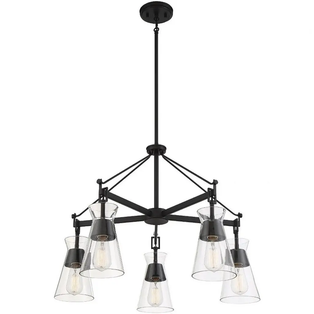 Conical shades of clear glass recall Italian midcentury modern lighting designs in the stylish Lakewood 5-light chandelier from Savoy House. The fixture is finished in bold matte black. Lakewood is 28" in diameter and has an adjustable height ranging from 20" to 74". It uses five standard size bulbs with a max of 60 watts per bulb. Comes with four 12" downrods and one 6" downrod, plus 80" of cord.