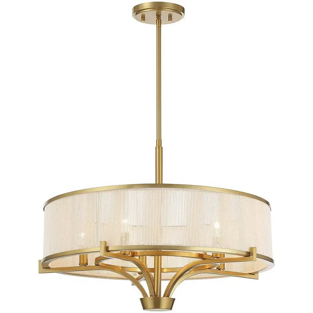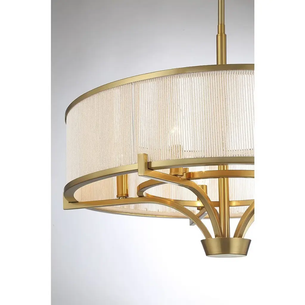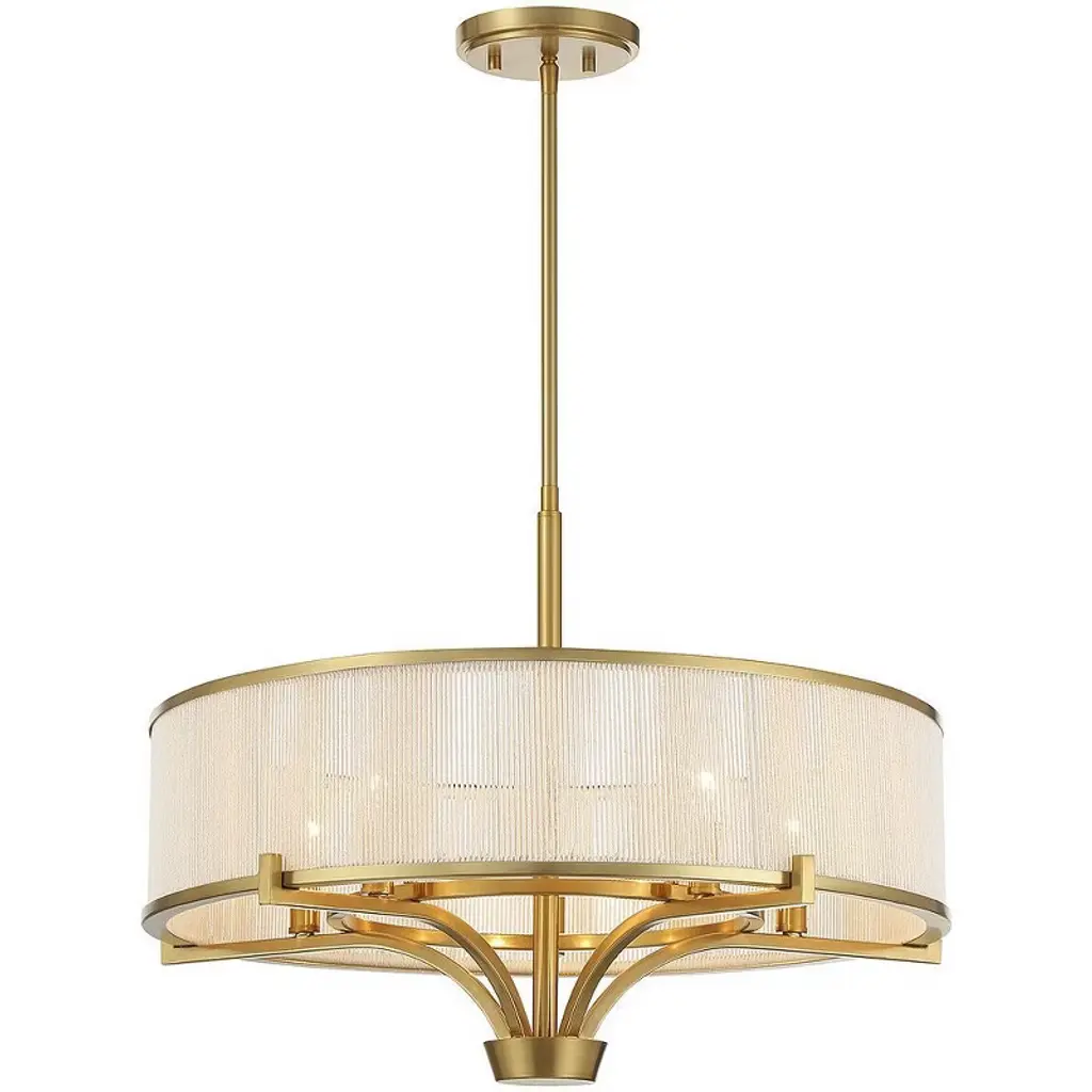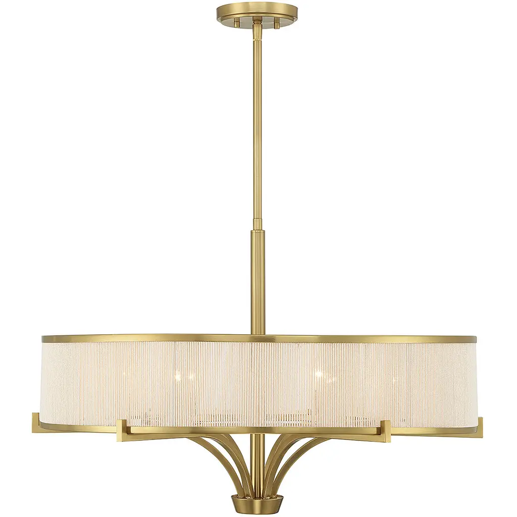 A boldly classic structure is given a touch of organic softness in this Savoy House Wynwood 5-light chandelier. Its shade showcases soft white string that, when combined with the warm brass finish, offers up a beautifully elegant effect. Wynwood is 24" in width and has an adjustable height ranging from 17.5" to 71.5". Comes with four 12" downrods and one 6" downrod. Uses 5 candelabra size bulbs of up to 60 watts per bulb (bulbs not included).