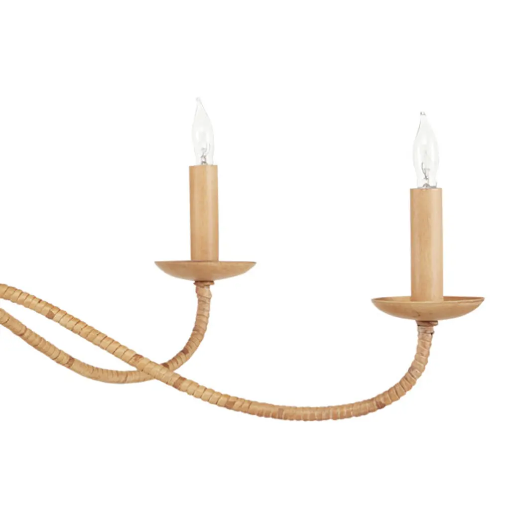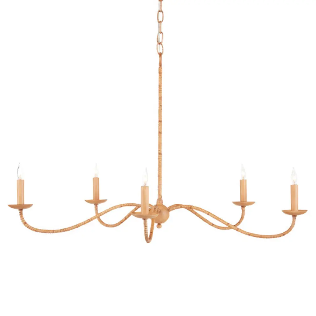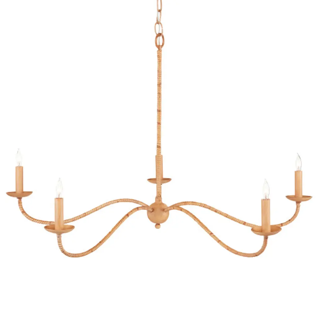 The Saxon Chandelier is a monumental rattan chandelier that is part of a long-standing popular design, available in various sizes and finishes. Its shape pays homage to a bygone era, yet its slender lines that arc gracefully and the natural rattan give it a modern profile. The chandelier is adjustable with the use of an included chain/rod kit/cable, allowing for a customizable drop length. If a longer drop is needed, additional chain/rods/cable can be purchased separately.