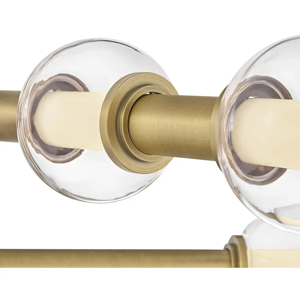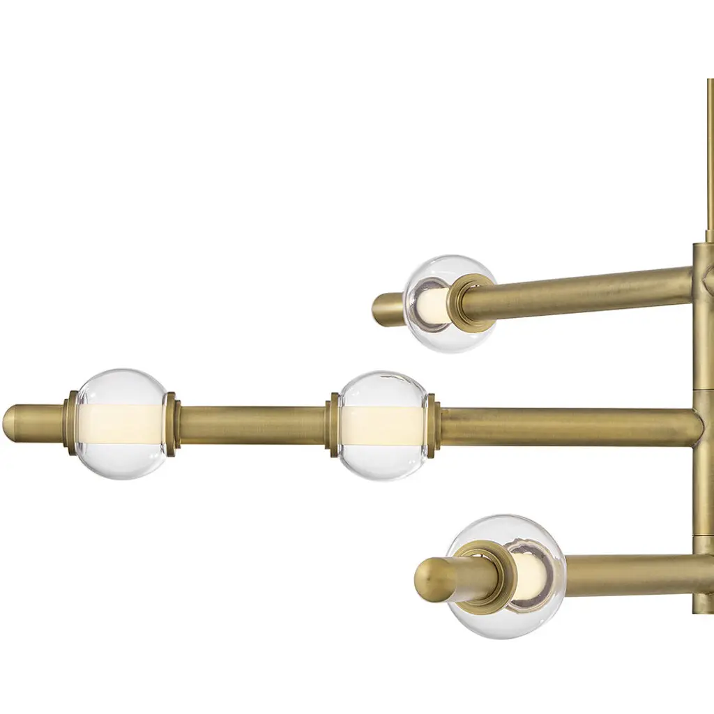 Boasting an iconic modern silhouette, Saxon showcases clear glass globs surrounding dimmable LED lamps on articulating mobile-style metal rods. Complete your living space with warm, functional light complemented by a Lacquered Brass finish.