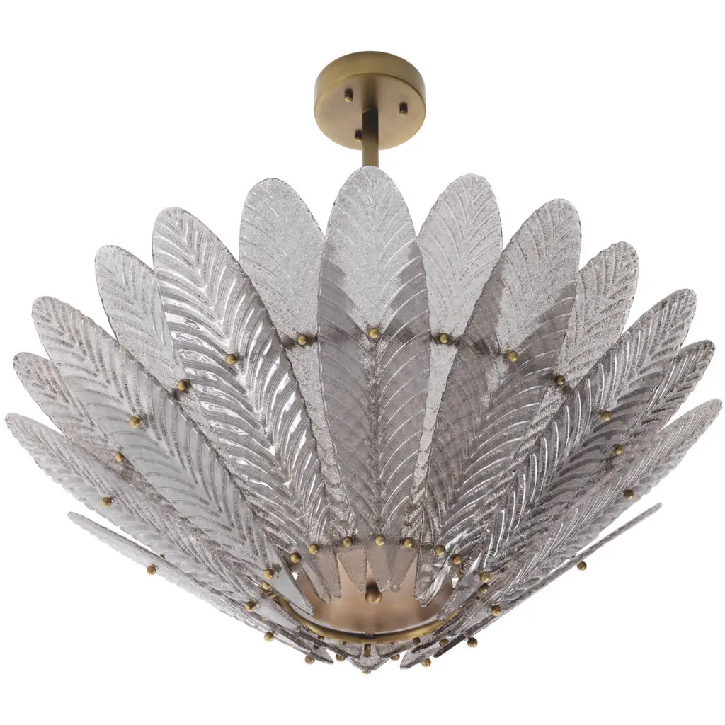 Exuding the look and feel of 1950s designer lighting, Chandelier Scala stands out by its lovely floral shape. Provided with an Antique brass finish, this Mid-Century Modern ceiling pendant is suspended from a rod and matching canopy. The fixture is adorned with a shade that is made up of âflower petals' of translucent handmade glass. Each petal features an engraved vein pattern.