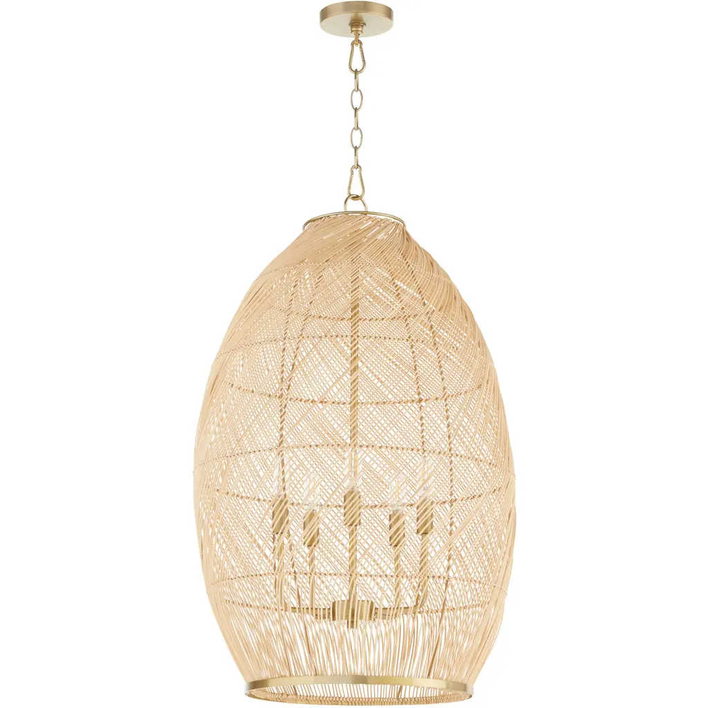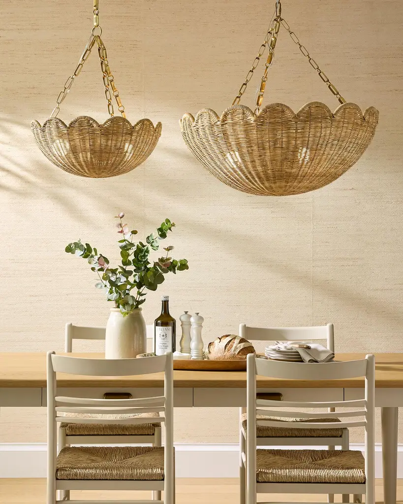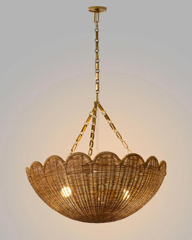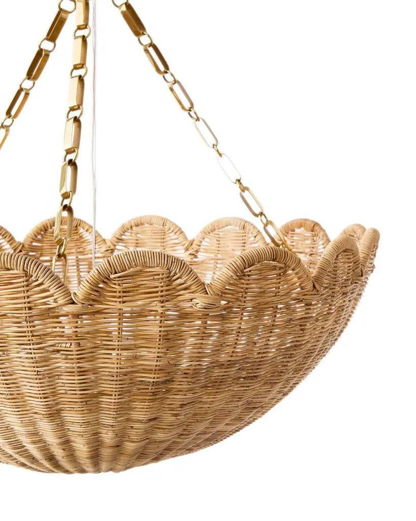 \A rounded dome in winsome wicker with a delicate scalloped edge. Suspended by an antique brass bracelet chain.