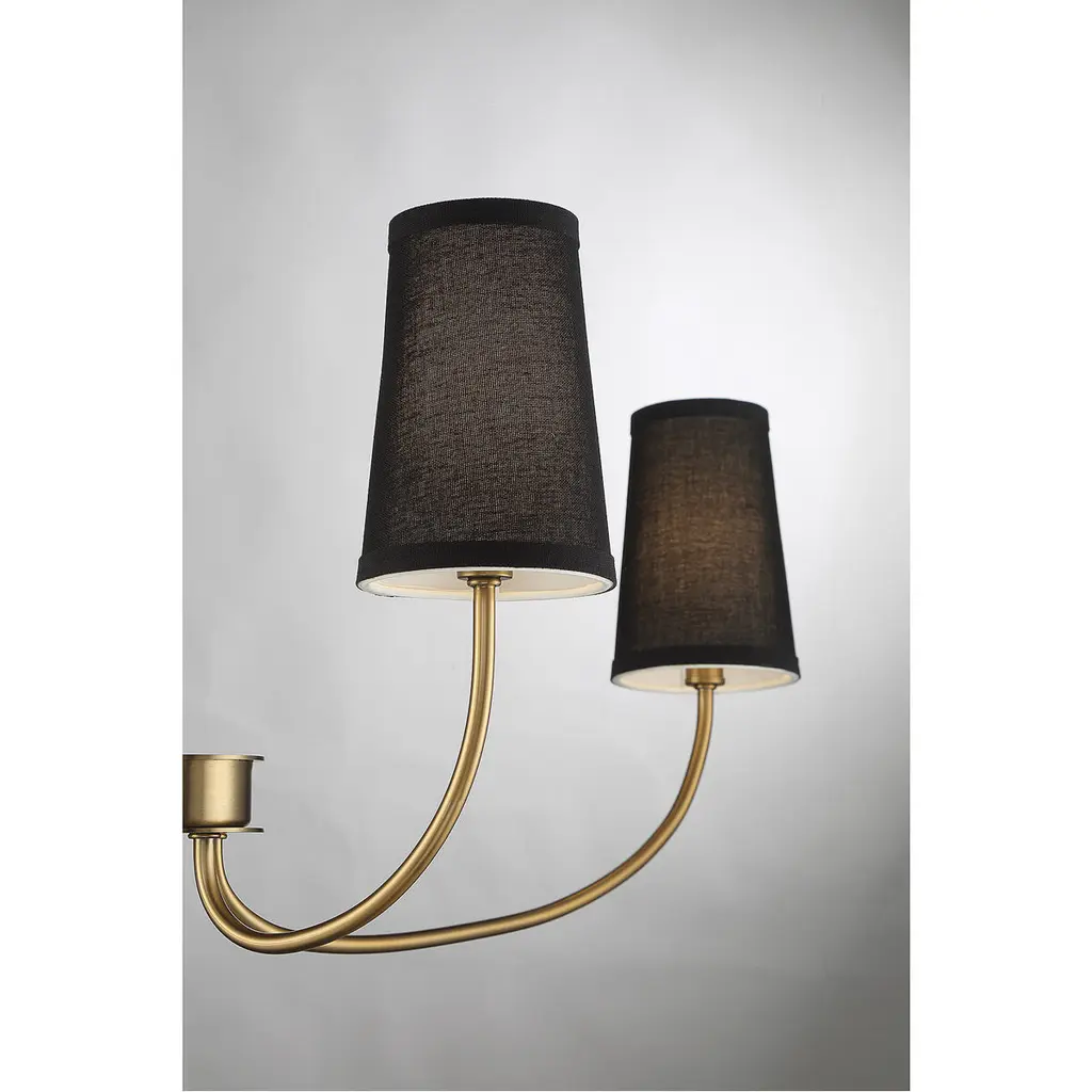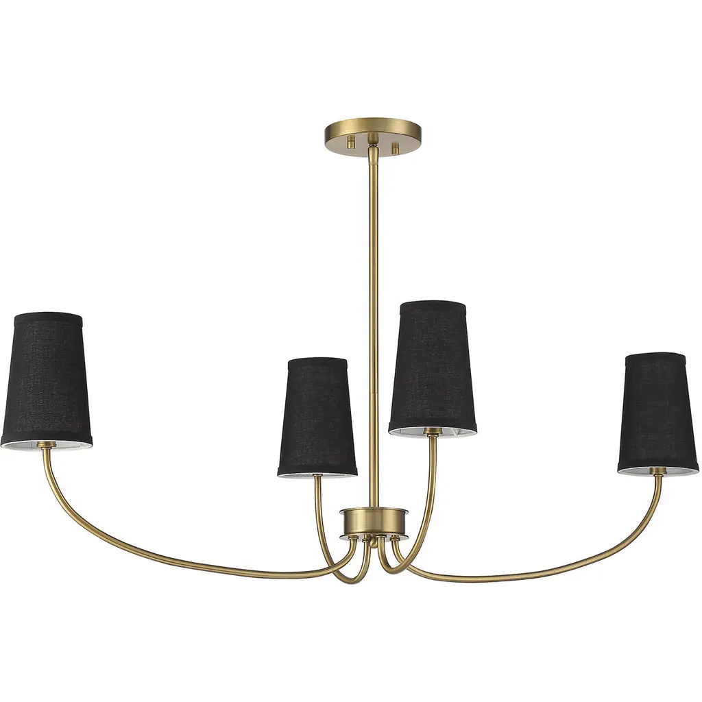 Bring a touch of midcentury modern inspiration to your home with this fashionable Meridian 4-light linear chandelier. It features curving arms in a natural brass finish and conical shades of black fabric for a bold two-tone allure. 19" height, 38" width. Max height 73". Max 40 watts per bulb, candelabra size C11 bulbs recommended. LED bulb compatible.
