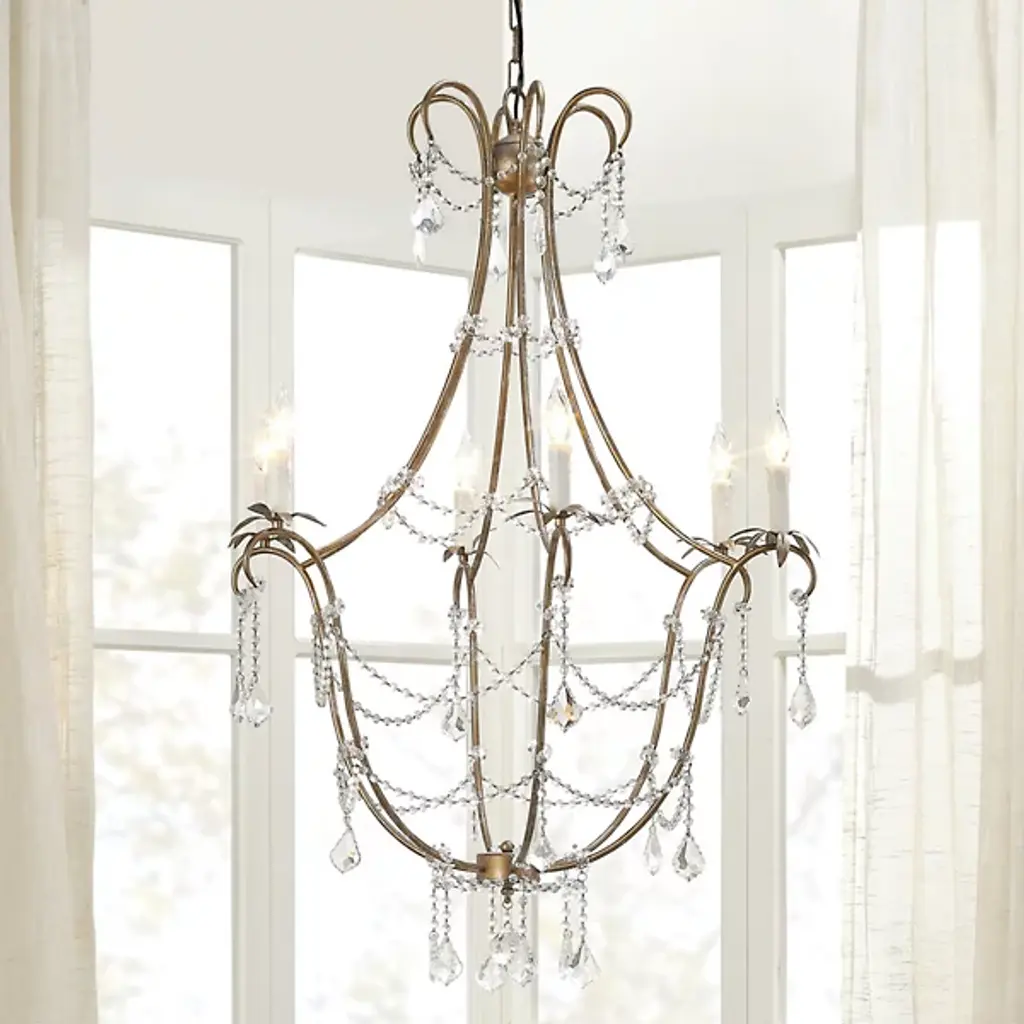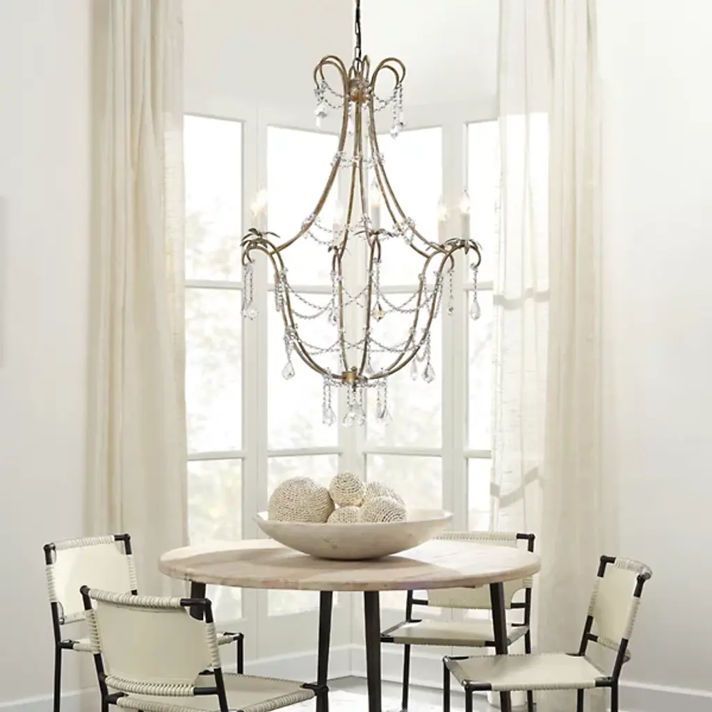 The Scarlett Chandelier from Jamie Young Co. suspends overhead as a glamorous showstopper, pairing artisanal ironwork and clean-cut crystal jewels. Chains of crystal beading are woven and draped across the scrolling structure for a shimmering, ethereal display. A group of candle-inspired lamp holders perches over iron blooms, giving this fixture a botanical touch. Candelabra lamping creates attractive drama by adding fine highlights and a spacious glow.