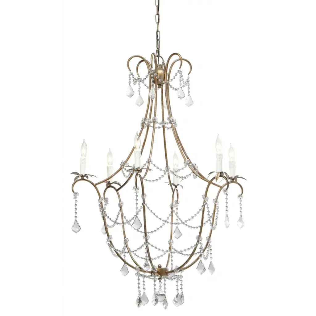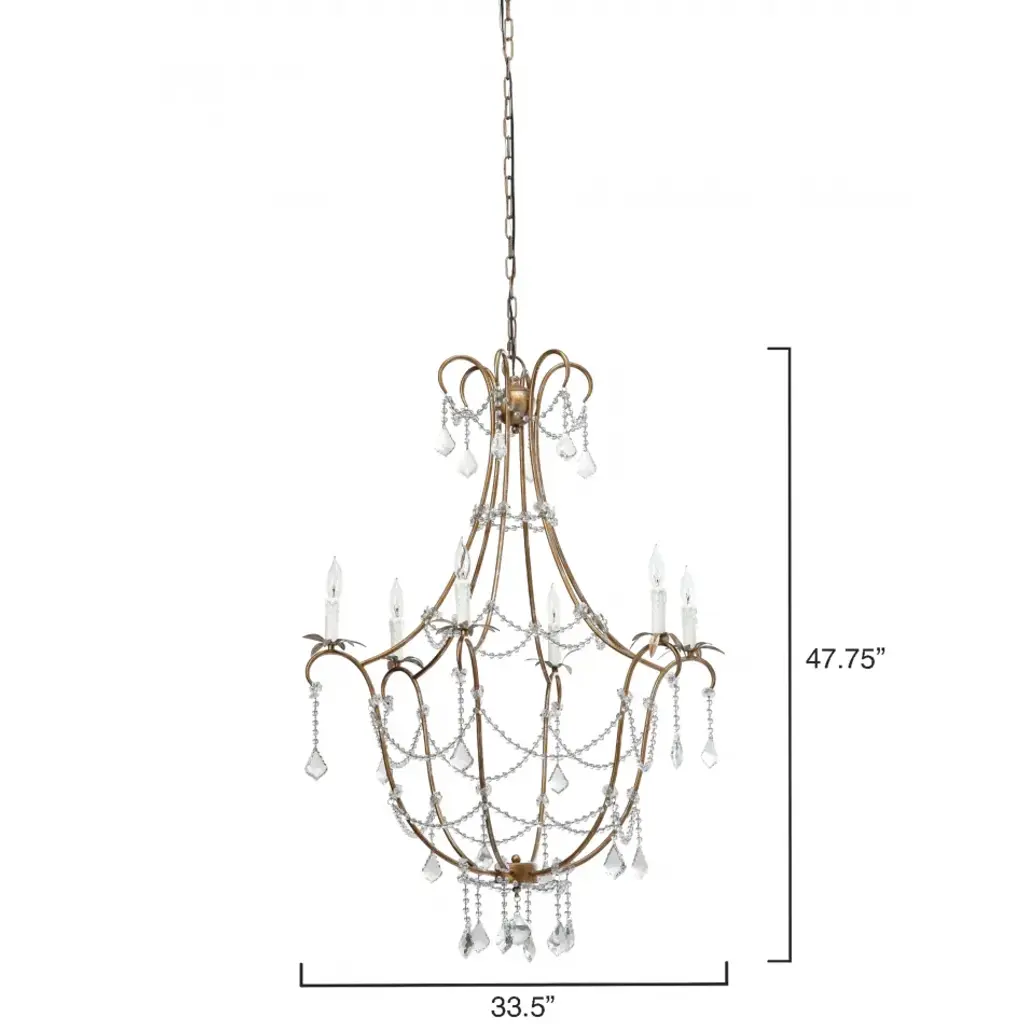 This chandelier screams "glamorous" from the tip of the ironwork to the ends of the cut crystal jewels dripping below. Hand-forged or iron, this fixture features faux dripping candles perched on iron blooms and is suspended from an adjustable iron chain. Create an eye-catching focal point in your home and brighten up a dim room all at once! Professional installation is recommended.