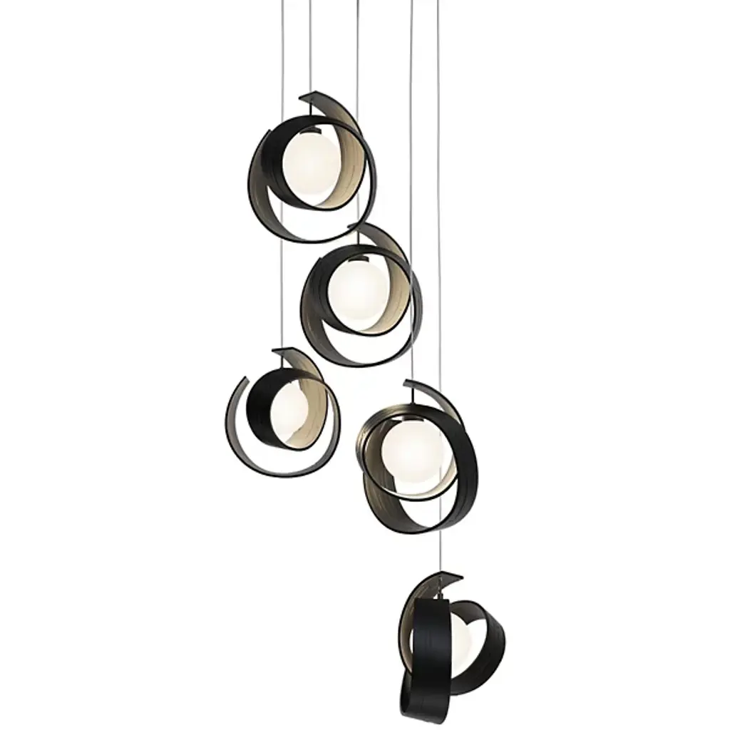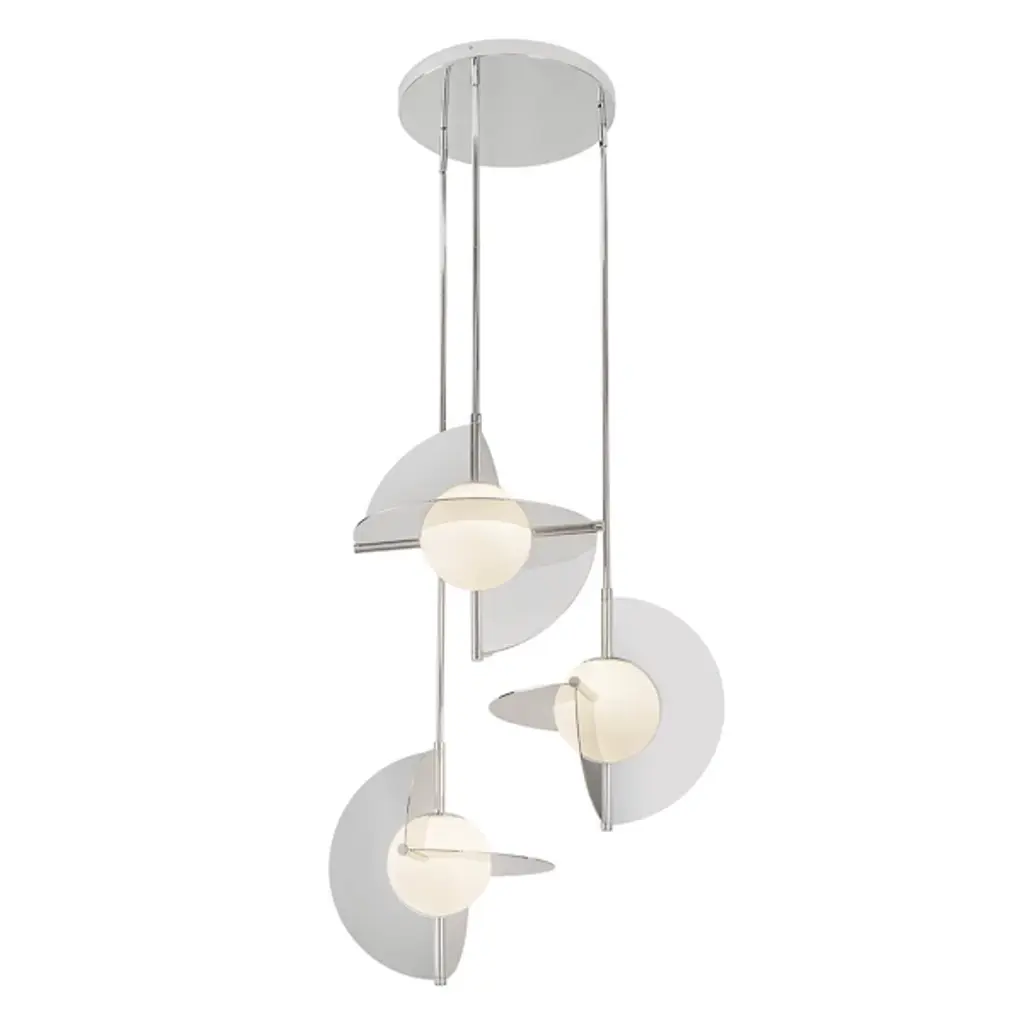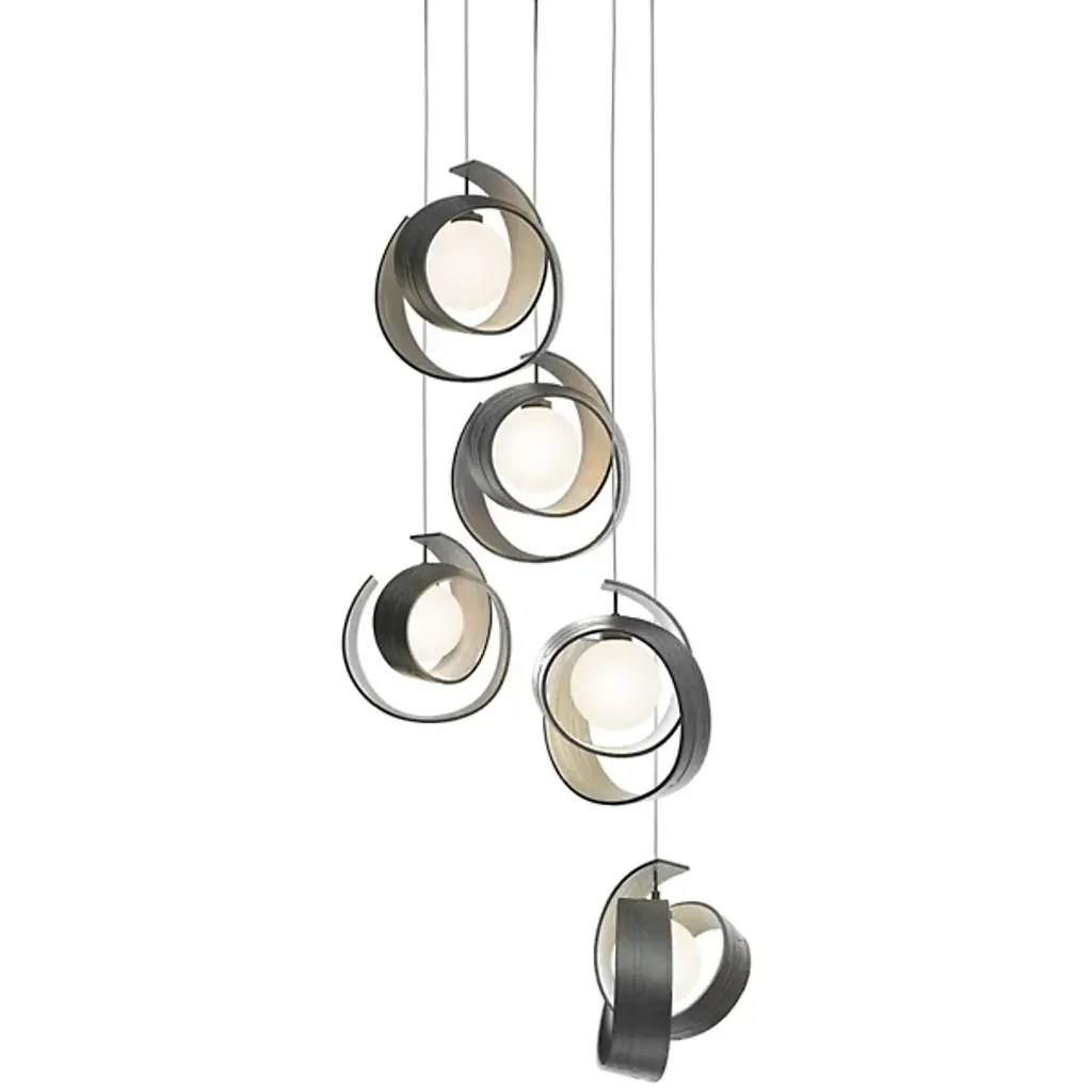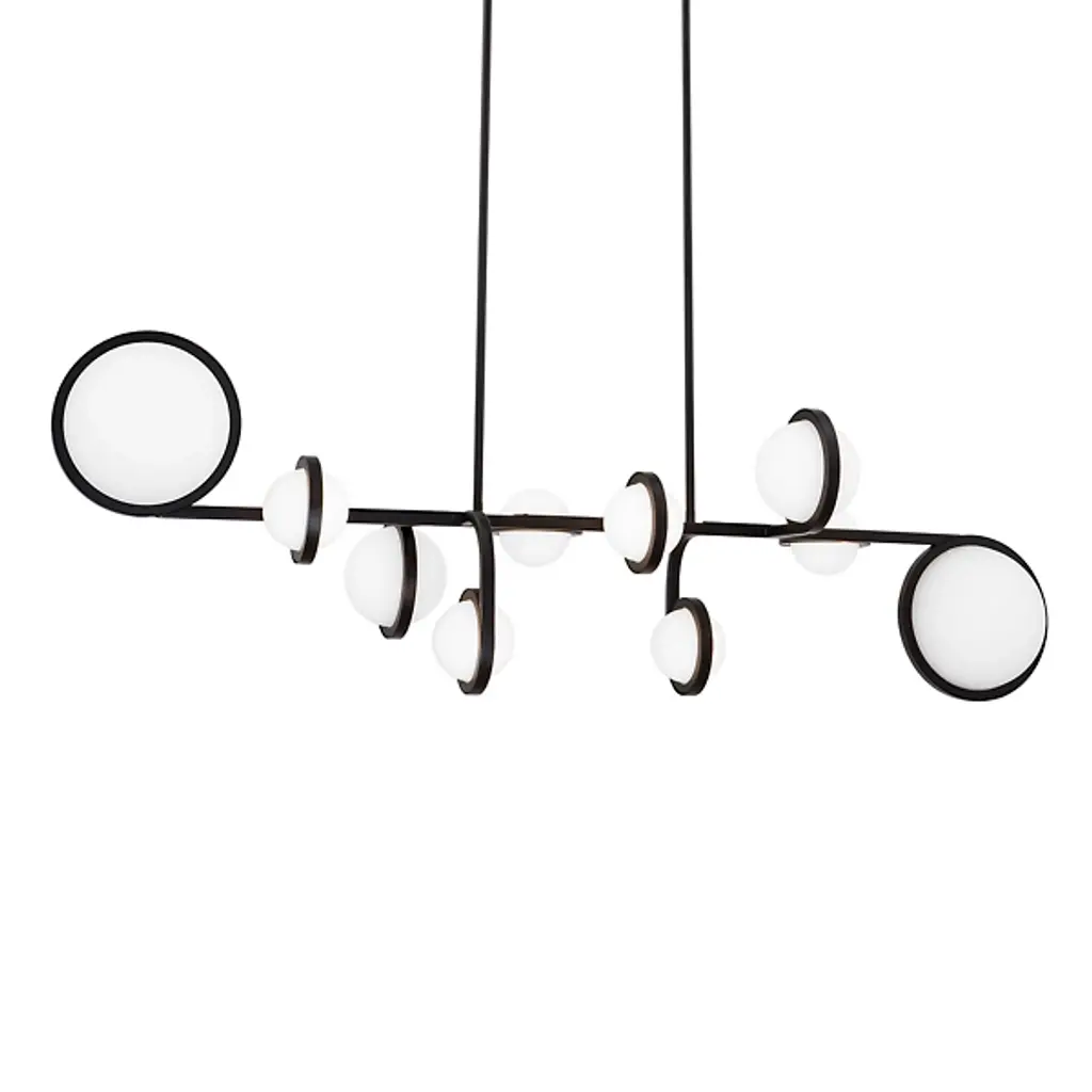 The Scorpio LED Chandelier from Kuzco Lighting surrounds opal glass with geometric metal loops that catch and reflect ambient light. Each view reveals a different aspect of Ryan Pauly's multidimensional design as you move around the room. Aluminum and steel construction provide structure, and the opal glass shade softens the omnidirectional LED illumination. Spaces with 18-degree sloped ceilings accommodate this rod-mounted fixture without compromising its balanced composition. Dining rooms and foyers gain an architectural element that changes throughout the day as natural light shifts and evolves. This chandelier challenges conventional overhead lighting with its open framework that plays with perception and depth.