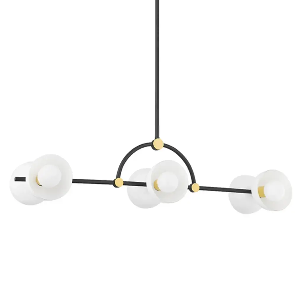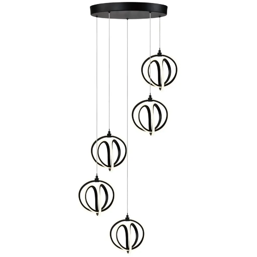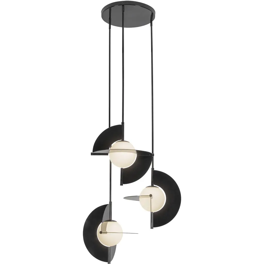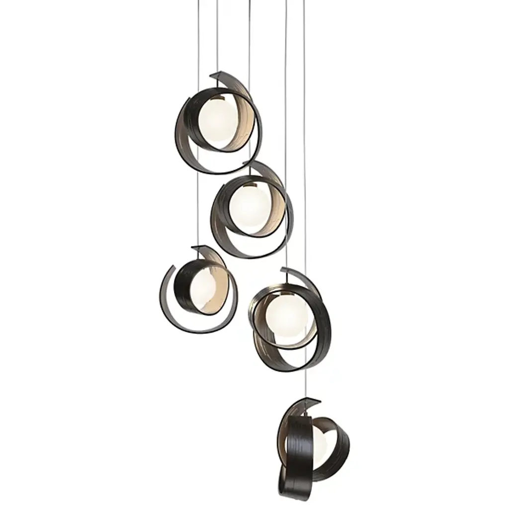 The Scorpio LED Chandelier from Kuzco Lighting surrounds opal glass with geometric metal loops that catch and reflect ambient light. Each view reveals a different aspect of Ryan Pauly's multidimensional design as you move around the room. Aluminum and steel construction provide structure, and the opal glass shade softens the omnidirectional LED illumination. Spaces with 18-degree sloped ceilings accommodate this rod-mounted fixture without compromising its balanced composition. Dining rooms and foyers gain an architectural element that changes throughout the day as natural light shifts and evolves. This chandelier challenges conventional overhead lighting with its open framework that plays with perception and depth.