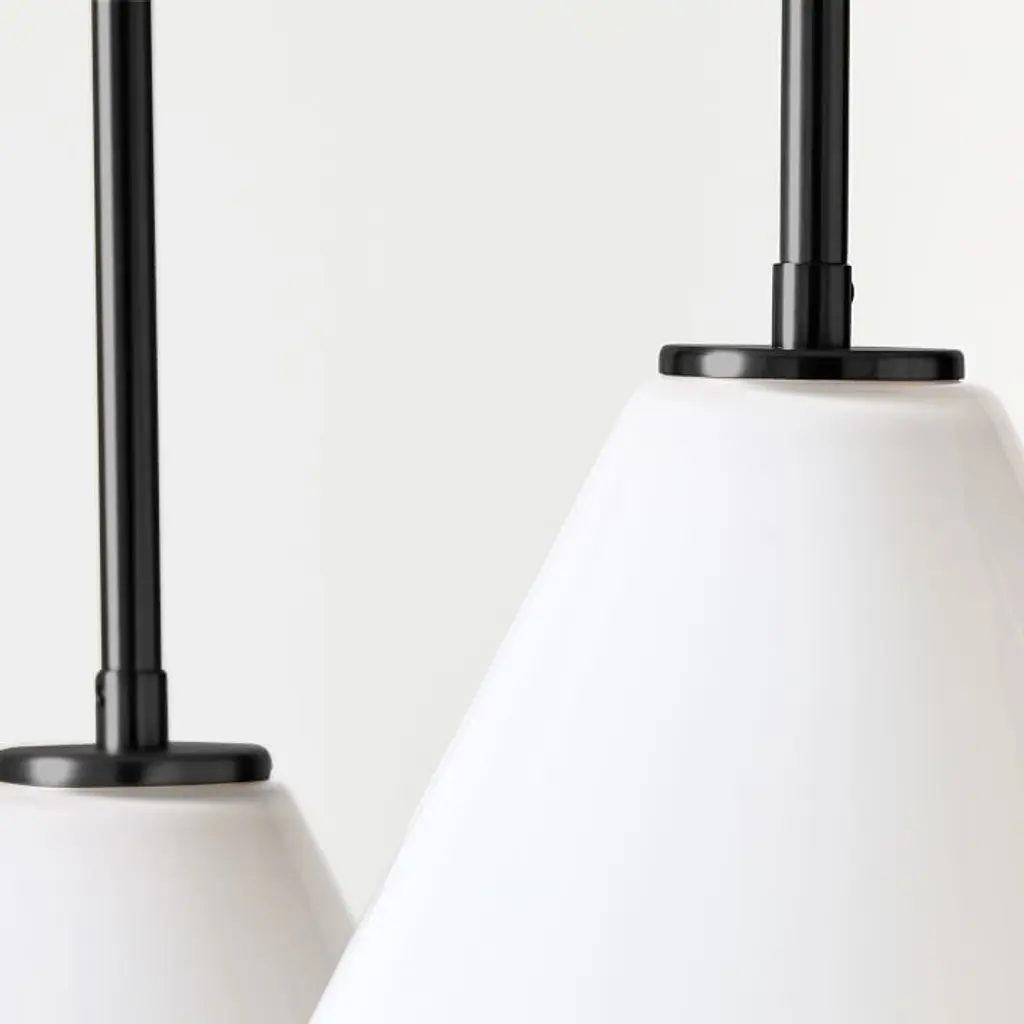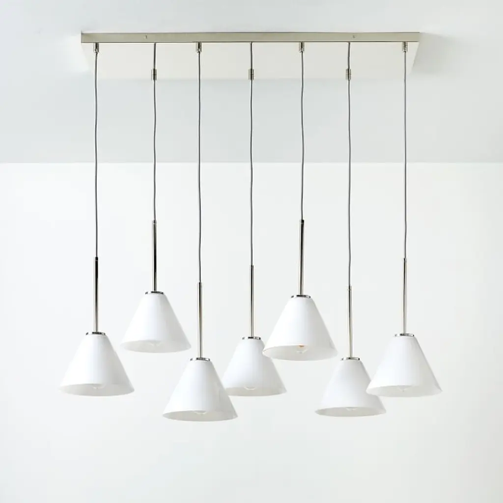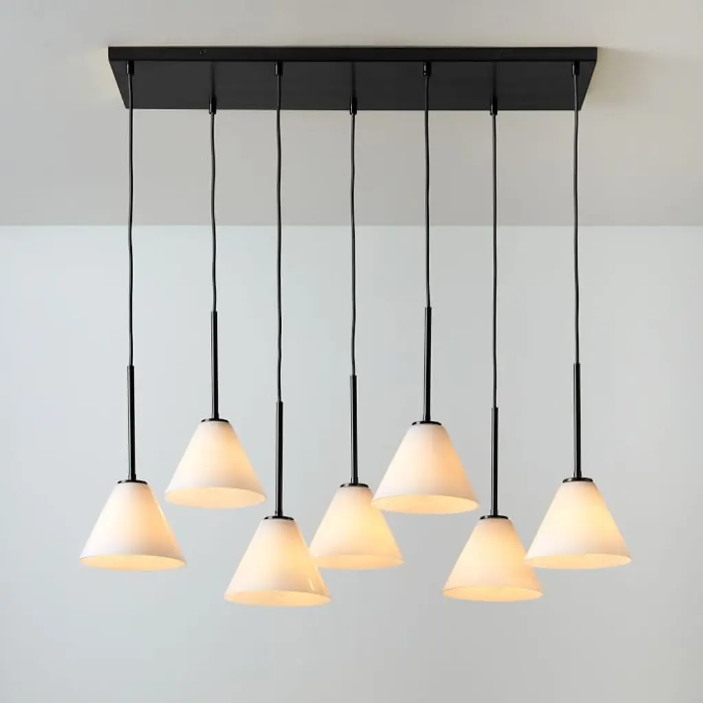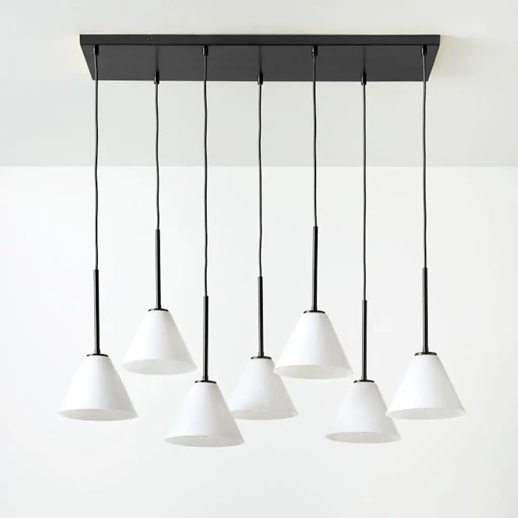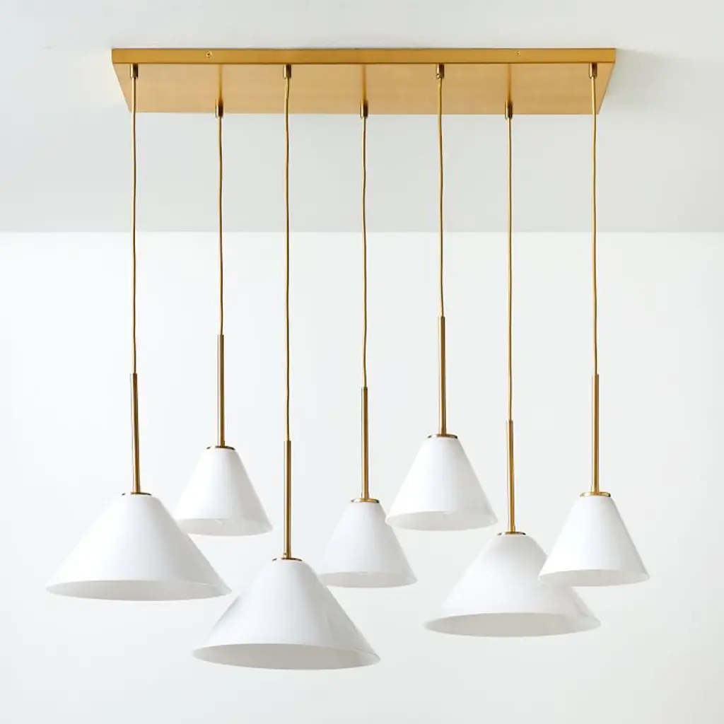 Create lighting with a custom feel with our Sculptural Glass collection. Part of our biggest lighting collection yet, this chandelier's cone shades in milk glass get a glowing review in any space. Metal canopy. Glass shades. Adjustable height. Hardwired. UL listed. E26 socket. Accommodates seven 60W incandescent bulbs or LED equivalent. May be paired with dimmer switch (sold separately). Make the switch to energy-efficient LED lighting. Learn more. Made in China.