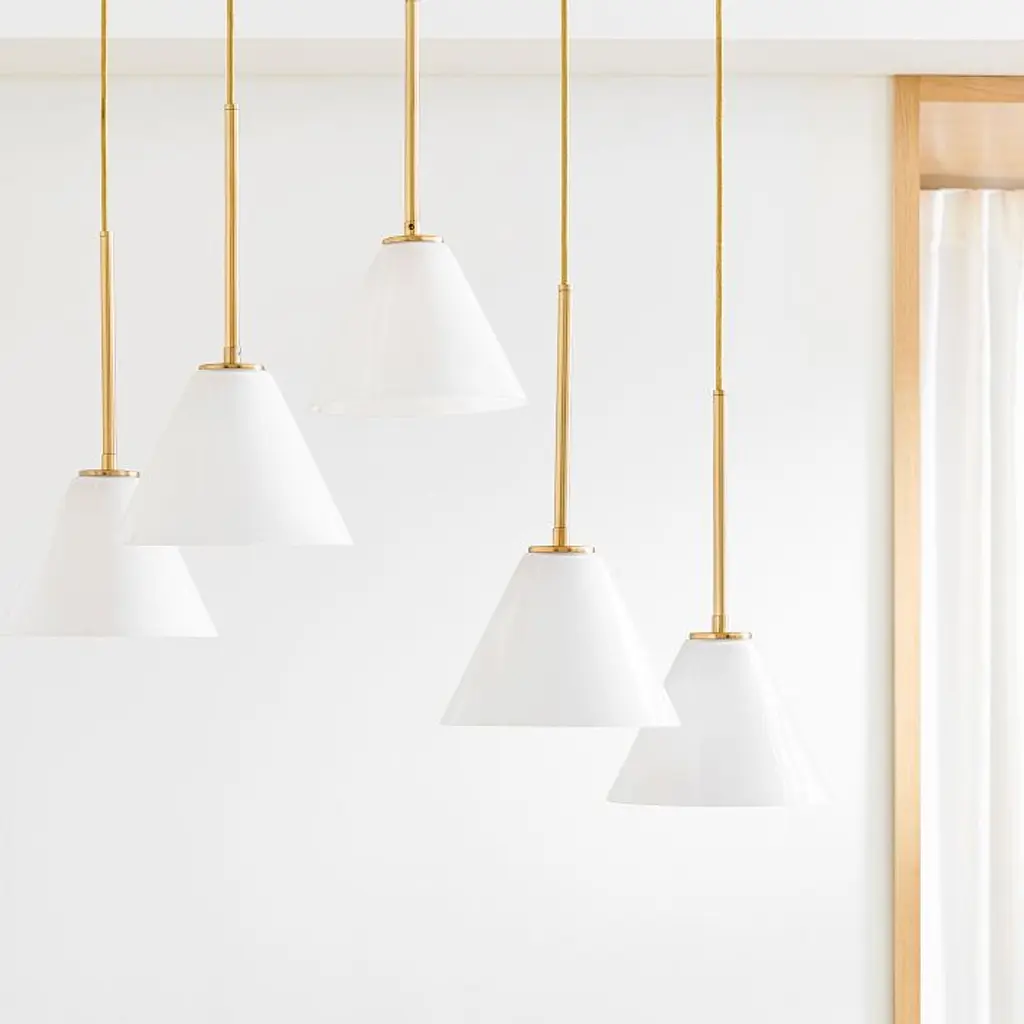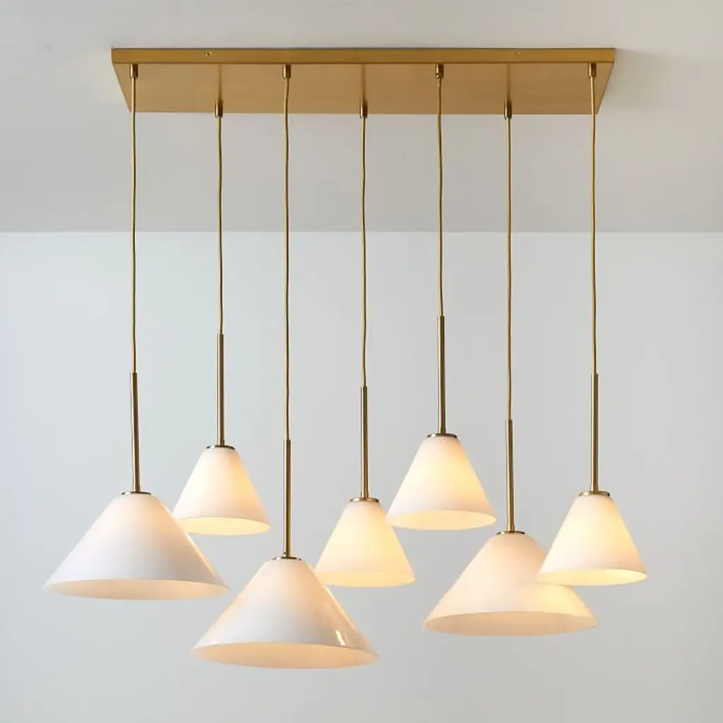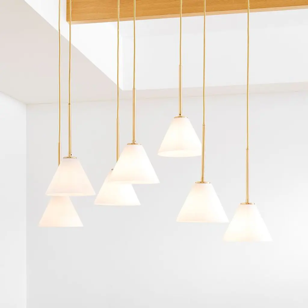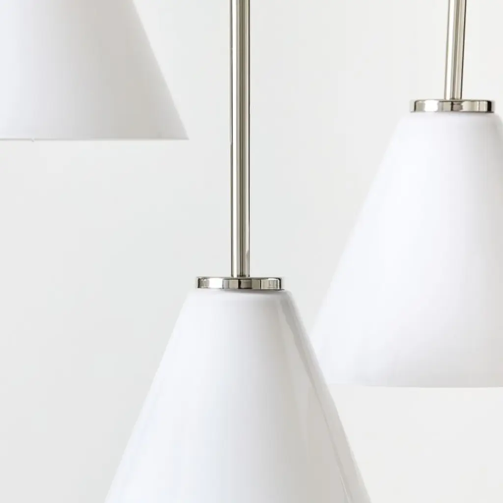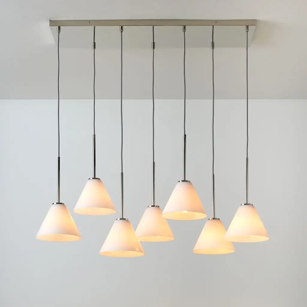 Create lighting with a custom feel with our Sculptural Glass collection. Part of our biggest lighting collection yet, this chandelier's cone shades in milk glass get a glowing review in any space. Metal canopy. Glass shades. Adjustable height. Hardwired. UL listed. E26 socket. Accommodates seven 60W incandescent bulbs or LED equivalent. May be paired with dimmer switch (sold separately). Make the switch to energy-efficient LED lighting. Learn more. Made in China.