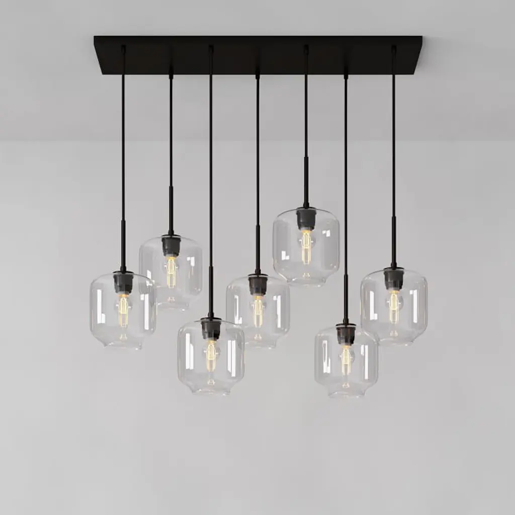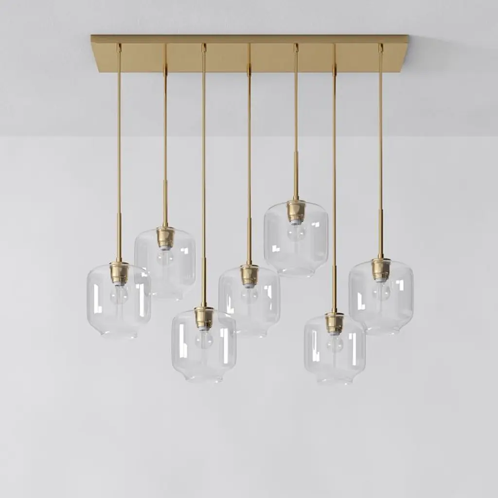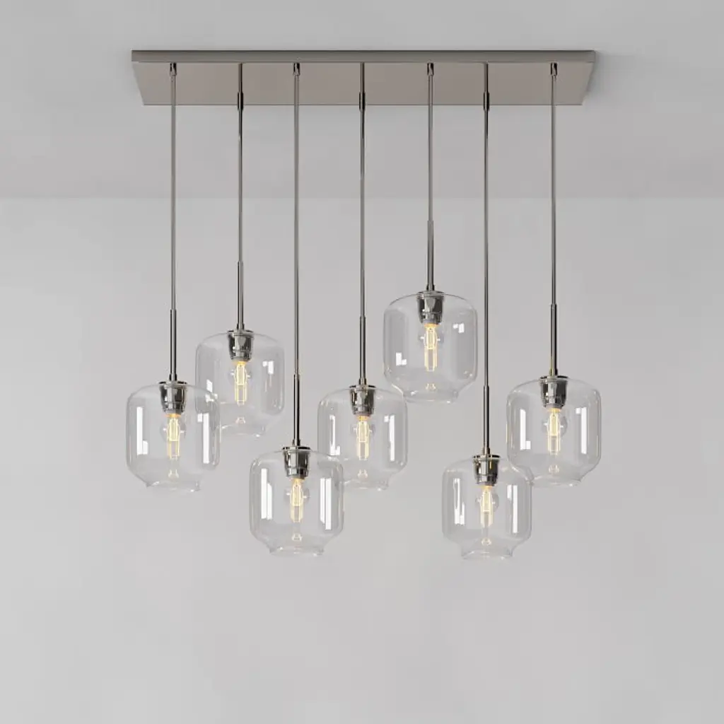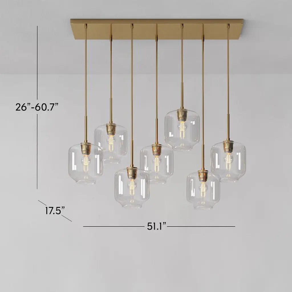 Metal canopy. Glass shades. Adjustable height. Hardwired. May be paired with dimmer switch (sold separately). Sold individually. UL listed. E26 socket. Accommodates seven 60W incandescent bulbs or LED equivalent. Make the switch to energy-efficient LED lighting. Learn more. Imported.