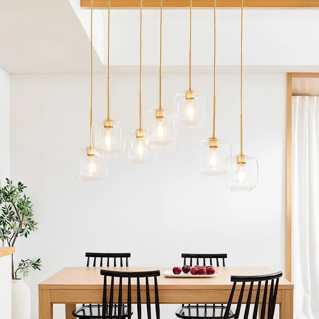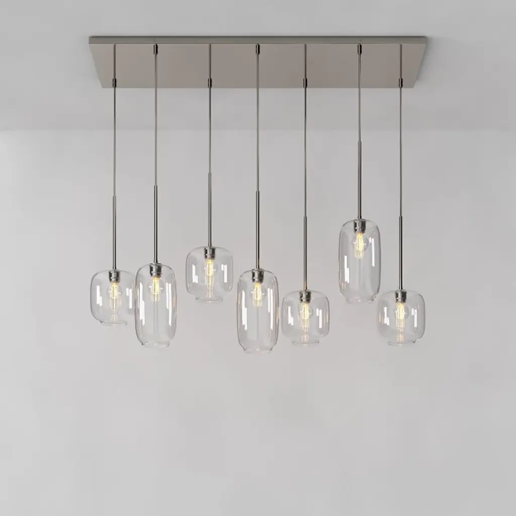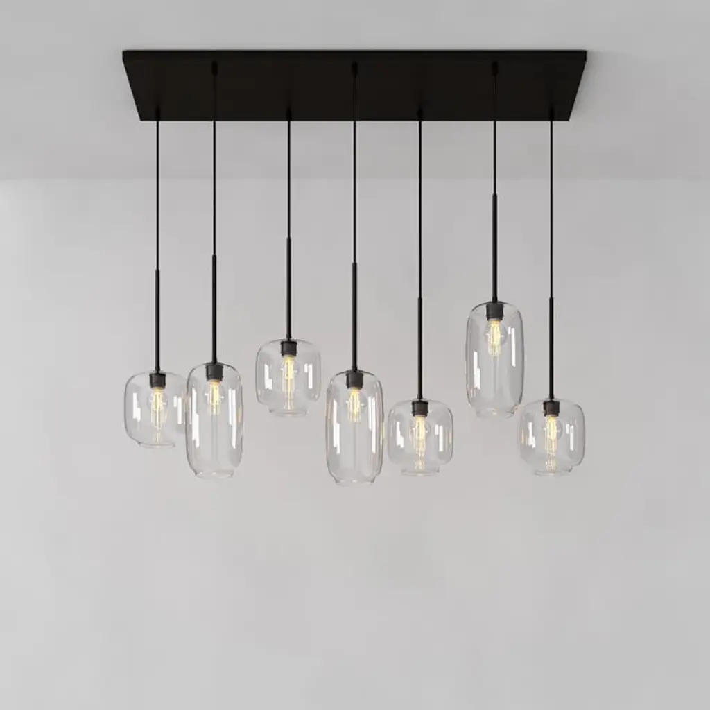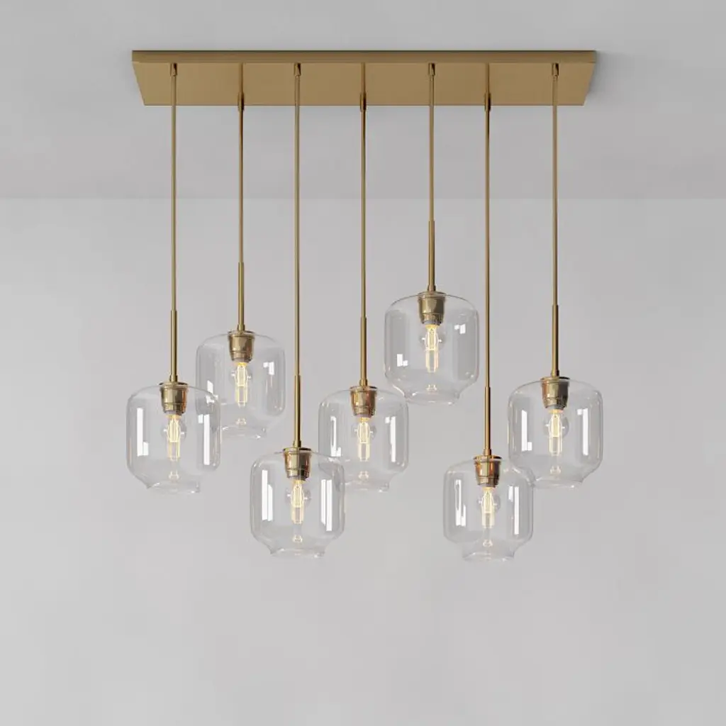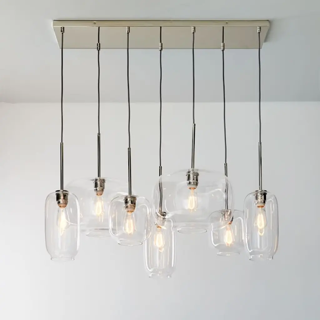 Metal canopy. Glass shades. Adjustable height. Hardwired. May be paired with dimmer switch (sold separately). Sold individually. UL listed. E26 socket. Accommodates seven 60W incandescent bulbs or LED equivalent. Make the switch to energy-efficient LED lighting. Learn more. Imported.