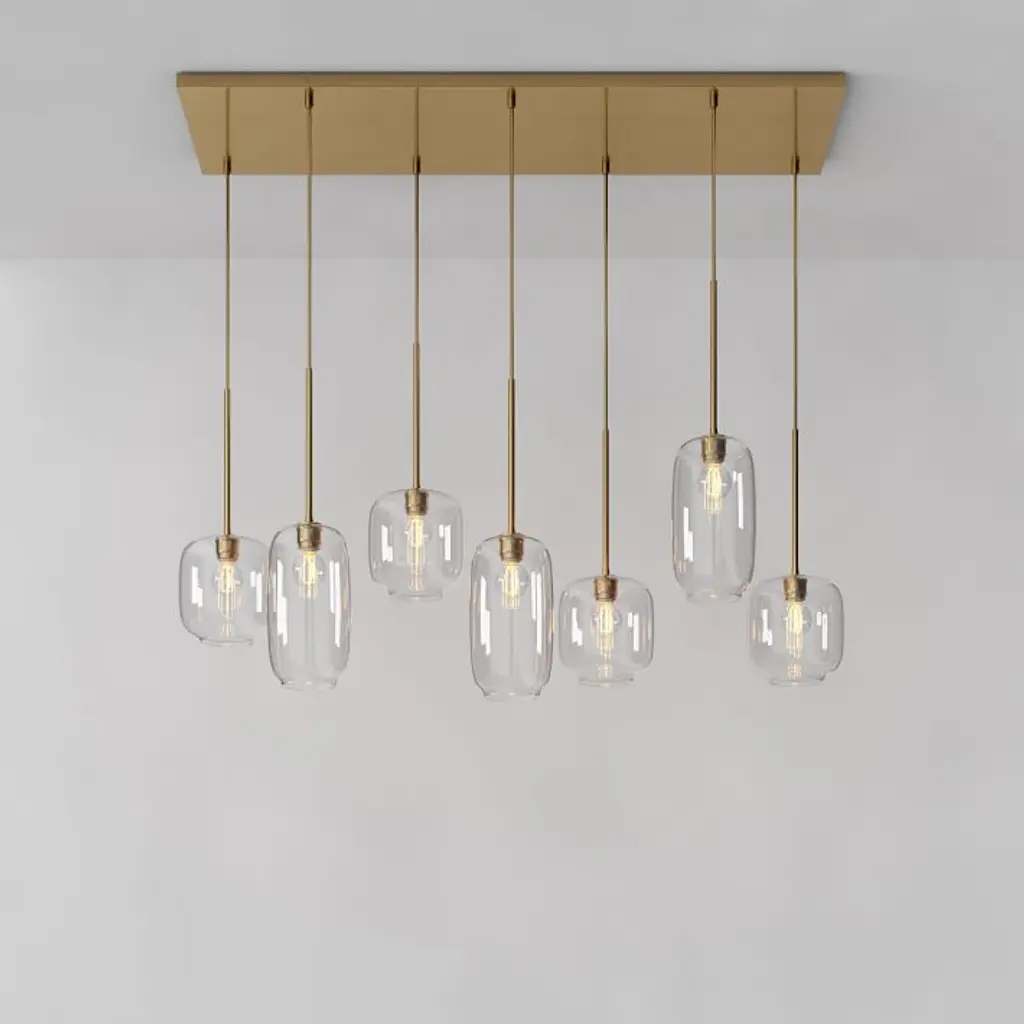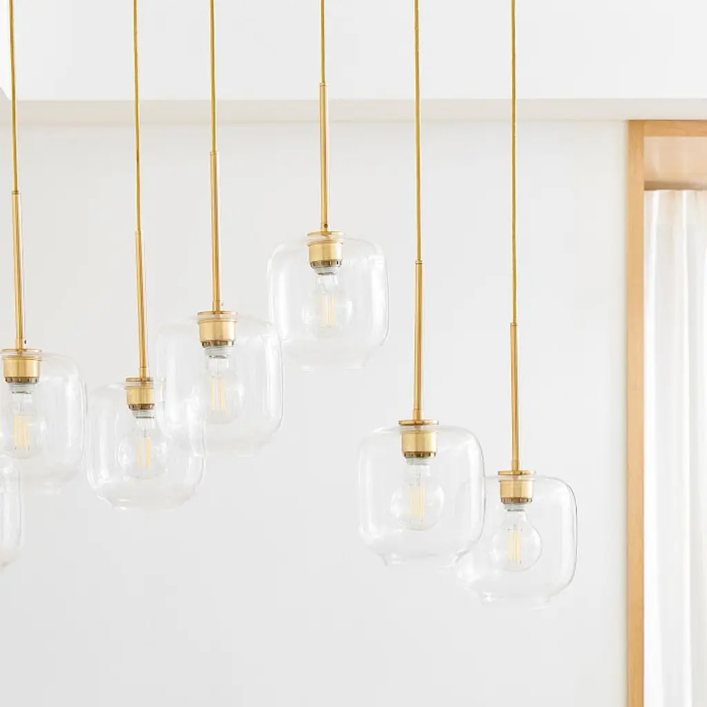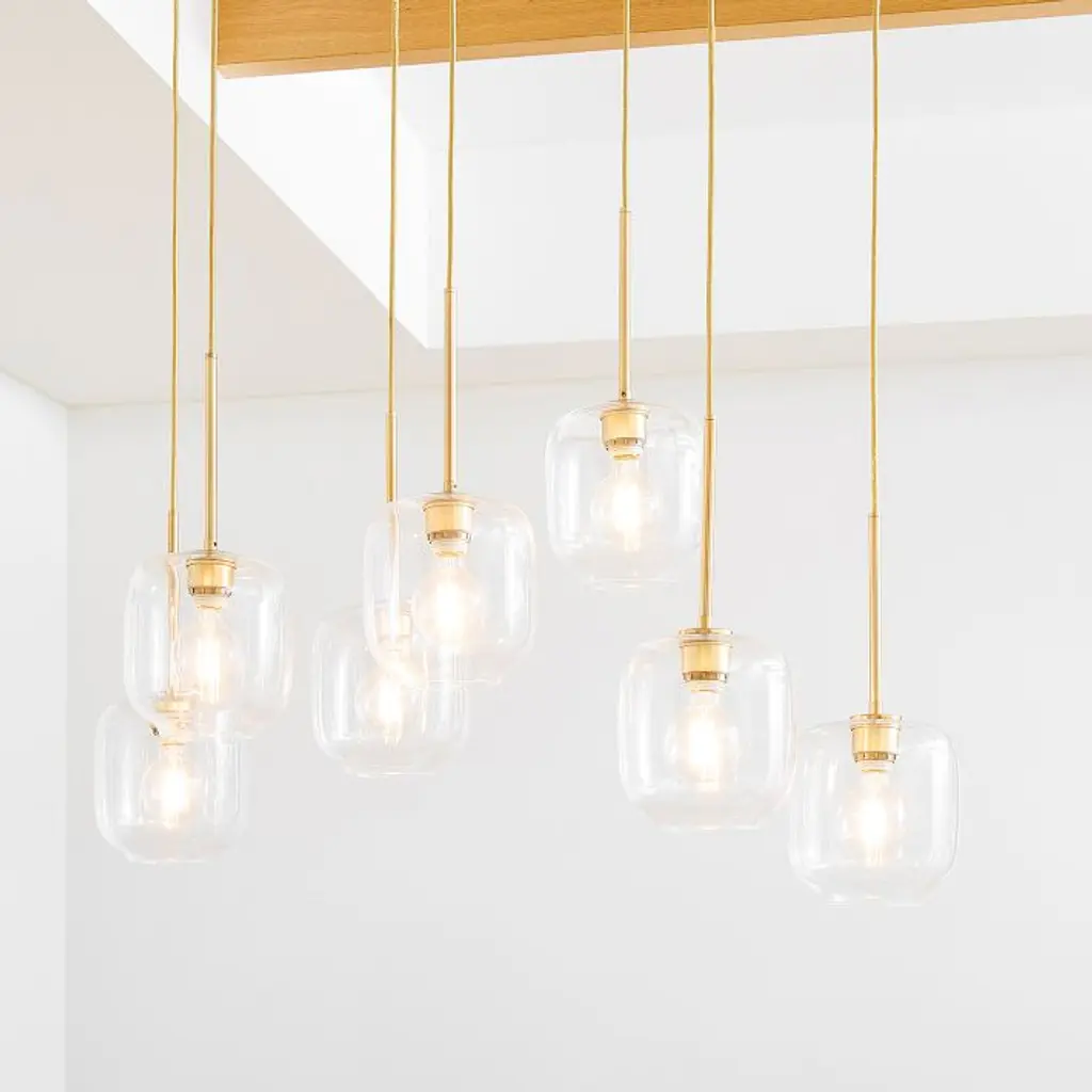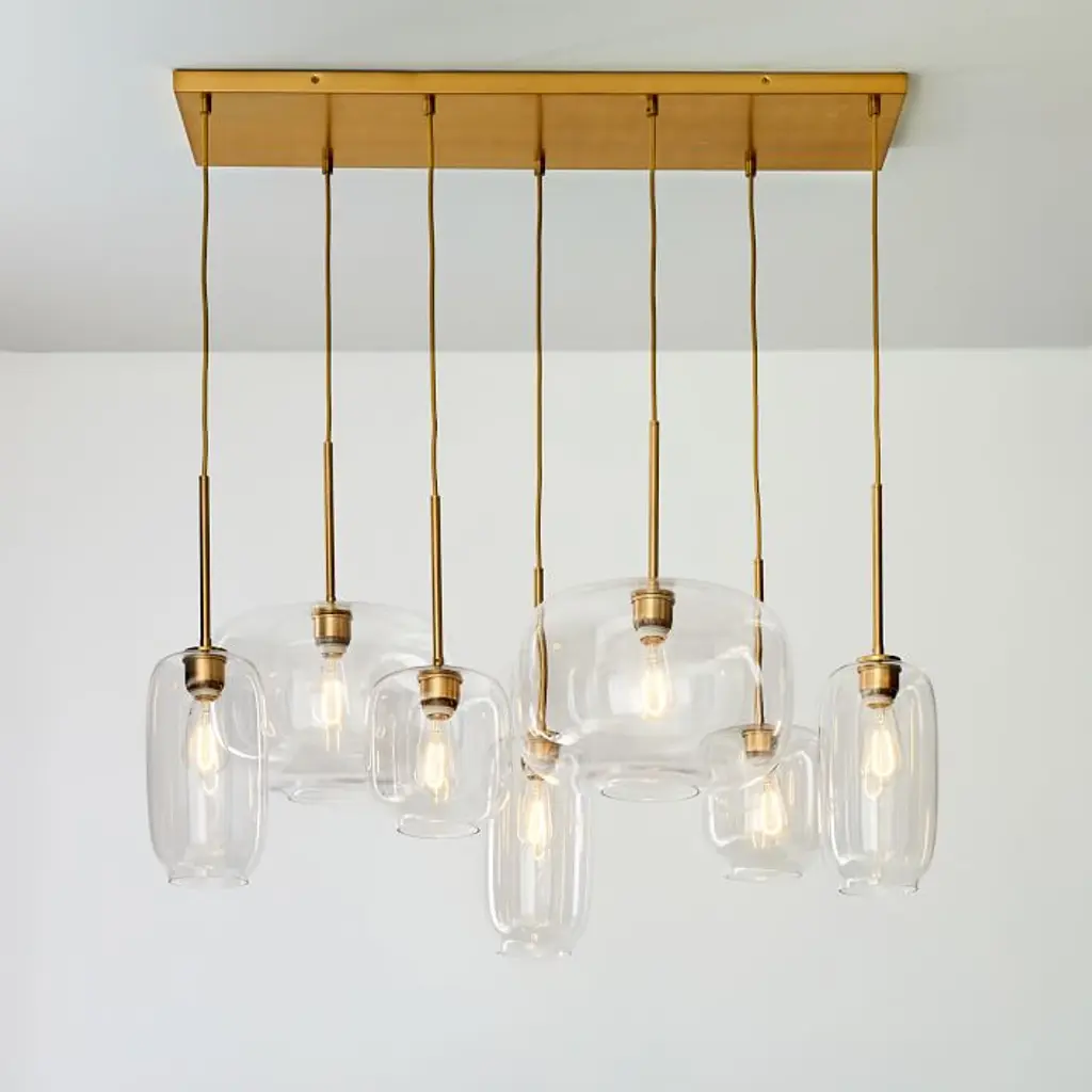 Metal canopy. Glass shades. Adjustable height. Hardwired. May be paired with dimmer switch (sold separately). Sold individually. UL listed. E26 socket. Accommodates seven 60W incandescent bulbs or LED equivalent. Make the switch to energy-efficient LED lighting. Learn more. Imported.