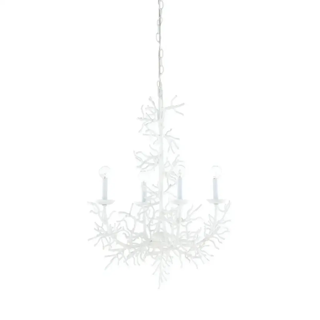 Sea breeze chandelier is a whimsical design inspired by the ocean coral. Crafted of iron with a white finish, this coastal themed ceiling light will provide direct light as well as bounce lighting in your room. Ideal for illuminating kitchens, entryways and living areas. Comes with 6' chain and 5.5" canopy.