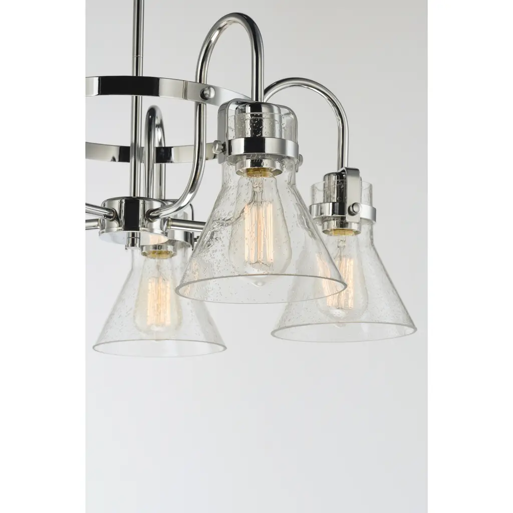This nautical-inspired collection features Clear Seedy glass cones suspended by a yoke frame. The clear glass offers abundant lighting and compliments the styling of the fixture. Make it a more industrial look by adding filament E26 light bulbs.