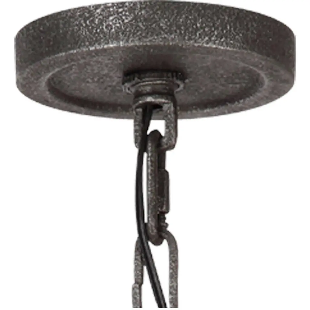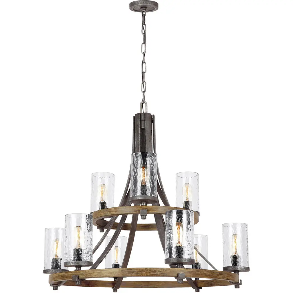 Influenced by both rustic and industrial design, the transitional Angelo chandelier collection by celebrates the beauty of imperfection and the visual impact of mixed materials to create an overall rugged look. The cylindrical Clear Thick Wavy glass shades complement the two-toned finish of Distressed Weathered Oak on the outer structures and a new pitted, richly textured Slated Grey Metal finish on the sloping arms for a rustic but tailored look. Perfect as foyer lighting, living room lighting, or paired over a dining room table, and the largest fixture will be the crowning touch to any great room.