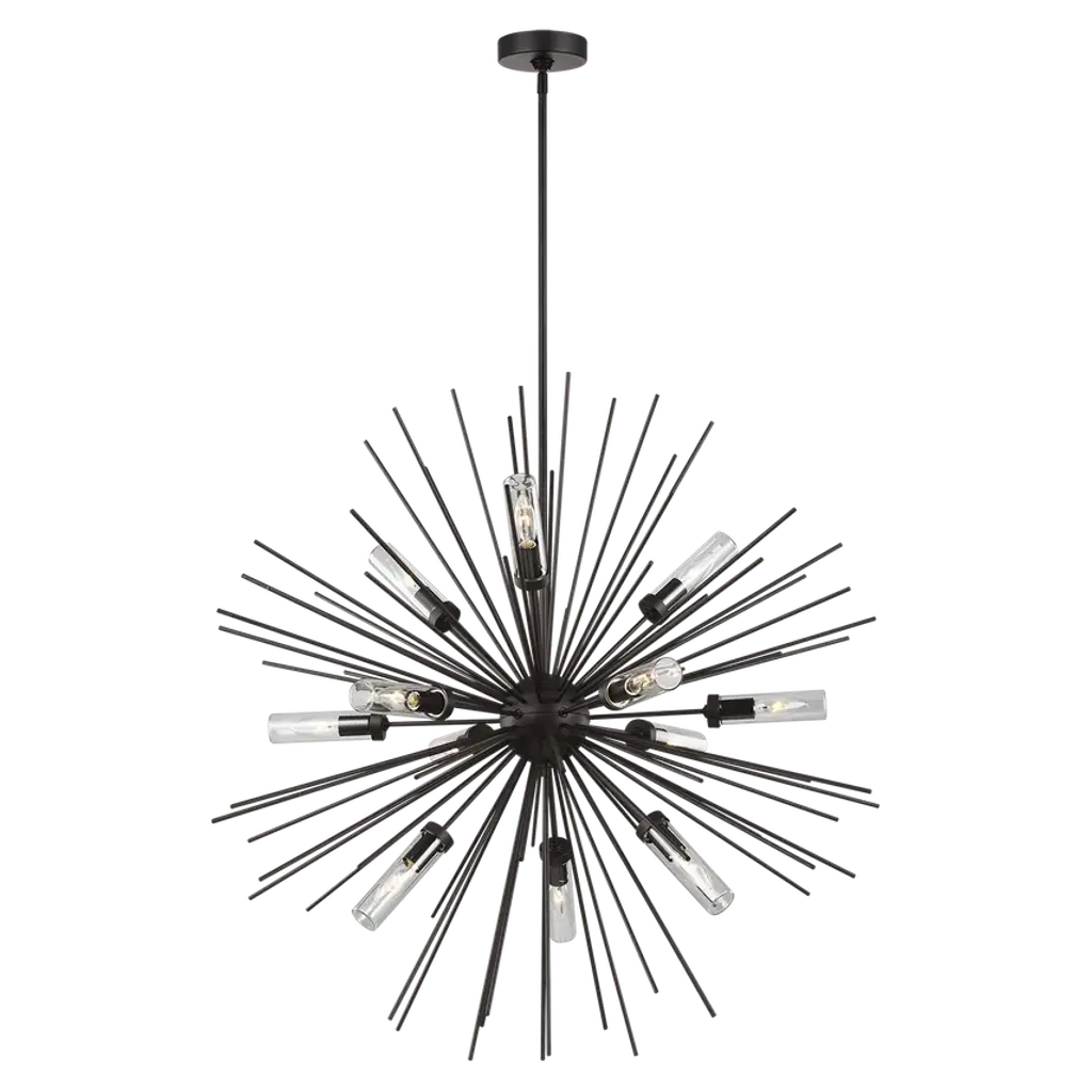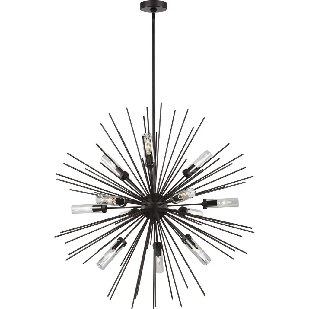 The Hilo, twelve outdoor light chandeliers in oil-rubbed bronze, enhances the beauty of your property, makes your home safer and more secure, and increases the number of pleasurable hours you spend outdoors. Hilo features slim metal arms extending from a center hub to create an organic globe silhouette. This damp-rated fixture is perfect for modernizing both indoor and covered outdoor spaces. Hilo uses candelabra bulbs covered in clear glass to protect from moisture. Designer: Sean Lavin Max Height: 77.5 Canopy: D:5'' H:1 1/8'' Round Shade/Glass: clear glass shades Lamping: 12 Torpedo Candelabra 60 watt light bulbs Voltage: 120 Bulb Included: No Safety Rating Location: damp Fixture Dimensions: D:36'' H:36'' Overall Height:77 1/2''